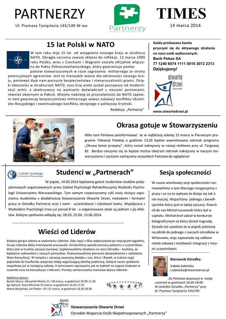 TIMES PARTNERZY 14 marca 2014 Ul. Prymasa Tysiąclecia 145/149 W-wa 15 lat Polski w NATO W tym roku mija 15 lat od wstąpienia naszego kraju w struktury NATO. Okrągła rocznica zawsze skłania do refleksji. 12 marca 1999 roku Polska, wraz z Czechami i Węgrami została oficjalnie włączona do Paktu Północnoatlantyckiego, który gwarantuje pomoc państw stowarzyszonych w razie zagrożenia militarnego ze strony potencjalnych agresorów. Jest to niezwykle ważne dla obronności naszego kraju, ponieważ daje nam poczucie bezpieczeństwa i nienaruszalności granic. Dzięki obecności w strukturach NATO, nasz kraj wiele zyskał począwszy od modernizacji armii, a skończywszy na wymianie doświadczeń z naszymi partnerami, również obecnymi w Pakcie. Miejmy nadzieję że przynależność do NATO zapewni nam gwarancję bezpieczeństwa militarnego wobec eskalacji konfliktu Ukraińsko-Rosyjskiego i ewentualnego konfliktu zbrojnego o półwysep Krymski. Redakcja: „Partnerzy” Każda przekazana kwota przyczyni się do aktywnego działania na rzecz osób wykluczonych. Bank Pekao SA 77 1240 6074 1111 0010 3072 2313 Dziękujemy! www.otwartedrzwi.pl Okrasa gotuje w Stowarzyszeniu Miło nam Państwa poinformować że w najbliższą sobotę 15 marca w Pierwszym programie Telewizji Polskiej o godzinie 13.05 będzie wyemitowany odcinek programu „Okrasa łamie przepisy”, który został nakręcony w naszej stołówce przy ul. Targowej 82 . Bardzo cieszymy się że będzie można obejrzeć odcinek nakręcony w naszym stowarzyszeniu i zarazem zachęcamy wszystkich Państwa do oglądania! Studenci w „Partnerach” W piątek, 14.03.2014 będziemy gościć studentów studiów podyplomowych organizowanych przez Zakład Psychologii Rehabilitacyjnej Wydziału Psychologii Uniwersytetu Warszawskiego. Tym samym rozpoczynamy cykl staży służący zapoznaniu studentów z działalnością Stowarzyszenia Otwarte Drzwi, metodami i formami pracy w Ośrodku Partnerzy oraz z nami - uczestnikami i członkami kadry. Współpraca z Wydziałem Psychologii trwa już ponad 8 lat - a organizowane staże są jednym z jej efektów. Kolejne spotkania odbędą się: 28.03, 25.04, 13.06.2014. Wieści od Liderów Kolejna gorąca sobota w wykonaniu Liderów. Gdy część z Was odpoczywała po męczącym tygodniu, Grupa Liderów dalej intensywnie pracowała. Omówiliśmy sposób pomocy jednemu z uczestników, który jest w trudnej sytuacji życiowej. Zaplanowaliśmy działania na rzecz Ośrodka - myślimy, że będziecie zadowoleni z naszych pomysłów. Podsumowaliśmy pierwsze doświadczenia z udzielania Wam konsultacji. W związku z sytuacją awaryjną dwójka z nas, Artur i Rysiek, w trakcie zajęć pojechała do Kauflandu wesprzeć ekipę organizującą zbiórkę publiczną. Kolejne nasze spotkanie zespołowe już w następną sobotę. A tymczasem zapraszamy jak co tydzień na zajęcia klubowe w czwartki oraz na konsultacje z liderami. Poniżej zamieszczamy marcowe dyżury liderów: Najbliższe dyżury: Bartek Mazur, Abczyński Marek-21 i 28 marca, w godzinach 10.00-11.30 Iga Jędrych, Kasia Mroczek-25 marca, w godzinach 16.45-17.45 Marta Abczyńska, Iza Piwko– 24 i 31 marca, w godzinach 16.30-18.00 Sesja społeczności W czasie wtorkowej sesji społeczności rozmawialiśmy o tym dlaczego rezygnujemy z pracy i co na to wpływa że dzieje się tak a nie inaczej. Wsparliśmy jednego z beneficjentów który jest w takiej sytuacji. Powrócił do nas Michał Łoszewski który był w szpitalu. Michał brał udział w konkursie fotograficznym za który dostał nagrodę. Zostało też ustalone że w piątek jedziemy na piknik do jednego z naszych ośrodków w Wilanowie, więc zapowiada się całkiem niezła zabawa i możliwość integracji z innymi uczestnikami. Kierownik Ośrodka: Izabela Zabielska [email protected] Do Państwa dyspozycji w każdy czwartek w godzinach 16.00-18.00 . W siedzibie Ośrodka „Partnerzy” przy Al. Prymasa Tysiąclecia 145/149. Stowarzyszenie Otwarte Drzwi Ośrodek Wsparcia Osób Niepełnosprawnych „Partnerzy” Kadra na szkoleniu 14 marca w siedzibie naszego Ośrodka na Woli odbyło się szkolenie w którym uczestniczyli: Aleksandra Kupczyk, Maciej Grudzień, Radosław Gołąb, Kamil Sontowski, Piotr Kurek, Tomasz Sadowski i Marek Zaboklicki. Szkolenie prowadził Pan Michał Furmankiewicz, informatyk z firmy Microsoft. Przedmiotem szkolenia była obsługa pakietu Office: Power Point, Access oraz Word. Pan Michał przeprowadził nas przez nieznane nam zakamarki programów w sposób łatwy i przystępny do opanowania. Dziękujemy za obecność i podzielenie się z nami swoją wiedzą. Kończymy szkolenie mądrzejsi o nowe umiejętności. Uczestnicy szkolenia Nowa współpraca Współpracę z Bursą nr 4 przy ul. Księcia Janusza 45/47 rozpoczęliśmy w marcu tego roku. Dzięki uprzejmości pana dyrektora Jakuba Czarkowskiego nasi beneficjenci mają tam możliwość odbycia praktyk na portierni, w kuchni i przy sprzątaniu. Na początku marca praktyki rozpoczęli Bartek Mazur i Agnieszka Kozakiewicz jako pomocnicy portiera oraz Piotr Borowski jako pomoc przy sprzątaniu. Od poniedziałku dołączyła do nich Ania Czubińska jako pomoc w kuchni. Wszyscy praktykanci spotkali się z bardzo ciepłym przyjęciem przez dyrektora i pracowników i pod ich okiem uczą się pracy w wybranym przez siebie zawodzie. Towarzyszy im też trener pracy Beata Urbańska, a obecnie Kamil Sontowski. Wszystkim praktykantom życzymy powodzenia i mamy nadzieję, że współpraca z Bursą będzie się rozwijała i kolejni beneficjenci będą mogli uczyć się tam pracy w bardzo przyjaznej atmosferze :) Opracowała: Beata Urbańska Zupa fasolowa z imbirem Składniki: 4łyżki oliwy z oliwek 1 średniej wielkości cebula, drobno pokrojona 3 ząbki czosnku, obrane i pokrojone kawałek imbiru (ok. 3 cm), starty na tarce 250 g fasoli - należy ją namoczyć na noc, następnego dnia ugotować do miękkości lub użyć fasoli z pus