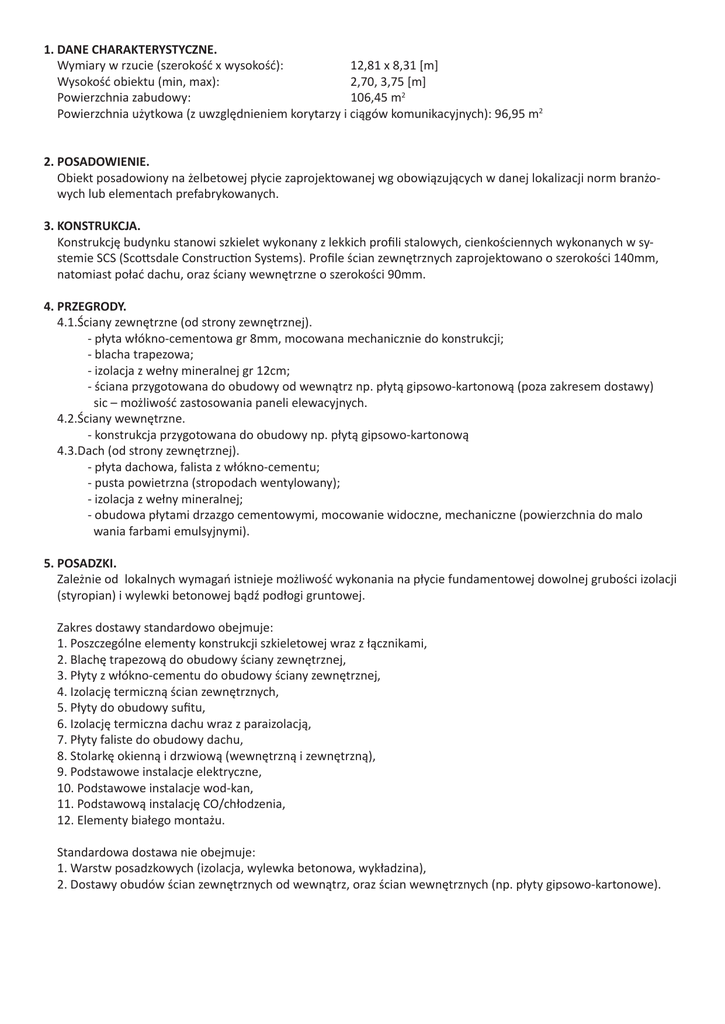 1. DANE CHARAKTERYSTYCZNE. Wymiary w rzucie (szerokość x wysokość): 12,81 x 8,31 [m] Wysokość obiektu (min, max): 2,70, 3,75 [m] Powierzchnia zabudowy: 106,45 m2 Powierzchnia użytkowa (z uwzględnieniem korytarzy i ciągów komunikacyjnych): 96,95 m2 2. POSADOWIENIE. Obiekt posadowiony na żelbetowej płycie zaprojektowanej wg obowiązujących w danej lokalizacji norm branżowych lub elementach prefabrykowanych. 3. KONSTRUKCJA. Konstrukcję budynku stanowi szkielet wykonany z lekkich profili stalowych, cienkościennych wykonanych w systemie SCS (Scottsdale Construction Systems). Profile ścian zewnętrznych zaprojektowano o szerokości 140mm, natomiast połać dachu, oraz ściany wewnętrzne o szerokości 90mm. 4. PRZEGRODY. 4.1.Ściany zewnętrzne (od strony zewnętrznej). - płyta włókno-cementowa gr 8mm, mocowana mechanicznie do konstrukcji; - blacha trapezowa; - izolacja z wełny mineralnej gr 12cm; - ściana przygotowana do obudowy od wewnątrz np. płytą gipsowo-kartonową (poza zakresem dostawy) sic – możliwość zastosowania paneli elewacyjnych. 4.2.Ściany wewnętrzne. - konstrukcja przygotowana do obudowy np. płytą gipsowo-kartonową 4.3.Dach (od strony zewnętrznej). - płyta dachowa, falista z włókno-cementu; - pusta powietrzna (stropodach wentylowany); - izolacja z wełny mineralnej; - obudowa płytami drzazgo cementowymi, mocowanie widoczne, mechaniczne (powierzchnia do malo wania farbami emulsyjnymi). 5. POSADZKI. Zależnie od lokalnych wymagań istnieje możliwość wykonania na płycie fundamentowej dowolnej grubości izolacji (styropian) i wylewki betonowej bądź podłogi gruntowej. Zakres dostawy standardowo obejmuje: 1. Poszczególne elementy konstrukcji szkieletowej wraz z łącznikami, 2. Blachę trapezową do obudowy ściany zewnętrznej, 3. Płyty z włókno-cementu do obudowy ściany zewnętrznej, 4. Izolację termiczną ścian zewnętrznych, 5. Płyty do obudowy sufitu, 6. Izolację termiczna dachu wraz z paraizolacją, 7. Płyty faliste do obudowy dachu, 8. Stolarkę okienną i drzwiową (wewnętrzną i zewnętrzną), 9. Podstawowe instalacje elektryczne, 10. Podstawowe instalacje wod-kan, 11. Podstawową instalację CO/chłodzenia, 12. Elementy białego montażu. Standardowa dostawa nie obejmuje: 1. Warstw posadzkowych (izolacja, wylewka betonowa, wykładzina), 2. Dostawy obudów ścian zewnętrznych od wewnątrz, oraz ścian wewnętrznych (np. płyty gipsowo-kartonowe).