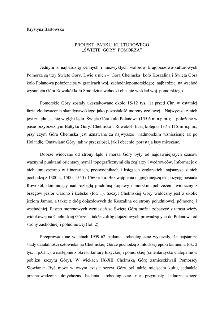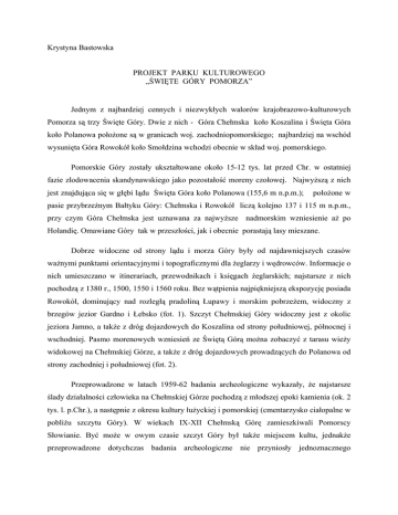 Krystyna Bastowska PROJEKT PARKU KULTUROWEGO „ŚWIĘTE GÓRY POMORZA” Jednym z najbardziej cennych i niezwykłych walorów krajobrazowo-kulturowych Pomorza są trzy Święte Góry. Dwie z nich - Góra Chełmska koło Koszalina i Święta Góra koło Polanowa położone są w granicach woj. zachodniopomorskiego; najbardziej na wschód wysunięta Góra Rowokół koło Smołdzina wchodzi obecnie w skład woj. pomorskiego. Pomorskie Góry zostały ukształtowane około 15-12 tys. lat przed Chr. w ostatniej fazie zlodowacenia skandynawskiego jako pozostałość moreny czołowej. Najwyższą z nich jest znajdująca się w głębi lądu Święta Góra koło Polanowa (155,6 m n.p.m.); położone w pasie przybrzeżnym Bałtyku Góry: Chełmska i Rowokół liczą kolejno 137 i 115 m n.p.m., przy czym Góra Chełmska jest uznawana za najwyższe nadmorskim wzniesienie aż po Holandię. Omawiane Góry tak w przeszłości, jak i obecnie porastają lasy mieszane. Dobrze widoczne od strony lądu i morza Góry były od najdawniejszych czasów ważnymi punktami orientacyjnymi i topograficznymi dla żeglarzy i wędrowców. Informacje o nich umieszczano w itinerariach, przewodnikach i księgach żeglarskich; najstarsze z nich pochodzą z 1380 r., 1500, 1550 i 1560 roku. Bez wątpienia najpiękniejszą ekspozycję posiada Rowokół, dominujący nad rozległą pradoliną Łupawy i morskim pobrzeżem, widoczny z brzegów jezior Gardno i Łebsko (fot. 1). Szczyt Chełmskiej Góry widoczny jest z okolic jeziora Jamno, a także z dróg dojazdowych do Koszalina od strony południowej, północnej i wschodniej. Pasmo morenowych wzniesień ze Świętą Górą można zobaczyć z tarasu wieży widokowej na Chełmskiej Górze, a także z dróg dojazdowych prowadzących do Polanowa od strony zachodniej i południowej (fot. 2). Przeprowadzone w latach 1959-62 badania archeologiczne wykazały, że najstarsze ślady działalności człowieka na Chełmskiej Górze pochodzą z młodszej epoki kamienia (ok. 2 tys. l. p.Chr.), a następnie z okresu kultury łużyckiej i pomorskiej (cmentarzysko ciałopalne w pobliżu szczytu Góry). W wiekach IX-XII Chełmską Górę zamieszkiwali Pomorscy Słowianie. Być może w owym czasie szczyt Góry był także miejscem kultu, jednakże przeprowadzone dotychczas badania archeologiczne nie przyniosły jednoznacznego 2 potwierdzenia tej tezy.1 Liczne źródła i zabytki archeologiczne potwierdziły ślady bytności człowieka na szczycie Rowokołu i w jego okolicy już w okresie neolitu; przypuszczenia o lokalizacji pogańskiej kąciny nie znalazły potwierdzenia na przebadanym dotąd obszarze wierzchołka góry.2 Natomiast wszelkie teorie o istnieniu ośrodka kultu pogańskiego na szczycie Świętej Góry w Polanowie do czasu przeprowadzenia profesjonalnych badań archeologicznych (dotąd nie prowadzono żadnych badań) można traktować jedynie jako wytwór wyobraźni. W świetle opisanego wyżej stanu badań, hipoteza o istnieniu na Górach ośrodków kultu przedchrześcijańskiego nadal pozostaje problemem otwartym. Do historii pomorskie Góry przeszły jednak przede wszystkim jako znane w całej średniowiecznej Europie pielgrzymkowe miejsca kultu Maryjnego. Przez około 400 lat – od XIII do XVI wieku, na ich szczytach znajdowały się kaplice poświęcone Najświętszej Maryi Pannie, do których przybywali liczni pątnicy. Kaplica na Chełmskiej Górze została przypuszczalnie wzniesiona w 1 połowie XIII wieku; kaplica na Rowokole na przełomie wieku XIV i XV, kaplica na Świętej Górze w wieku XIV. Brak materiałów źródłowych, zwłaszcza w odniesieniu do Góry Polanowskiej, nie pozwala na bliższe sprecyzowanie czasu powstania kaplicy. W okresie średniowiecza miejsca te odegrały ogromnie ważną rolę nie tylko w kontekście życia duchowego, pełniły bowiem również rolę czynnika miastotwórczego, sprzyjającego i stymulującego rozwój ośrodków miejskich i portowych. Dziś położenie Góry zwykliśmy określać względem miasta; w przeszłości było odwrotnie. W najstarszym znanym dokumencie z 1214 r. książę Bogusław II podarowuje klasztorowi premonstratersów z Białoboku „wieś” Koszalin położoną blisko „Góry Chełmskiej”, uznając tę ostatnią za miejsce bardziej znane (fot. 3).3 1 H. Janocha, Wyniki prac badawczych przeprowadzonych w latach 1959 i 1960 na Górze Chełmskiej (Krzyżance) koło Koszalina, cz. I, w: Materiały Zachodniopomorskie, t. XII, s. 383-469; cz. II, w: Materiały Zachodniopomorskie t. XX, Szczecin 1974, s. 31-167. 2 R. Kamiński, Kaplica NMP i cmentarz na Rowokole, w: „Tysiącletnie dziedzictwo chrześcijańskie Pomorza Środkowego”, Katalog Wystawy czerwiec-wrzesień 2000, Muzeum Okręgowe Koszalin, s. 60-64. 3 Podane w dalszej części artykułu informacje dotyczące historii Gór i pielgrzymowania podano m.in. na podstawie: K. Bastowska, Leksykon „Miejsca Święte Rzeczypospolitej” pod red. prof. A. Jackowskiego, Kraków 1999, s.51-53, 267-268, 312-313; N. Buske, Die Marienkapelle auf dem Gollen, dem Revekol und dem Heiligen Berg bei Polnow, w: Baltische Studien, 1970, R. XVI, s 17-40.; A Krüger, Der Wallfahrtsort St. Marien auf dem Gollen, eine itinerar und Kartenkundlichen Studie, w: Baltische Studien, 1960, R. XLVII, s. 65-70; B. Popielas Szultka, Z. Szultka, Sanktuarium Maryjne na Górze Chełmskiej, 1991 Słupsk; Wehrman M., Von einigen Wallfahrtsorten in Pommern, „Monatsblätter” nr 32, 1918; H. Heyden, Die letzten Wallfahrten in Pommern. w: Veröffentlichungen der historischen Kommission für Pommern, Reihe V, Helft 12, 1965; W. Łysiak, Średniowieczne pielgrzymki na Pomorzu Zachodnim. Mit i rzeczywistość. w: Chrześcijaństwo na Pomorzu w XXX wieku, Materiały pokonferencyjne pod red. J. Borzyszkowskiego, Gdańsk-Słupsk 2001, s. 145-165. 3 Największą sławą cieszyła się kaplica na Chełmskiej Górze, nad którą patronat sprawowały od 1278 r. do wieku XVI cysterki z Koszalina. Papież