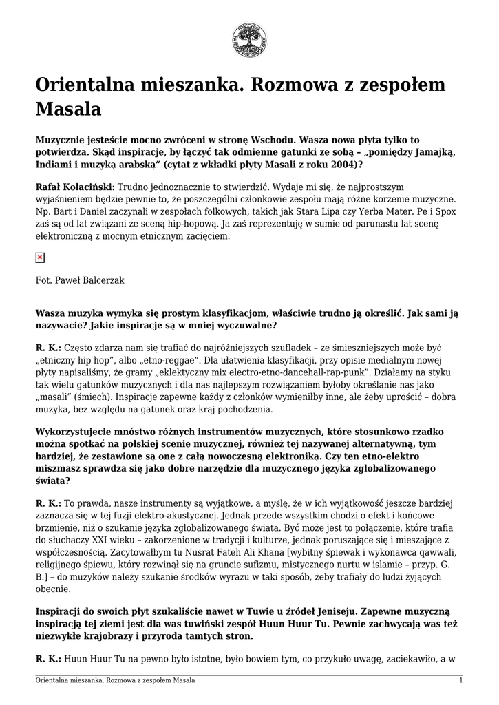 Orientalna mieszanka. Rozmowa z zespołem Masala Muzycznie jesteście mocno zwróceni w stronę Wschodu. Wasza nowa płyta tylko to potwierdza. Skąd inspiracje, by łączyć tak odmienne gatunki ze sobą – „pomiędzy Jamajką, Indiami i muzyką arabską” (cytat z wkładki płyty Masali z roku 2004)? Rafał Kolaciński: Trudno jednoznacznie to stwierdzić. Wydaje mi się, że najprostszym wyjaśnieniem będzie pewnie to, że poszczególni członkowie zespołu mają różne korzenie muzyczne. Np. Bart i Daniel zaczynali w zespołach folkowych, takich jak Stara Lipa czy Yerba Mater. Pe i Spox zaś są od lat związani ze sceną hip-hopową. Ja zaś reprezentuję w sumie od parunastu lat scenę elektroniczną z mocnym etnicznym zacięciem. Fot. Paweł Balcerzak Wasza muzyka wymyka się prostym klasyfikacjom, właściwie trudno ją określić. Jak sami ją nazywacie? Jakie inspiracje są w mniej wyczuwalne? R. K.: Często zdarza nam się trafiać do najróżniejszych szufladek – ze śmieszniejszych może być „etniczny hip hop”, albo „etno-reggae”. Dla ułatwienia klasyfikacji, przy opisie medialnym nowej płyty napisaliśmy, że gramy „eklektyczny mix electro-etno-dancehall-rap-punk”. Działamy na styku tak wielu gatunków muzycznych i dla nas najlepszym rozwiązaniem byłoby określanie nas jako „masali” (śmiech). Inspiracje zapewne każdy z członków wymieniłby inne, ale żeby uprościć – dobra muzyka, bez względu na gatunek oraz kraj pochodzenia. Wykorzystujecie mnóstwo różnych instrumentów muzycznych, które stosunkowo rzadko można spotkać na polskiej scenie muzycznej, również tej nazywanej alternatywną, tym bardziej, że zestawione są one z całą nowoczesną elektroniką. Czy ten etno-elektro miszmasz sprawdza się jako dobre narzędzie dla muzycznego języka zglobalizowanego świata? R. K.: To prawda, nasze instrumenty są wyjątkowe, a myślę, że w ich wyjątkowość jeszcze bardziej zaznacza się w tej fuzji elektro-akustycznej. Jednak przede wszystkim chodzi o efekt i końcowe brzmienie, niż o szukanie języka zglobalizowanego świata. Być może jest to połączenie, które trafia do słuchaczy XXI wieku – zakorzenione w tradycji i kulturze, jednak poruszające się i mieszające z współczesnością. Zacytowałbym tu Nusrat Fateh Ali Khana [wybitny śpiewak i wykonawca qawwali, religijnego śpiewu, który rozwinął się na gruncie sufizmu, mistycznego nurtu w islamie – przyp. G. B.] – do muzyków należy szukanie środków wyrazu w taki sposób, żeby trafiały do ludzi żyjących obecnie. Inspiracji do swoich płyt szukaliście nawet w Tuwie u źródeł Jeniseju. Zapewne muzyczną inspiracją tej ziemi jest dla was tuwiński zespół Huun Huur Tu. Pewnie zachwycają was też niezwykłe krajobrazy i przyroda tamtych stron. R. K.: Huun Huur Tu na pewno było istotne, było bowiem tym, co przykuło uwagę, zaciekawiło, a w Orientalna mieszanka. Rozmowa z zespołem Masala 1 konsekwencji pchnęło w stronę nauki technik śpiewu gardłowego. Idąc dalej tym tropem – kilka lat później Bartek i Daniel pojechali do źródeł tego śpiewu, żeby go tam poszukać... i okazało się że nie jest to takie proste, żeby go znaleźć. Ale chłopaki szukali i znaleźli. Sądzę, że ogromna wolna przestrzeń jest integralną częścią tego śpiewu. Kiedy Tuwińcy śpiewali, często jechali konno, stąd tak mocno wyczuwalny jest ten „koński rytm” w ich muzyce. Podobnie echo i ogromny pogłos pomagają wytrącać się alikwotom, więc pod względem akustycznym ten odległy step, góry i doliny są wręcz wymarzonym miejscem dla takiej muzyki. W piosence „Cały ten świat” pojawiają się słowa „Tam, gdzie pojawił się człowiek, została tylko spalona ziemia”. Żyjemy w czasach nieustannych konfliktów lokalnych, wojen, zatrważającej eksploatacji zasobów planety. Mimo coraz nowocześniejszych urządzeń, doskonalszej komunikacji, nauki na coraz wyższym poziomie – ilość problemów wciąż rośnie... Gdzie tkwi przyczyna takiego stanu rzeczy? R. K.: Eksploatacja Ziemi i rozwój człowieka idą parze. Przez setki lat nikt nie zadał sobie pytania – co się stanie, gdy nie będzie już drzew do wycięcia, albo co się stanie, gdy zatrujemy wszystkie wody. Ponadto w naszych czasach nietrudno o konflikt, gdyż coraz bardziej dotkliwe i coraz bardziej wyraźne są dysproporcje między bogactwem a ubóstwem. Dopóki człowiek nie wie, że może być inaczej i nie ma możliwości porównania swojego życia z innym – nie będzie się buntował. Obecnie dużo łatwiej jest mieć takie porównanie – wystarczy często zmieniać dzielnicę, włączyć telewizję albo spojrzeć w Internet. Nie łudźmy się, że to wszystko niebawem się zmieni. Jeśli nawet kraje rozwinięte będą ograniczały negatywne wpływy na środowisko, to reszta „biednego świata” nawet o tym nie myśli lub nie może sobie na to pozwolić. Słuchając waszych tekstów da się wyczuć mocno antywojenny przekaz oraz wiarę w to, że świat bez przemocy jest możliwy... Przewodzi wam hasło „Jeden świat – wiele kultur!”. R. K.: Oczywiście jak najbardziej się z nim identyfikujemy. Od samego początku naszej działalności posługiwaliśmy się hasłem „Porozumienie ponad podziałami”, które oddawało naszą istotę wręcz perfekcyjnie. Zależało nam na tym, żeby zebrać razem ludzi z różnych środowisk, różnych kultur i razem działać. Jest oczywiście warstwa muzyczna, ale jest i słowo, które w przypadku Masali jest bardzo istotne. Nie jestem jednak idealistą i wiem, że nie będzie świata bez wojen i walki – nigdy go nie było, dlaczego zatem nagle miałoby się to drastycznie zmienić? Dopóki będzie o co walczyć, dopóki będzie po co napadać na inne kraje – wojny będą. Czysta kalkulacja i ekonomia dają już wystarczające preteksty do tego, że wojna komuś popłaca. Fot. Paweł Balcerzak W waszych tekstach 