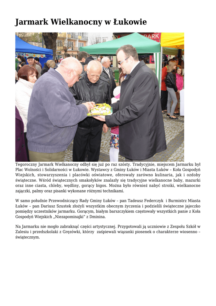 Jarmark Wielkanocny w Łukowie Tegoroczny Jarmark Wielkanocny odbył się już po raz szósty. Tradycyjnie, miejscem Jarmarku był Plac Wolności i Solidarności w Łukowie. Wystawcy z Gminy Łuków i Miasta Łuków – Koła Gospodyń Wiejskich, stowarzyszenia i placówki oświatowe, oferowały zarówno kulinaria, jak i ozdoby świąteczne. Wśród świątecznych smakołyków znalazły się tradycyjne wielkanocne baby, mazurki oraz inne ciasta, chleby, wędliny, gorący bigos. Można było również nabyć stroiki, wielkanocne zajączki, palmy oraz pisanki wykonane różnymi technikami. W samo południe Przewodniczący Rady Gminy Łuków – pan Tadeusz Federczyk i Burmistrz Miasta Łuków – pan Dariusz Szustek złożyli wszystkim obecnym życzenia i podzielili świąteczne jajeczko pomiędzy uczestników jarmarku. Gorącym, białym barszczykiem częstowały wszystkich panie z Koła Gospodyń Wiejskich „Niezapominajki” z Dminina. Na Jarmarku nie mogło zabraknąć części artystycznej. Przygotowali ją uczniowie z Zespołu Szkół w Zalesiu i przedszkolaki z Gręzówki, którzy zaśpiewali wiązanki piosenek o charakterze wiosenno – świątecznym.