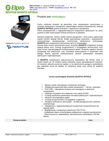 Elpro.com.pl: ul. Legionów 93/95, 91-072 Łódź www: www.elpro.com.pl e-mail: [email protected] tel: (42) 664-06-00 NOVITUS QUARTO APTEKA Produkt jest niedostępny Cechy użytkowe drukarki, jej parametry oraz zastosowane nowoczesne, a zarazem sprawdzone rozwiązania zapewniające wysoką niezawodność, plasują QUARTO APTEKA pośród drukarek o najwyższym standardzie. Pełna kompatybilność z najpopularniejszymi programami aptecznymi na rynku pozwoli w pełni wykorzystać funkcje konieczne w aptekach. Kategorie Drukarki apteczne Wysoka wydajność, bardzo szybki wydruk paragonów i cicha praca zapewniają wysoki komfort obsługi klienta. Dzięki optymalizacji wydruków i zastosowaniu nowoczesnego, dwustacyjnego, termicznego mechanizmu drukującego QUARTO jest urządzeniem stosunkowo tanim w eksploatacji. Pośród wielu funkcji oferowanych przez drukarkę QUARTO znajdziemy funkcję obsługi waluty euro, funkcję przypominania o przeglądach technicznych oraz wiele innych usprawniających funkcjonowanie apteki. Drukarka wspiera również akceptację kart płatniczych oraz umożliwia wykorzystanie w systemach kart stałego klienta poprzez zaawansowane wydruki potwierdzeń transakcji płatniczych i lojalnościowych. W QUARTO zastosowano alfanumeryczny wyświetlacz dla klienta, który w dwóch liniach po 16 znaków każda wyświetla nazwy sprzedawanych towarów, ich wartość, aktualną sumę do zapłaty, a na zakończenie paragonu wyświetlana jest całkowita suma do zapłaty za zakupiony towar oraz resztę do wydania klientowi Cechy wyróżniające drukarkę QUARTO APTEKA - Bardzo szybki, dwustacyjny mechanizm drukujący - Wyjątkowa pojemność bazy kodów towarowych – 150 tys. artykułów - Port USB – najczęściej używany port szeregowy w obecnych komputerach - Obsługa wszystkich form płatności oraz waluty EURO - Funkcja wydruków potwierdzeń transakcji płatniczych i lojalnościowych - Wydruki oszczędzające papier - Funkcja przypominania o przeglądzie urządzenia - Wydajny wewnętrzny akumulator – do 800 paragonów bez zasilania zewnętrznego - Współpraca z najpopularniejszymi programami komputerowymi do obsługi aptek - Współpracuje z programem płatniczym CELTO S1 - Dodatkowe złącza umożliwiające podłączenie urządzeń peryferyjnych - Alfanumeryczny, podświetlany, dwuwierszowy wyświetlacz LCD dla klienta Wersja produktu Projekt i wykonanie wydruku: Logisoft Cena http://www.logisoft.pl/ +48 42 235 41 51 Strona 1 z 2 DANE TECHNICZNE NAZWA QUARTO Apteka TYP DRUKARKI FISKALNEJ Stacjonarna PRZEZNACZENIE Apteki i hurtownie farmaceutyczne LICZBA PROGRAMOWANYCH TOWARÓW 150 000 STAWKI PODATKOWE 7 LICZBA ZNAKÓW W NAZWIE TOWARU 40 NOŚNIK KOPII ELEKTRONICZNEJ Brak MECHANIZM DRUKUJĄCY Dwustacyjna drukarka termiczna CITIZEN LT 483 SZEROKOŚĆ PAPIERU 2 x 49 mm KLAWIATURA Membranowa LICZBA KLAWISZY 9 WYŚWIETLACZ OBSŁUGI Alfanumeryczny, LCD, 2 x 20 znaków WYŚWIETLACZ KLIENTA Alfanumeryczny, wysuwany, obrotowy, podświetlany, niebieski LCD, 2 x 16 znaków INTERFEJSY 3 x RS232 + 1 x USB URZĄDZENIA WSPÓŁPRACUJĄCE Komputer, terminal EFT , PinPad, czytnik kart magnetycznych, skaner, modem, szuflada ZASILANIE ZEWNĘTRZNE 230 V, zasilacz zewnętrzny ZASILANIE WEWNĘTRZNE Wbudowany akumulator GABARYTY (szer. x dł. x wys.) 173 x 310 x 190 mm WAGA 4,5 kg Projekt i wykonanie wydruku: Logisoft Powered by TCPDF (www.tcpdf.org) http://www.logisoft.pl/ +48 42 235 41 51 Strona 2 z 2