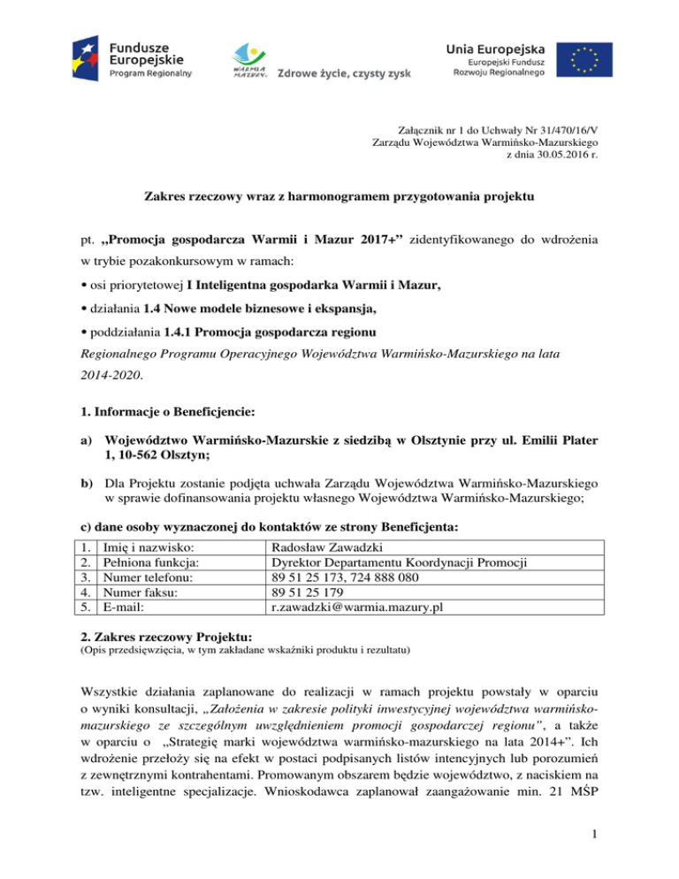 Załącznik nr 1 do Uchwały Nr 31/470/16/V Zarządu Województwa Warmińsko-Mazurskiego z dnia 30.05.2016 r. Zakres rzeczowy wraz z harmonogramem przygotowania projektu pt. „Promocja gospodarcza Warmii i Mazur 2017+” zidentyfikowanego do wdrożenia w trybie pozakonkursowym w ramach: • osi priorytetowej I Inteligentna gospodarka Warmii i Mazur, • działania 1.4 Nowe modele biznesowe i ekspansja, • poddziałania 1.4.1 Promocja gospodarcza regionu Regionalnego Programu Operacyjnego Województwa Warmińsko-Mazurskiego na lata 2014-2020. 1. Informacje o Beneficjencie: a) Województwo Warmińsko-Mazurskie z siedzibą w Olsztynie przy ul. Emilii Plater 1, 10-562 Olsztyn; b) Dla Projektu zostanie podjęta uchwała Zarządu Województwa Warmińsko-Mazurskiego w sprawie dofinansowania projektu własnego Województwa Warmińsko-Mazurskiego; c) dane osoby wyznaczonej do kontaktów ze strony Beneficjenta: 1. 2. 3. 4. 5. Imię i nazwisko: Pełniona funkcja: Numer telefonu: Numer faksu: E-mail: Radosław Zawadzki Dyrektor Departamentu Koordynacji Promocji 89 51 25 173, 724 888 080 89 51 25 179 [email protected] 2. Zakres rzeczowy Projektu: (Opis przedsięwzięcia, w tym zakładane wskaźniki produktu i rezultatu) Wszystkie działania zaplanowane do realizacji w ramach projektu powstały w oparciu o wyniki konsultacji, „Założenia w zakresie polityki inwestycyjnej województwa warmińskomazurskiego ze szczególnym uwzględnieniem promocji gospodarczej regionu”, a także w oparciu o „Strategię marki województwa warmińsko-mazurskiego na lata 2014+”. Ich wdrożenie przełoży się na efekt w postaci podpisanych listów intencyjnych lub porozumień z zewnętrznymi kontrahentami. Promowanym obszarem będzie województwo, z naciskiem na tzw. inteligentne specjalizacje. Wnioskodawca zaplanował zaangażowanie min. 21 MŚP 1 w wybrane działania w ramach projektu. A określone przedsięwzięcia realizowane będą przy wykorzystaniu mediów o zasięgu ogólnokrajowym i międzynarodowym. Planowane działania (konkretne kategorie kosztu zostaną doprecyzowane na etapie tworzenia studium wykonalności) 1) Studium wykonalności Projektu 2) Broszury - materiały w języku polskim oraz angielskim, zawierające strategiczne informacje dotyczące regionu. Materiały w wersji papierowej, jak i elektronicznej (interaktywne). Będą przekazywane uczestnikom podczas konferencji, misji gospodarczych, spotkań z potencjalnymi inwestorami; 3) Kampania medialna (planowana minimalna liczba rodzajów kanałów komunikacji: Internet, prasa, radio; w ramach zadania przewidziano przeprowadzenie ewaluacji działań) - kampania medialna w Internecie - skierowana do wybranych krajów Unii Europejskiej, państw Europy nie należących do UE oraz spoza Europy; kampania medialna w prasie o zasięgu ogólnopolskim (z wyłączeniem prasy ukazującej się wyłącznie na terenie województwa warmińsko-mazurskiego) - kampania informacyjna, której zadaniem będzie zbudowanie wizerunku regionu, jako miejsca atrakcyjnego dla inwestorów; kampania medialna w radiu o zasięgu ogólnopolskim (z wyłączeniem radia o zasięgu ograniczonym wyłącznie do terenu województwa warmińsko-mazurskiego) kampania informacyjna, której zadaniem będzie zbudowanie wizerunku regionu jako miejsca atrakcyjnego dla inwestorów; ewaluacja działań – przeprowadzenie badań wizerunkowych przed i po kampanii; 4) Organizacja konferencji i wydarzeń promocyjnych a) Konferencja promująca województwo warmińsko-mazurskie b) Otwarci na Skandynawię - wydarzenie, w którym przedstawiciele firm skandynawskich oraz instytucji biznesowych zainteresowani podjęciem współpracy z partnerami z Warmii i Mazur, zostaną zaznajomieni z ofertą gospodarczą województwa. W ramach tego przedsięwzięcia odbędą się spotkania B2B pomiędzy przedstawicielami MŚP z regionu a reprezentantami podmiotów z zaproszonych krajów. Działania te sprzyjać będą nawiązaniu bezpośrednich kontaktów handlowych z jak najszerszym kręgiem przedsiębiorców, wymianie informacji, wzajemnemu rekomendowaniu swoich usług; c) Festiwal Promocji Gospodarczej - dwudniowe wydarzenie dedykowane przedstawicielom samorządów lokalnych odpowiedzialnym za promocję gospodarczą gmin województwa warmińsko-mazurskiego, szeroko rozumianym instytucjom otoczenia biznesu, przedsiębiorcom (w tym przedstawicielom inteligentnych specjalizacji), a także ekspertom z dziedziny promocji miejsc, obsługi i pozyskiwania inwestorów. Celem Festiwalu jest utworzenie swojego rodzaju platformy komunikacyjnej, think-tanku i forum, na którym swoją wiedzą i doświadczeniami z zakresu promocji gospodarczej będą mogli podzielić się zarówno eksperci, jak i przedstawiciele samorządów, instytucji otoczenia biznesu oraz zaproszonych firm. W programie Festiwalu znajdą się m.in. prelekcje, prezentacje dobrych praktyk, dyskusje i warsztaty. 5) Misje przyjazdowe przedsiębiorców - wizyty studyjne przedstawicieli przedsiębiorstw z krajów skandynawskich, Niemiec oraz Austrii w siedzibach lokalnych MŚP. Spotkania 2 będą miały charakter informacyjno-promocyjny. Przyczynią się do wypromowania przedsiębiorstw, nawiązania relacji biznesowych, handlowych z partnerami oraz promocji inwestycyjnej województwa; 6) Gospodarczy Ambasador Warmii i Mazur (GAWiM) - będzie to wybrany podmiot merytorycznie i organizacyjnie przygotowany do promocji gospodarczej województwa warmińsko-mazurskiego, szczególnie w kontekście poszukiwania potencjalnych inwestorów zagranicznych, ewentualnie zainteresowanych lokowaniem procesów biznesowych na terenie regionu. Jego zadaniem będzie stworzenie odpowiedniego klimatu i przychylnego nastawienia do inwestycji na terenie województwa warmińskomazurskiego, prowadzenie działań informacyjnych i edukacyjnych w ramach kampanii lobbingowej. Grupę docelową działania GAWiM stanowić będą przedsiębiorcy z zagranicy, realnie zainteresowani inwestycjami poza 
