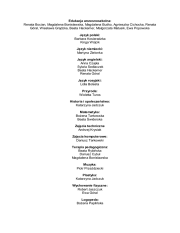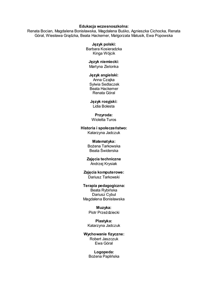 Edukacja wczesnoszkolna: Renata Bocian, Magdalena Bonisławska, Magdalena Buśko, Agnieszka Cichocka, Renata Góral, Wiesława Grądzka, Beata Hackemer, Małgorzata Matusik, Ewa Popowska Język polski: Barbara Kosieradzka Kinga Wójcik Język niemiecki: Martyna Zielonka Język angielski: Anna Czajka Sylwia Sedlaczek Beata Hackemer Renata Góral Język rosyjski: Lidia Bolesta Przyroda: Wioletta Turos Historia i społeczeństwo: Katarzyna Jadczuk Matematyka: Bożena Tarkowska Beata Świderska Zajęcia techniczne Andrzej Krysiak Zajęcia komputerowe: Dariusz Tarkowski Terapia pedagogiczna: Beata Rybińska Dariusz Cybul Magdalena Bonisławska Muzyka: Piotr Przeździecki Plastyka: Katarzyna Jadczuk Wychowanie fizyczne: Robert Jaszczuk Ewa Góral Logopeda: Bożena Paplińska Religia: Bożena Zdzieborska Hanna Grochowska Gimnastyka korekcyjna: Ewa Góral Pedagog szkolny: Magdalena Bonisławska Świetlica szkolna: Beata Świderska Dariusz Cybul Adam Czesławiak Lidia Bolesta Barbara Kosieradzka Wiesława Grądzka Małgorzata Matusik Biblioteka szkolna: Anna Andrzejewska Katarzyna Jadczuk Nauczyciel wspomagający: Katarzyna Bojar Maria Rosocha