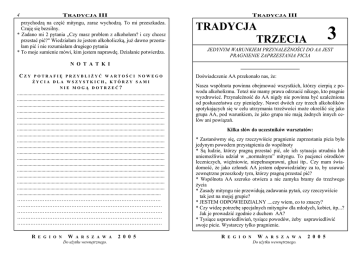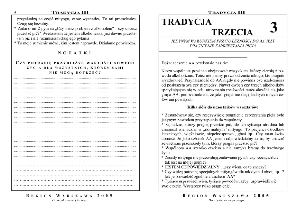 4 TRADYCJA III przychodzą na część mityngu, zaraz wychodzą. To mi przeszkadza. Czuję się bezsilny. * Zadano mi 2 pytania „Czy masz problem z alkoholem? i czy chcesz przestać pić?" Wiedziałam że jestem alkoholiczką, już dawno przestałam pić i nie rozumiałam drugiego pytania * To moje sumienie mówi, kim jestem naprawdę. Działanie potwierdza. TRADYCJA III TRADYCJA TRZECIA JEDYNYM WARUNKIEM PRZYNALEŻNOŚCI DO AA JEST PRAGNIENIE ZAPRZESTANIA PICIA N O T A T K I CZY _______________________ POTRAFIĘ PRZYBLIŻYĆ WARTOŚCI NOWEGO ŻYCIA DLA WSZYSTKICH, KTÓRZY SAMI NIE MOGĄ DOTRZEĆ? ................................................................................................................... ................................................................................................................... ................................................................................................................... ................................................................................................................... ................................................................................................................... ................................................................................................................... ................................................................................................................... ................................................................................................................... ................................................................................................................... ................................................................................................................... ................................................................................................................... ................................................................................................................... ................................................................................................................... ................................................................................................................... ................................................................................................................... ................................................................................................................... ................................................................................................................... ................................................................................................................ ………………………………………………………………………… …….…………………………………………………………………… …………………………………………………………………………. …….…………………………………………………………………… …….…………………………………………………………………… R E G I O N W A R S Z A W A Do użytku wewnętrznego. 3 2 0 0 5 Doświadczenie AA przekonało nas, że: Nasza wspólnota powinna obejmować wszystkich, którzy cierpią z powodu alkoholizmu. Toteż nie mamy prawa odrzucić nikogo, kto pragnie wyzdrowieć. Przynależność do AA nigdy nie powinna być uzależniona od posłuszeństwa czy pieniędzy. Nawet dwóch czy trzech alkoholików spotykających się w celu utrzymania trzeźwości może określić się jako grupa AA, pod warunkiem, że jako grupa nie mają żadnych innych celów ani powiązań. Kilka słów do uczestników warsztatów: * Zastanówmy się, czy rzeczywiście pragnienie zaprzestania picia było jedynym powodem przystąpienia do wspólnoty * Są ludzie, którzy pragną przestać pić, ale ich sytuacja utrudnia lub uniemożliwia udział w „normalnym” mityngu. To pacjenci ośrodków leczniczych, więźniowie, niepełnosprawni, głusi itp.. Czy mam świadomość, że jako członek AA jestem odpowiedzialny za to, by usuwać zewnętrzne przeszkody tym, którzy pragną przestać pić? * Wspólnota AA szeroko otwiera a nie zamyka bramy do trzeźwego życia * Zasady mityngu nie przewidują zadawania pytań, czy rzeczywiście tak jest na mojej grupie? * JESTEM ODPOWIEDZIALNY ....czy wiem, co to znaczy? * Czy widzę potrzebę specjalnych mityngów dla młodych, kobiet, itp...? Jak je prowadzić zgodnie z duchem AA? * Tysiące usprawiedliwień, tysiące powodów, żeby usprawiedliwić swoje picie. Wystarczy tylko pragnienie. R E G I O N W A R S Z A W A Do użytku wewnętrznego. 2 0 0 5 2 TRADYCJA III KILKA MYŚLI Z NASZEJ LITERATURY ______________ * Tragedią naszego życia jest to, jak głęboko musimy cierpieć, nim nauczymy się prostych prawd, według których należy żyć. "Anonimowi Alkoholicy wkraczają w dojrzałość" str.331 * To ty sam decydujesz, czy należysz do AA. Nieważne kim jesteś i jak nisko upadłeś. Nie jest istotne, jak bardzo pogmatwane jest twe życie wewnętrzne; także cię nie odrzucimy. 12x12 str. 139 * Chcemy po prostu, byś miał tę samą wspaniałą szansę osiągnięcia trzeźwości, z jakiej my już skorzystaliśmy. Tak więc stajesz się członkiem AA dokładnie w chwili, gdy zadeklarujesz chęć przynależności. 12x12 str. 139 * Któż odważy się być sędzią, ławnikiem i katem cierpiących 12x12 str. 141 współbraci? * I tak oto już na samym początku ręka opatrzności wskazała nam, że każdy alkoholik zostaje członkiem wspólnoty wtedy, kiedy on sam to zadeklaruje. 12x12 str. 145 * Żaden Anonimowy Alkoholik nie może zmusić drugiego do czegokolwiek, nikt nie może być karany albo wykluczony ze wspólnoty. JTWB str. 134 * Kiedy więc opuściwszy te mury wkroczycie w świat AA na zewnątrz, możecie być pewni, że żadnemu z naszych uczestników nie będzie przeszkadzać to, że odsiadywaliście wyrok. Dla nas licz