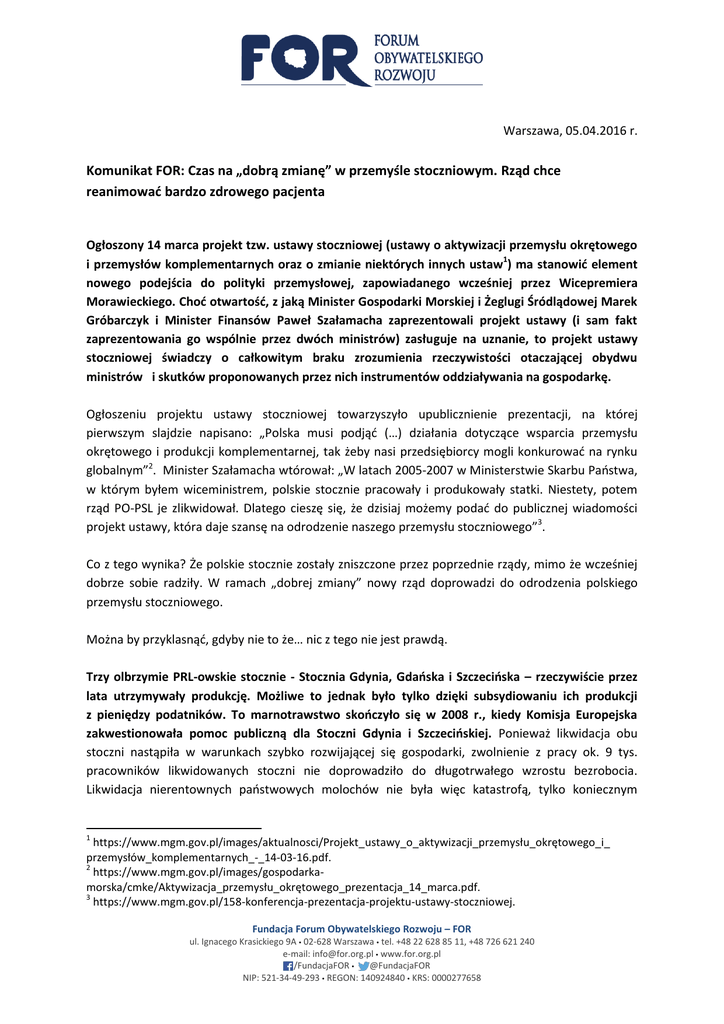 Warszawa, 05.04.2016 r. Komunikat FOR: Czas na „dobrą zmianę” w przemyśle stoczniowym. Rząd chce reanimować bardzo zdrowego pacjenta Ogłoszony 14 marca projekt tzw. ustawy stoczniowej (ustawy o aktywizacji przemysłu okrętowego i przemysłów komplementarnych oraz o zmianie niektórych innych ustaw1) ma stanowić element nowego podejścia do polityki przemysłowej, zapowiadanego wcześniej przez Wicepremiera Morawieckiego. Choć otwartość, z jaką Minister Gospodarki Morskiej i Żeglugi Śródlądowej Marek Gróbarczyk i Minister Finansów Paweł Szałamacha zaprezentowali projekt ustawy (i sam fakt zaprezentowania go wspólnie przez dwóch ministrów) zasługuje na uznanie, to projekt ustawy stoczniowej świadczy o całkowitym braku zrozumienia rzeczywistości otaczającej obydwu ministrów i skutków proponowanych przez nich instrumentów oddziaływania na gospodarkę. Ogłoszeniu projektu ustawy stoczniowej towarzyszyło upublicznienie prezentacji, na której pierwszym slajdzie napisano: „Polska musi podjąć (…) działania dotyczące wsparcia przemysłu okrętowego i produkcji komplementarnej, tak żeby nasi przedsiębiorcy mogli konkurować na rynku globalnym”2. Minister Szałamacha wtórował: „W latach 2005-2007 w Ministerstwie Skarbu Państwa, w którym byłem wiceministrem, polskie stocznie pracowały i produkowały statki. Niestety, potem rząd PO-PSL je zlikwidował. Dlatego cieszę się, że dzisiaj możemy podać do publicznej wiadomości projekt ustawy, która daje szansę na odrodzenie naszego przemysłu stoczniowego”3. Co z tego wynika? Że polskie stocznie zostały zniszczone przez poprzednie rządy, mimo że wcześniej dobrze sobie radziły. W ramach „dobrej zmiany” nowy rząd doprowadzi do odrodzenia polskiego przemysłu stoczniowego. Można by przyklasnąć, gdyby nie to że… nic z tego nie jest prawdą. Trzy olbrzymie PRL-owskie stocznie - Stocznia Gdynia, Gdańska i Szczecińska – rzeczywiście przez lata utrzymywały produkcję. Możliwe to jednak było tylko dzięki subsydiowaniu ich produkcji z pieniędzy podatników. To marnotrawstwo skończyło się w 2008 r., kiedy Komisja Europejska zakwestionowała pomoc publiczną dla Stoczni Gdynia i Szczecińskiej. Ponieważ likwidacja obu stoczni nastąpiła w warunkach szybko rozwijającej się gospodarki, zwolnienie z pracy ok. 9 tys. pracowników likwidowanych stoczni nie doprowadziło do długotrwałego wzrostu bezrobocia. Likwidacja nierentownych państwowych molochów nie była więc katastrofą, tylko koniecznym 1 https://www.mgm.gov.pl/images/aktualnosci/Projekt_ustawy_o_aktywizacji_przemysłu_okrętowego_i_ przemysłów_komplementarnych_-_14-03-16.pdf. 2 https://www.mgm.gov.pl/images/gospodarkamorska/cmke/Aktywizacja_przemysłu_okrętowego_prezentacja_14_marca.pdf. 3 https://www.mgm.gov.pl/158-konferencja-prezentacja-projektu-ustawy-stoczniowej. Fundacja Forum Obywatelskiego Rozwoju – FOR ul. Ignacego Krasickiego 9A 02-628 Warszawa tel. +48 22 628 85 11, +48 726 621 240 e-mail: [email protected] www.for.org.pl /FundacjaFOR @FundacjaFOR NIP: 521-34-49-293 REGON: 140924840 KRS: 0000277658 elementem restrukturyzacji gospodarki, dzięki któremu z pleców podatników zrzucono ciężar utrzymywania niewydajnych przedsiębiorstw stoczniowych. Sens restrukturyzacji można jednak kwestionować, jeśli upadkowi przestarzałych struktur produkcyjnych nie towarzyszy rozwój nowych; jeśli nie ma „odrodzenia naszego przemysłu” – jak to ujął minister Szałamacha. Jednak pod tym względem również projektodawcy ustawy stoczniowej pogubili się w faktach. W Szczecinie, gdzie ogłoszony został projekt nowej ustawy, duży przemysł stoczniowy rzeczywiście się nie odrodził. Ale nie ze względu na politykę tego czy innego rządu, tylko dlatego, że Trójmiasto stało się zbyt potężnym zagłębiem produkcyjnym, aby również w Szczecinie mogło utrzymać się konkurencyjne centrum stoczniowe. Dzięki lepszym powiązaniom (przypominającym trochę te w Dolinie Lotniczej) Trójmiasto stało się kołem zamachowym fenomenalnie rozwijającego się w ciągu ostatniej dekady polskiego sektora stoczniowego. Znajduje się tam pięć bardzo dynamicznie rozwijających się stoczni, otoczonych wiankiem kooperantów. Łącznie zatrudniają 23 tys. osób, a w 2014 r. wypracowały 10 mld zł przychodów. Nie chodzi jednak tylko o to, że sektor polski stoczniowy rośnie, lecz o to, co go napędza: nie wola polityczna i drenowanie kieszeni podatnika, a rewolucja technologiczna. Mniej niż pół roku temu prezes jednej z bardzo dynamicznie rozwijających się polskich stoczni mówił: "czasy, kiedy polskie stocznie budowały tanio i dużo - minęły bezpowrotnie; teraz budujemy dużo - chociaż jest to mniej niż kiedyś ale jakość tego produktu jest zupełnie inna".4 Jak dodał, zwłaszcza w Trójmieście "dzieje się bardzo dużo pozytywnego w gospodarce morskiej i przemyśle okrętowym, w zakresie budowy czy remontów statków i projektowania".5 Aż nie chce się wierzyć, żeby Minister Gospodarki Morskiej i Żeglugi Śródlądowej nie wiedział, że nigdy wcześniej lista zamówień w polskich stoczniach nie rosła tak szybko i nie obejmowała tak skomplikowanych konstrukcji pozwalających na wypracowanie marży niezbędnych do inwestycji w innowacje. Mówiąc krótko: pozostawiony w spokoju przez niedoinformowanych polityków, polski przemysł stoczniowy fantastycznie się odrodził. Co oczywista – nie jest to ten sam przemysł stoczniowy co w PRL. Jego struktura i umiejscowienie są inne. Ale to właśnie pozwoliło mu się odrodzić. Na szczęście szaleństwo, jakim jest próba odrodzenia bardzo żywego przemysłu, nie osiągnęło punktu, w którym obecny rząd próbowałby reaktywować upadłe państwowe molochy stoczniowe. Ale i tak zaszło za daleko. Projekt ustawy stoczniowej stawia sobie jeden cel: stymulację podatkową sektora stoczniowego. Ma tym samym uruchomić mechanizm re