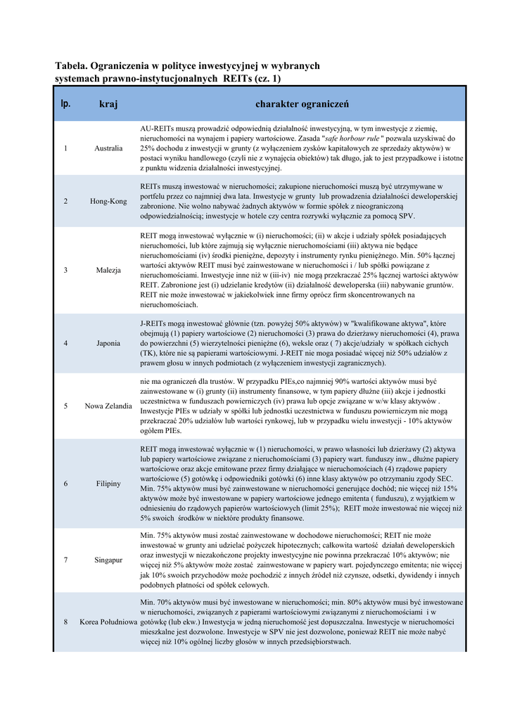 Tabela. Ograniczenia w polityce inwestycyjnej w wybranych systemach prawno-instytucjonalnych REITs (cz. 1) lp. 1 2 3 4 5 6 7 8 kraj charakter ograniczeń Australia AU-REITs muszą prowadzić odpowiednią działalność inwestycyjną, w tym inwestycje z ziemię, nieruchomości na wynajem i papiery wartościowe. Zasada "safe horbour rule " pozwala uzyskiwać do 25% dochodu z inwestycji w grunty (z wyłączeniem zysków kapitałowych ze sprzedaży aktywów) w postaci wyniku handlowego (czyli nie z wynajęcia obiektów) tak długo, jak to jest przypadkowe i istotne z punktu widzenia działalności inwestycyjnej. Hong-Kong REITs muszą inwestować w nieruchomości; zakupione nieruchomości muszą być utrzymywane w portfelu przez co najmniej dwa lata. Inwestycje w grunty lub prowadzenia działalności deweloperskiej zabronione. Nie wolno nabywać żadnych aktywów w formie spółek z nieograniczoną odpowiedzialnością; inwestycje w hotele czy centra rozrywki wyłącznie za pomocą SPV. Malezja REIT mogą inwestować wyłącznie w (i) nieruchomości; (ii) w akcje i udziały spółek posiadających nieruchomości, lub które zajmują się wyłącznie nieruchomościami (iii) aktywa nie będące nieruchomościami (iv) środki pieniężne, depozyty i instrumenty rynku pieniężnego. Min. 50% łącznej wartości aktywów REIT musi być zainwestowane w nieruchomości i / lub spółki powiązane z nieruchomościami. Inwestycje inne niż w (iii-iv) nie mogą przekraczać 25% łącznej wartości aktywów REIT. Zabronione jest (i) udzielanie kredytów (ii) działalność deweloperska (iii) nabywanie gruntów. REIT nie może inwestować w jakiekolwiek inne firmy oprócz firm skoncentrowanych na nieruchomościach. Japonia J-REITs mogą inwestować głównie (tzn. powyżej 50% aktywów) w "kwalifikowane aktywa", które obejmują (1) papiery wartościowe (2) nieruchomości (3) prawa do dzierżawy nieruchomości (4), prawa do powierzchni (5) wierzytelności pieniężne (6), weksle oraz ( 7) akcje/udziały w spółkach cichych (TK), które nie są papierami wartościowymi. J-REIT nie moga posiadać więcej niż 50% udziałów z prawem głosu w innych podmiotach (z wyłączeniem inwestycji zagranicznych). Nowa Zelandia nie ma ograniczeń dla trustów. W przypadku PIEs,co najmniej 90% wartości aktywów musi być zainwestowane w (i) grunty (ii) instrumenty finansowe, w tym papiery dłużne (iii) akcje i jednostki uczestnictwa w funduszach powierniczych (iv) prawa lub opcje związane w w/w klasy aktywów . Inwestycje PIEs w udziały w spółki lub jednostki uczestnictwa w funduszu powierniczym nie mogą przekraczać 20% udziałów lub wartości rynkowej, lub w przypadku wielu inwestycji - 10% aktywów ogółem PIEs. Filipiny REIT mogą inwestować wyłącznie w (1) nieruchomości, w prawo własności lub dzierżawy (2) aktywa lub papiery wartościowe związane z nieruchomościami (3) papiery wart. funduszy inw., dłużne papiery wartościowe oraz akcje emitowane przez firmy działąjące w nieruchomościach (4) rządowe papiery wartościowe (5) gotówkę i odpowiedniki gotówki (6) inne klasy aktywów po otrzymaniu zgody SEC. Min. 75% aktywów musi być zainwestowane w nieruchomości generujące dochód; nie więcej niż 15% aktywów może być inwestowane w papiery wartościowe jednego emitenta ( funduszu), z wyjątkiem w odniesieniu do rządowych papierów wartościowych (limit 25%); REIT może inwestować nie więcej niż 5% swoich środków w niektóre produkty finansowe. Singapur Min. 75% aktywów musi zostać zainwestowane w dochodowe nieruchomości; REIT nie może inwestować w grunty ani udzielać pożyczek hipotecznych; całkowita wartość działań deweloperskich oraz inwestycji w niezakończone projekty inwestycyjne nie powinna przekraczać 10% aktywów; nie więcej niż 5% aktywów może zostać zainwestowane w papiery wart. pojedynczego emitenta; nie więcej jak 10% swoich przychodów może pochodzić z innych źródeł niż czynsze, odsetki, dywidendy i innych podobnych płatności od spółek celowych. Min. 70% aktywów musi być inwestowane w nieruchomości; min. 80% aktywów musi być inwestowane w nieruchomości, związanych z papierami wartościowymi związanymi z nieruchomościami i w Korea Południowa gotówkę (lub ekw.) Inwestycja w jedną nieruchomość jest dopuszczalna. Inwestycje w nieruchomości mieszkalne jest dozwolone. Inwestycje w SPV nie jest dozwolone, ponieważ REIT nie może nabyć więcej niż 10% ogólnej liczby głosów w innych przedsiębiorstwach. 9 Taiwan 10 Tajlandia Inwestycje REITs ograniczone są do: (1) istniejących nieruchomości o stabilnych dochodach lub nieruchomości w fazie deweloperskiej (2) Praw związanych z nieruchomościami ze stabilnymi przychodami lub do nieruchomości w fazie deweloperskiej (inw. zatwierdzane przez nadzorcę) (3) papiery wartościowe związane z nieruchomościami (4) lub inne cele inwestycyjne zatwierdzone przez nadzorcę. Łączna kwota inwestycji w nieruchomości w fazie deweloperskiej i związane z nim prawa nieruchomości nie powinna być większa niż 15% wartości aktywów publicznych REIT lub 40% niepublicznych. Całkowity koszt inwestycji w krótkoterminowe papiery komercyjne nie powinna być większa niż 10% wartości aktywów netto (dod. inne ograniczenia). 75% wartości netto aktywów musi być zainwestowane w nieruchomości gotowe do generowania dochodów. Nie ma ograniczeń co do inwestycji w różne klasy aktywów nieruchomościowych. Nie więcej niż 10% łącznych aktywów może być zainwestowane w nieruchomości w budowie. Źródło: Opracowanie Fundacja Edukacji i Badań nad REITs na podstawie Mizerski G. (2016) REITs - efektywne inwestowanie w nieruchomości, CeDeWu, Warszawa.