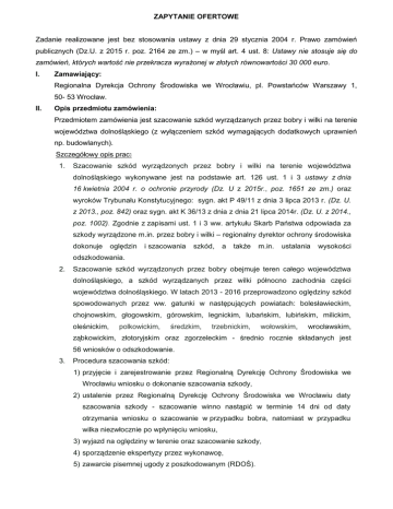 ZAPYTANIE OFERTOWE Zadanie realizowane jest bez stosowania ustawy z dnia 29 stycznia 2004 r. Prawo zamówień publicznych (Dz.U. z 2015 r. poz. 2164 ze zm.) – w myśl art. 4 ust. 8: Ustawy nie stosuje się do zamówień, których wartość nie przekracza wyrażonej w złotych równowartości 30 000 euro. I. Zamawiający: Regionalna Dyrekcja Ochrony Środowiska we Wrocławiu, pl. Powstańców Warszawy 1, 50- 53 Wrocław. II. Opis przedmiotu zamówienia: Przedmiotem zamówienia jest szacowanie szkód wyrządzanych przez bobry i wilki na terenie województwa dolnośląskiego (z wyłączeniem szkód wymagających dodatkowych uprawnień np. budowlanych). Szczegółowy opis prac: 1. Szacowanie szkód wyrządzonych przez bobry i wilki na terenie województwa dolnośląskiego wykonywane jest na podstawie art. 126 ust. 1 i 3 ustawy z dnia 16 kwietnia 2004 r. o ochronie przyrody (Dz. U z 2015r., poz. 1651 ze zm.) oraz wyroków Trybunału Konstytucyjnego: sygn. akt P 49/11 z dnia 3 lipca 2013 r. (Dz. U. z 2013., poz. 842) oraz sygn. akt K 36/13 z dnia z dnia 21 lipca 2014r. (Dz. U. z 2014., poz. 1002). Zgodnie z zapisami ust. 1 i 3 ww. artykułu Skarb Państwa odpowiada za szkody wyrządzone m.in. przez bobry i wilki – regionalny dyrektor ochrony środowiska dokonuje oględzin i szacowania szkód, a także m.in. ustalania wysokości odszkodowania. 2. Szacowanie szkód wyrządzonych przez bobry obejmuje teren całego województwa dolnośląskiego, a szkód wyrządzanych przez wilki północno zachodnia części województwa dolnośląskiego. W latach 2013 - 2016 przeprowadzono oględziny szkód spowodowanych przez ww. gatunki w następujących powiatach: bolesławieckim, chojnowskim, głogowskim, górowskim, legnickim, lubańskim, lubińskim, milickim, oleśnickim, polkowickim, średzkim, trzebnickim, wołowskim, wrocławskim, ząbkowickim, złotoryjskim oraz zgorzeleckim - średnio rocznie składanych jest 56 wniosków o odszkodowanie. 3. Procedura szacowania szkód: 1) przyjęcie i zarejestrowanie przez Regionalną Dyrekcję Ochrony Środowiska we Wrocławiu wniosku o dokonanie szacowania szkody, 2) ustalenie przez Regionalną Dyrekcję Ochrony Środowiska we Wrocławiu daty szacowania szkody - szacowanie winno nastąpić w terminie 14 dni od daty otrzymania wniosku o szacowanie w przypadku bobra, natomiast w przypadku wilka niezwłocznie po wpłynięciu wniosku, 3) wyjazd na oględziny w terenie oraz szacowanie szkody, 4) sporządzenie ekspertyzy przez wykonawcę, 5) zawarcie pisemnej ugody z poszkodowanym (RDOŚ). 4. Wykonawca zamówienia zobowiązany będzie do: 1) wyjazdu na oględziny w teren w celu dokonania szacowania szkody w terminie uzgodnionym z poszkodowanym (ust. 3 pkt 2 i 3) w obecności przedstawiciela Regionalnej Dyrekcji Ochrony Środowiska we Wrocławiu, 2) sporządzenia pisemnej ekspertyzy (ust. 3 pkt 4) zawierającej m.in.: opis miejsca, rodzaj i wielkość szkody, wyliczenie należnego odszkodowania z podaniem poszczególnych wycenianych elementów (pełnego algorytmu wyliczenia kwoty odszkodowania, źródła przyjętych cen usługi i towarów), dokumentację fotograficzną obrazującą wszystkie uszkodzone miejsca oraz elementy (wydruk maksymalnie 20 zdjęć w kolorze, 4 zdjęcia na stronę, wszystkie wykonane zdjęcia na płycie CD/DVD - pliki .jpg), 3) sporządzania dodatkowych pisemnych informacji lub wykonania dodatkowych oględzin dotyczących wykonanych ekspertyz, w przypadku uwag lub odwołań złożonych przez poszkodowanych, występowania jako świadek w przypadku ewentualnych sporów sądowych, bez dodatkowych gratyfikacji. 4) wykonania przedmiotu zamówienia przy pomocy własnych narzędzi i sprzętu posiadającego cechy legalizacji (np. taśma miernicza) oraz zgodnie z obowiązującymi przepisami oraz stanem współczesnej wiedzy i wszelkimi normami mogącymi mieć zastosowanie przy wykonywaniu przedmiotu zamówienia. 5) Odpowiedzialności za wady, omyłki i błędy związane z wykonaniem przedmiotu umowy oraz sporządzania dodatkowych pisemnych informacji lub wykonania dodatkowych oględzin dotyczących wykonanych ekspertyz, w przypadku uwag lub odwołań złożonych przez poszkodowanych, jak również do udziału w postępowaniach przed sądami dotyczących oszacowanych szkód, 5. Zamawiający zobowiązuje się do: 1) niezwłocznego przekazania informacji Wykonawcy o fakcie wpływu wniosku o szacowanie oraz ustalenia, w porozumieniu z poszkodowanym i wykonawcą, daty oględzin 2) zapewnienia transportu na trasie z Wrocławia do miejsca wystąpienia szkody oraz z powrotem. III. Termin realizacji zamówienia: Zamówienie należy wykonać do dnia: 1 grudnia 2017 r. IV. Opis kryteriów wyboru Wykonawcy: Zamawiający udzieli zamówienia Wykonawcy lub Wykonawcom, który/którzy wykażą się wykonaniem minimum pięćdziesięcioma usługami w zakresie szacowanie szkód wyrządzanych przez bobry i wilki, w okresie ostatnich trzech lat przed upływem terminu składania ofert. Zamawiający udzieli zamówienia Wykonawcy lub Wykonawcom, których oferty zostaną ocenione za najkorzystniejsze na podstawie poniższych kryteriów. Za najkorzystniejszą zostanie uznana oferta, która uzyska największą ilość punktów, z uwzględnieniem dwóch kryteriów oceny: a) cena – 90 % (C) b) doświadczenie – 10 % (D), wg następującego wzoru: Pi= Ci + Di gdzie: Pi – oznacza ilość punktów przyznanych badanej ofercie „i” Ci – oznacza ilość punków przyznanych ofercie „i” za kryterium cena Di – oznacza ilość punków przyznanych ofercie „i” za kryterium doświadczenie 1. Ocena według kryterium cena (C) będzie dokonywana na podstawie złożonej oferty przez Wykonawcę (maksymalnie 90 pkt.), wg wzoru: C minimalna Ci = x 90 C oferowana gdzie: Ci – oznacza ilość punktów przyznana ocenianej ofercie „i” za kryterium cena Cminimalna – oznacza najniższą oferowaną cenę brutto wykonania przedmiotu zamówienia spośród ważnych oraz nie odrzuconych 