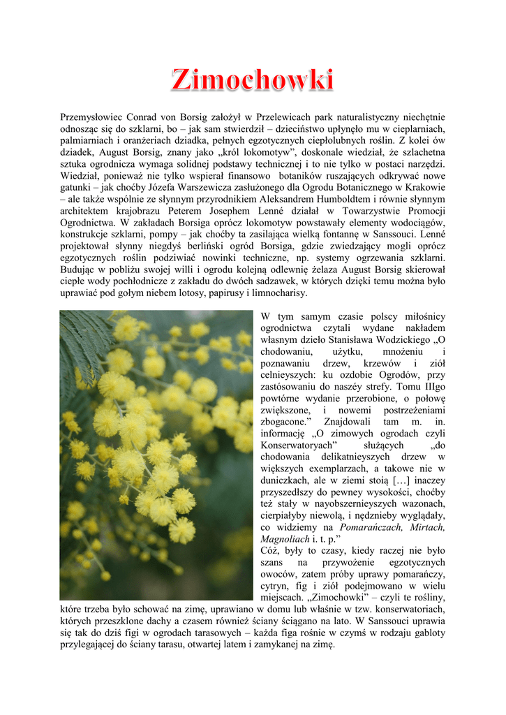 Przemysłowiec Conrad von Borsig założył w Przelewicach park naturalistyczny niechętnie odnosząc się do szklarni, bo – jak sam stwierdził – dzieciństwo upłynęło mu w cieplarniach, palmiarniach i oranżeriach dziadka, pełnych egzotycznych ciepłolubnych roślin. Z kolei ów dziadek, August Borsig, znany jako „król lokomotyw”, doskonale wiedział, że szlachetna sztuka ogrodnicza wymaga solidnej podstawy technicznej i to nie tylko w postaci narzędzi. Wiedział, ponieważ nie tylko wspierał finansowo botaników ruszających odkrywać nowe gatunki – jak choćby Józefa Warszewicza zasłużonego dla Ogrodu Botanicznego w Krakowie – ale także wspólnie ze słynnym przyrodnikiem Aleksandrem Humboldtem i równie słynnym architektem krajobrazu Peterem Josephem Lenné działał w Towarzystwie Promocji Ogrodnictwa. W zakładach Borsiga oprócz lokomotyw powstawały elementy wodociągów, konstrukcje szklarni, pompy – jak choćby ta zasilająca wielką fontannę w Sanssouci. Lenné projektował słynny niegdyś berliński ogród Borsiga, gdzie zwiedzający mogli oprócz egzotycznych roślin podziwiać nowinki techniczne, np. systemy ogrzewania szklarni. Budując w pobliżu swojej willi i ogrodu kolejną odlewnię żelaza August Borsig skierował ciepłe wody pochłodnicze z zakładu do dwóch sadzawek, w których dzięki temu można było uprawiać pod gołym niebem lotosy, papirusy i limnocharisy. W tym samym czasie polscy miłośnicy ogrodnictwa czytali wydane nakładem własnym dzieło Stanisława Wodzickiego „O chodowaniu, użytku, mnożeniu i poznawaniu drzew, krzewów i ziół celnieyszych: ku ozdobie Ogrodów, przy zastósowaniu do naszéy strefy. Tomu IIIgo powtórne wydanie przerobione, o połowę zwiększone, i nowemi postrzeżeniami zbogacone.” Znajdowali tam m. in. informację „O zimowych ogrodach czyli Konserwatoryach” służących „do chodowania delikatnieyszych drzew w większych exemplarzach, a takowe nie w duniczkach, ale w ziemi stoią […] inaczey przyszedłszy do pewney wysokości, choćby też stały w nayobszernieyszych wazonach, cierpiałyby niewolą, i nędznieby wyglądały, co widziemy na Pomarańczach, Mirtach, Magnoliach i. t. p.” Cóż, były to czasy, kiedy raczej nie było szans na przywożenie egzotycznych owoców, zatem próby uprawy pomarańczy, cytryn, fig i ziół podejmowano w wielu miejscach. „Zimochowki” – czyli te rośliny, które trzeba było schować na zimę, uprawiano w domu lub właśnie w tzw. konserwatoriach, których przeszklone dachy a czasem również ściany ściągano na lato. W Sanssouci uprawia się tak do dziś figi w ogrodach tarasowych – każda figa rośnie w czymś w rodzaju gabloty przylegającej do ściany tarasu, otwartej latem i zamykanej na zimę. Można przemyśleć założenie takiego konserwatorium wzdłuż południowej ściany domu, o ile nie jest zacieniona przez sąsiednie obiekty. Przeznacza się na to pas szerokości około 1 m. Pod oknami można posadzić rozmaryn, mirt, pelargonie, a między oknami cytrusy, laur, figę i oliwkę oraz oleandry. Na zimę – przed pierwszymi przymrozkami montuje się ściany i spadzisty dach np. z paneli z tworzywa, jeśli nie chcemy ryzykować szkła. Do ogrzania wystarcza na ogół ciepło emitowane przez budynek, podlewanie ciepłą wodą lub uchylenie okien z domu, ponieważ roślinom należy zapewnić temperaturę ok. 2-5°C. Dogrzewanie byłoby więc konieczne tylko podczas silnych mrozów. W nagrodę zimą wystarczy otworzyć okno, sięgnąć ręką i zerwać liść laurowy do zupy albo świeżą figę. Wiosną znajdzie się tu miejsce na produkcję rozsad. Z kolei latem pas roślin pomoże w utrzymaniu przyjemnej temperatury wewnątrz podczas upałów, a jednocześnie po zdemontowaniu lub odsunięciu ścianek i dachu podlewanie i zapylanie będzie można zostawić siłom natury. Plan budowy ogrodu zimowego dobrze jest skonsultować z fachowcem szczególnie w zakresie utrzymania temperatury. Większe wolno stojące szklarnie wymagają zezwolenia na budowę. Przebywając w lutym lub marcu w okolicach Drezna, można skręcić do parku w Pillnitz, gdzie kwitnie jedna z najstarszych i najpiękniejszych kamelii w Europie. Zimą jest ona chroniona specjalną konstrukcją nasuwaną na okaz po szynach. Na lato ta ruchoma szklarnia odjeżdża i kamelia może się cieszyć świeżym powietrzem. Autor: Katarzyna Misiak Ogród Dendrologiczny w Przelewicach 74-210 Przelewice, nr 17 Tel.: 91 564 30 80 Fax: 91 579 00 88 [email protected] www.ogrodprzelewice.pl