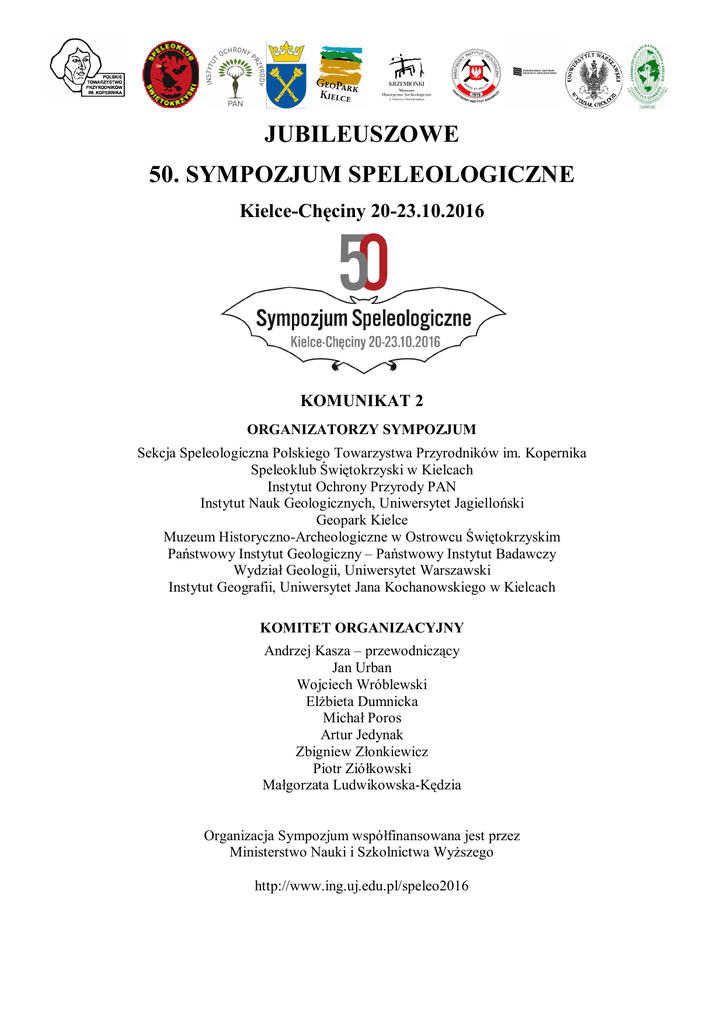 JUBILEUSZOWE 50. SYMPOZJUM SPELEOLOGICZNE Kielce-Chęciny 20-23.10.2016 KOMUNIKAT 2 ORGANIZATORZY SYMPOZJUM Sekcja Speleologiczna Polskiego Towarzystwa Przyrodników im. Kopernika Speleoklub Świętokrzyski w Kielcach Instytut Ochrony Przyrody PAN Instytut Nauk Geologicznych, Uniwersytet Jagielloński Geopark Kielce Muzeum Historyczno-Archeologiczne w Ostrowcu Świętokrzyskim Państwowy Instytut Geologiczny – Państwowy Instytut Badawczy Wydział Geologii, Uniwersytet Warszawski Instytut Geografii, Uniwersytet Jana Kochanowskiego w Kielcach KOMITET ORGANIZACYJNY Andrzej Kasza – przewodniczący Jan Urban Wojciech Wróblewski Elżbieta Dumnicka Michał Poros Artur Jedynak Zbigniew Złonkiewicz Piotr Ziółkowski Małgorzata Ludwikowska-Kędzia Organizacja Sympozjum współfinansowana jest przez Ministerstwo Nauki i Szkolnictwa Wyższego http://www.ing.uj.edu.pl/speleo2016 Pierwsza, uroczysta Sesja Jubileuszowa Sympozjum odbędzie się w Centrum Geoedukacji na Wietrzni w Kielcach (Kielce, ul. Daleszycka 21). Natomiast pozostała część obrad i zakwaterowanie uczestników przewidziane są w Europejskim Centrum Edukacji Geologicznej w Chęcinach (Korzecko 1c). PROGRAM SYMPOZJUM 20.10.2016 (czwartek) 8.00/9.00–13.30 Przedsympozjalna sesja terenowa – system jaskiniowy Chelosiowa JamaJaskinia Jaworznicka lub Jaskinia Pajęcza w Jaworzni 12.00–14.00 12.00–14.00 Rejestracja uczestników w Centrum Geoedukacji na Wietrzni (Kielce, ul. Daleszycka 21) Zwiedzanie Centrum Geoedukacji na Wietrzni (Kielce, ul. Daleszycka 21) 14.00–14.15 Otwarcie 50 Sympozjum Speleologicznego (Sala Konferencyjna Centrum Geoedukacji) 14.15–15.20 Sesja referatowa I Jubileuszowe, Pięćdziesiąte Sympozjum Speleologiczne (Sala Konferencyjna Centrum Geoedukacji) B.W. Wołoszyn: Patrząc wstecz – czyli glossa do historii speleologii w Polsce J. Baryła: Powstanie i działalność Sekcji Speleologicznej Polskiego Towarzystwa Przyrodników im. Kopernika oraz sympozja speleologiczne wypowiedzi innych Honorowych Gości Sympozjum J. Urban: Nagroda oraz Medal im. Marii Markowicz-Łohinowicz – cele i tradycje 14.55–14.30 14.30–15.00 15.00–15.10 15.10–15.20 15.20–15.30 Sesja posterowa: Pięćdziesiąt Sympozjów Speleologicznych (Hol Główny Centrum Geoedukacji) R. Dobrowolski, Z. Cierech: Lubelskie sympozja speleologiczne M. Gradziński: Sympozja speleologiczne w Tatrach M. Gradziński, J. Baryła: Sympozjum speleologiczne w Pieninach – 1993 rok M. Gradziński, J. Partyka: Sympozja speleologiczne w południowej części Wyżyny Krakowsko-Częstochowskiej G. Klassek, J. Pukowski: Sympozja speleologiczne na terenie Karpat zewnętrznych (Beskidów) A. Polonius, J. Szulc, A. Szynkiewicz: Sympozja speleologiczne na Górnym Śląsku K Stefaniak, U. Ratajczak: Sympozja speleologiczne odbywające się na obszarze Dolnego Śląska i ziem przyległych A. Tyc: Sympozja speleologiczne na Wyżynie Krakowsko-Wieluńskiej – część częstochowska i wieluńska J. Urban: Sympozja speleologiczne na Niżu Polskim J. Urban, A. Kasza: Sympozja speleologiczne na Ponidziu J. Urban, A. Kasza, T. Wróblewski: Sympozja speleologiczne w Górach Świętokrzyskich 15.30–15.50 Przerwa 15.50–17.30 17.30–18.00 Sesja referatowa II Kras i jaskinie permsko-mezozoicznego obrzeżenia Gór Świętokrzyskich (Sala Konferencyjna Centrum Geoedukacji) A. Wierzbowski: Górna jura obrzeżenia Gór Świętokrzyskich – litologia i facje B. Rzonca: Hydrologiczna rola przestrzeni porowej skał węglanowych – badania w regionie świętokrzyskim Z. Złonkiewicz, A. Kasza: Kras w obrzeżeniu permsko-mezozoicznym Gór Świętokrzyskich M. Ludwikowska-Kędzia: Rola procesów i form krasowych w rozwoju rzeźby fluwialnej w centralnej części Gór Świętokrzyskich J. Urban: Geologiczne i geomorfologiczne uwarunkowania rozwoju jaskiń w piaskowcach dolnotriasowych oraz dolnojurajskich Gór Świętokrzyskich przejazd na Kadzielnię 18.00–19.30 Sesja terenowa A – Podziemna Trasa Turystyczna na Kadzielni 19.30–20.00 Przejazd do Europejskiego Centrum Edukacji Geologicznej w Chęcinach (Korzecko 1c) 20:00–20:30 Rejestracja uczestników w Europejskim Centrum Edukacji Geologicznej w Chęcinach Kolacja 15.50–16.10 16.10–16.30 16.30–16.50 16.50–17.10 17.10–17.30 20.00–21.00 21.10.2016 (piątek) 8.00–9.00 Rejestracja uczestników w Europejskim Centrum Edukacji Geologicznej w Chęcinach 8.00–9.00 Śniadanie 9.00–11.00 9.00–9.15 10.30-10.40 Sesja referatowa J. Szczygieł, M. Mendecki, M. Glazer, W. Wróblewski: Kompleksowe badania zdarzeń paleosejsmicznych w Tatrach – zapis z Jaskini Kalackiej H. Hercman, J. Pawlak, M. Gąsiorowski, P. Bosak, P. Pruner: Stratygrafia tlenowa jako narzędzie do budowy chronologii nacieków jaskiniowych o wieku poza zasięgiem metody uranowo-torowej – przykład z jaskini Snežni jami (Jaskini Śnieżnej, Słowenia) J. Szczygieł, M. Golicz, E. Lynch, H. Hercman: Rozwój jaskiń w krasie południowo-chińskim w rejonie Wulong (prowincja Chongqing) M. Błaszczyk, H. Hercman, J. Pawlak, M. Gąsiorowski, M. Aninowska, D. Kicińska, A. Tyc: Rekonstrukcja warunków paleoklimatycznych dolnego i środkowego plejstocenu na podstawie badań izotopowych i analiz mikrofacjalnych polewy z Jaskini Głębokiej (Jura KrakowskoCzęstochowska) M. Gradziński, E. Jach, E. Górnikiewicz: Naskorupienia węglanowe wypełniające szczeliny skalne – analog nacieków z mleka wapiennego A. Gądek: Współczesne żłobki krasowe obszaru podkrakowskiego – wstępne wyniki analiz hydrochemicznych dyskusja 10.40–11.00 Przerwa 9.15–9.30 9.30–9.45 9.45–10.00 10.00–10.15 10.15–10.30 11.00–12.55 11.00–11.20 11.20–11.30 12.45-12.55 Sesja referatowa J. Szulc: Syngenetyczny kras kopalny Polski południowej – nowe dane J. Szulc: Uwał jeziora Koło w Żędowicach (Górny Śląsk) w obrazie LIDAR – nowe możliwości interpretacyjne W. Bardziński, E. Kurowska: Przejawy i uwarunkowania krasu w dolnych w