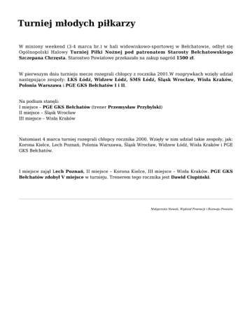 Turniej młodych piłkarzy W miniony weekend (3-4 marca br.) w hali widowiskowo-sportowej w Bełchatowie, odbył się Ogólnopolski Halowy Turniej Piłki Nożnej pod patronatem Starosty Bełchatowskiego Szczepana Chrzęsta. Starostwo Powiatowe przekazało na zakup nagród 1500 zł. W pierwszym dniu turnieju mecze rozegrali chłopcy z rocznika 2001.W rozgrywkach wzięły udział następujące zespoły: ŁKS Łódź, Widzew Łódź, SMS Łódź, Śląsk Wrocław, Wisła Kraków, Polonia Warszawa i PGE GKS Bełchatów I i II. Na podium stanęli: I miejsce – PGE GKS Bełchatów (trener Przemysław Przybylski) II miejsce – Śląsk Wrocław III miejsce – Wisła Kraków Natomiast 4 marca turniej rozegrali chłopcy rocznika 2000. Wzięły w nim udział takie zespoły, jak: Korona Kielce, Lech Poznań, Polonia Warszawa, Śląsk Wrocław, Widzew Łódź, Wisła Kraków i PGE GKS Bełchatów. I miejsce zajął Lech Poznań, II miejsce – Korona Kielce, III miejsce – Wisła Kraków. PGE GKS Bełchatów zdobył V miejsce w turnieju. Trenerem tego rocznika jest Dawid Ciupiński. Małgorzata Nowak, Wydział Promocji i Rozwoju Powiatu