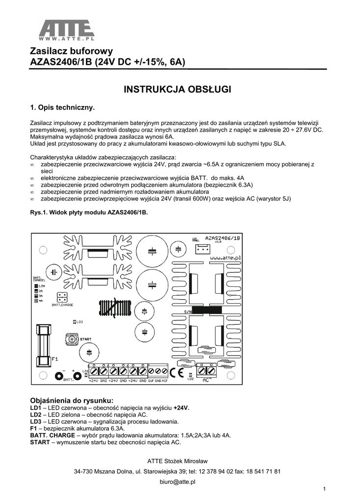 Zasilacz buforowy AZAS2406/1B (24V DC +/-15%, 6A) INSTRUKCJA OBSŁUGI 1. Opis techniczny. Zasilacz impulsowy z podtrzymaniem bateryjnym przeznaczony jest do zasilania urządzeń systemów telewizji przemysłowej, systemów kontroli dostępu oraz innych urządzeń zasilanych z napięć w zakresie 20 ÷ 27.6V DC. Maksymalna wydajność prądowa zasilacza wynosi 6A. Układ jest przystosowany do pracy z akumulatorami kwasowo-ołowiowymi lub suchymi typu SLA. Charakterystyka układów zabezpieczających zasilacza: • zabezpieczenie przeciwzwarciowe wyjścia 24V, prąd zwarcia ~6.5A z ograniczeniem mocy pobieranej z sieci • elektroniczne zabezpieczenie przeciwzwarciowe wyjścia BATT. do maks. 4A • zabezpieczenie przed odwrotnym podłączeniem akumulatora (bezpiecznik 6.3A) • zabezpieczenie przed nadmiernym rozładowaniem akumulatora • zabezpieczenie przeciwprzepięciowe wyjścia 24V (transil 600W) oraz wejścia AC (warystor 5J) Rys.1. Widok płyty modułu AZAS2406/1B. Objaśnienia do rysunku: LD1 – LED czerwona – obecność napięcia na wyjściu +24V. LD2 – LED zielona – obecność napięcia AC. LD3 – LED czerwona – sygnalizacja procesu ładowania. F1 – bezpiecznik akumulatora 6.3A. BATT. CHARGE – wybór prądu ładowania akumulatora: 1.5A;2A;3A lub 4A. START – wymuszenie startu bez obecności napięcia AC. ATTE Stożek Mirosław 34-730 Mszana Dolna, ul. Starowiejska 39; tel: 12 378 94 02 fax: 18 541 71 81 [email protected] 1 Opis złącz: Nazwa złącza LED PANEL AC Opis Złącze sygnalizacji LED umieszczonej na panelu obudowy Zasilanie wejściowe (30 ÷ 32V AC), złącze do podłączenia uzwojenia wtórnego transformatora sieciowego Przewody do podłączenia akumulatora (czerwony +; czarny -) Wyjście zasilacza (+24V) Masa (-24V) Wyjście typu OC sygnalizujące niskie napięcie na wyjściu +24V lub awarię akumulatora Wyjście typu OC sygnalizujące brak zasilania AC BATT +24V GND OUF ACF Sygnalizacja pracy zasilacza na zewnętrznym panelu: Obecność napięcia na wyjściach zasilacza sygnalizowana jest świeceniem czerwonej diody LED. Obecność zasilania AC sygnalizowana jest poprzez zieloną diodę LED. DANE TECHNICZNE Obudowa Wymiary Montaż Zalecany transformator Bezpiecznik transformatora Typ zasilacza Moc zasilacza Napięcie wyjściowe Prąd wyjściowy Prąd ładowania akumulatora Pobór prądu przez układ zasilacza Ilość wyjść zasilania Ochrona akumulatora Zabezpieczenie przed zwarciem wyjścia 24V Zabezpieczenie przed zwarciem zacisków akku Zabezpieczenie odwrotnej polaryzacji akku Zabezpieczenie przed przepięciami Sygnalizacja pracy Wyjścia techniczne Typ wyjść technicznych Funkcja startu przy braku zasilania AC Zakres temperatur pracy brak, konstrukcja otwarta 78 × 110 × 45 (szer. × dł. × wys.) Otwory montażowe 4mm 300VA 32V AC 50÷60 Hz F 3.15A/250V (5x20) impulsowy, sprawność 88÷91% 140W ciągła, 165W maks. 22÷27.6V - zasilanie sieciowe, 21÷25.2V - praca bateryjna max 6A , zalecany ciągły: do 5A [1] 1.5A;2A;3A lub 4A wybierane zworkami (BATT. CHARGE) 30mA maks. 1 – potrójne - Odłączenie dla napięcia akumulatora poniżej 21V. automatyczny powrót po powrocie napięcia sieci, - Zabezpieczenie przed odwrotnym podłączeniem akumulatora elektroniczne przetwornicy: 6.5A (maks. 7A); z akumulatorem: 6.5A + prąd przepalenia bezpiecznika 6.3A elektroniczne, ograniczenie prądu do wartości ustawionej zworkami BATT. CHARGE bezpiecznik szybki 6.3A transil 600W diody LED: stan zasilania AC, stan wyjścia 24V, stan ładowania akumulatora tak, OUF – brak napięcia +24V, ACF – brak napięcia AC typu OC (otwarty kolektor), maks. 50mA na wyjście tak, przycisk START [2] -10°C ... +40°C [3] Adnotacje: 1. Zaleca się pozostawienie rezerwy minimum 1.5A dla obwodu ładowania akumulatora. 2. Wyzwalanie przyciskiem START: zaleca się odciążenie zasilacza w celu poprawnego startu. 3. Dla temperatury otoczenia powyżej +27°C oraz mocy pobieranej ponad 130W zaleca się zastosowanie wymuszonego chłodzenia. ATTE Stożek Mirosław 34-730 Mszana Dolna, ul. Starowiejska 39; tel: 12 378 94 02 fax: 18 541 71 81 [email protected] 2 Rys.2. Zależność obciążenia od temperatury otoczenia Obciążalność zasilacza uzależniona jest od temperatury otoczenia. Zasilacz można obciążyć w 100% (4.5A + rezerwa 1.5A) tylko wtedy, jeśli temperatura otoczenia zawiera się w przedziale od 0°C do 27°C. Zależność tą przedstawiono na powyższym wykresie. 2. Obsługa oraz eksploatacja. Obsługa Zasilacz po zainstalowaniu nie wymaga żadnych czynności obsługowych. Zaleca się jedynie okresowe kontrole stanu akumulatora. Konserwacja Zasilacz nie wymaga wykonywania żadnych specjalnych zabiegów konserwacyjnych. W przypadku wymiany bezpieczników należy używać zamienników zgodnych z oryginalnymi. UWAGI: Zasilacz powinien być chroniony przed wpływami atmosferycznymi, w szczególności przed deszczem i nasłonecznieniem. OZNAKOWANIE WEEE Jeżeli zamierzasz pozbyć się tego produktu, nie wyrzucaj go razem ze zwykłymi domowymi odpadkami. Według dyrektywy WEEE (Dyrektywa 2002/96/EC) obowiązującej w Unii Europejskiej dla używanego sprzętu elektrycznego i elektronicznego należy stosować oddzielne sposoby utylizacji. W Polsce zgodnie z przepisami ustawy z dnia 1 lipca 2005 r. o zużytym sprzęcie elektrycznym i elektronicznym zabronione jest umieszczanie łącznie z innymi odpadami zużytego sprzętu oznakowanego symbolem przekreślonego kosza. Użytkownik, który zamierza pozbyć się tego produktu, jest obowiązany do oddania zużytego sprzętu elektrycznego i elektronicznego do punktu zbierania zużytego sprzętu. Punkty zbierania prowadzone są m.in. przez sprzedawców hurtowych i detalicznych tego sprzętu oraz przez gminne jednostki organizacyjne prowadzące działalność w zakresie odbierania odpadów. Powyższe obowiązki ustawowe wprowadzone zostały w celu ograniczenia ilości odpadów powstałych ze zużytego sprzętu elektryczneg