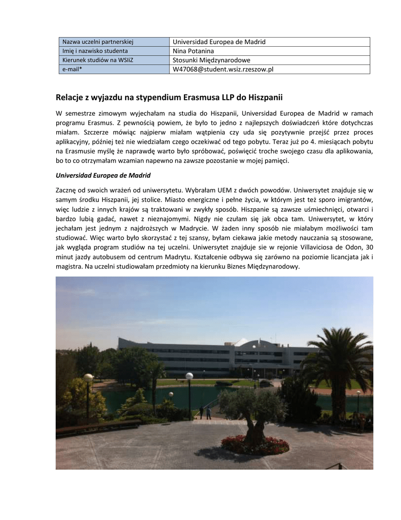 Nazwa uczelni partnerskiej Imię i nazwisko studenta Kierunek studiów na WSIiZ e-mail* Universidad Europea de Madrid Nina Potanina Stosunki Międzynarodowe [email protected] Relacje z wyjazdu na stypendium Erasmusa LLP do Hiszpanii W semestrze zimowym wyjechałam na studia do Hiszpanii, Universidad Europea de Madrid w ramach programu Erasmus. Z pewnością powiem, że było to jedno z najlepszych doświadczeń które dotychczas miałam. Szczerze mówiąc najpierw miałam wątpienia czy uda się pozytywnie przejść przez proces aplikacyjny, później też nie wiedziałam czego oczekiwać od tego pobytu. Teraz już po 4. miesiącach pobytu na Erasmusie myślę że naprawdę warto było spróbować, poświęcić troche swojego czasu dla aplikowania, bo to co otrzymałam wzamian napewno na zawsze pozostanie w mojej pamięci. Universidad Europea de Madrid Zacznę od swoich wrażeń od uniwersytetu. Wybrałam UEM z dwóch powodów. Uniwersytet znajduje się w samym środku Hiszpanii, jej stolice. Miasto energiczne i pełne życia, w którym jest też sporo imigrantów, więc ludzie z innych krajów są traktowani w zwykły sposób. Hiszpanie są zawsze uśmiechnięci, otwarci i bardzo lubią gadać, nawet z nieznajomymi. Nigdy nie czułam się jak obca tam. Uniwersytet, w który jechałam jest jednym z najdroższych w Madrycie. W żaden inny sposób nie miałabym możliwości tam studiować. Więc warto było skorzystać z tej szansy, byłam ciekawa jakie metody nauczania są stosowane, jak wygląda program studiów na tej uczelni. Uniwersytet znajduje sie w rejonie Villaviciosa de Odon, 30 minut jazdy autobusem od centrum Madrytu. Kształcenie odbywa się zarówno na poziomie licancjata jak i magistra. Na uczelni studiowałam przedmioty na kierunku Biznes Międzynarodowy. Nauka Wszystkie przedmioty były prowadzone w języku angielskim. Bardzo mi się podobały metody nauczania wykorzystane na zajęciach. Codziennie wyuczoną teorię próbowaliśmy stosować w praktyce, rozwiązując case study. Każdy przedmiot zawierał zadania projektówe, nad którymi mieliśmy pracować w grupach roboczych. W pewnym stopniu jest to też wyzwanie - porozumieć się z ludźmi z różnych krajów, niemniej jednak dostarcza to zarówno dużo satysfakcji, także uczy asertywności. Nauka odbywała się nie tylko podczas zajęć które mieliśmy na uczelni, ale też z życia codziennego w innym kraju. W końcu wszyscy uczyliśmy się od siebie nawzajem, bo każdy naród jak i każdy człowiek ma coś osobliwego w sobie, co wyróżnia go, jakieś jakości których inni podziwiają i których warto się uczyć. Studenci są zawsze chętni spędzać czas razem poza uczelnią. Więc podczas pobytu także nabywałam doświadczenia w komunikacji międzynarodowej. W ramach niektórych przedmiotów mieliśmy także okazję zobaczyć jak działąją niektóre firmy od środka, poprzez osobiste odwiedzanie tych firm. Nauczyciele są bardzo otwarci i pomocni wobec studentów. Zawsze chętni w czymś doradzić, nie tylko w sprawach lektorskich, lecz także w życiowych. Często zachęcają do wspólnych dyskusji, są bardzo inspirujące, wywołują zainteresowanie u studentów predmiotem. Część studentów grupy kursu M&A z prof. Susaną Sousa Santos Biblioteka i komputery W bibliotece mieliśmy dostęp do wielu aktualnych wydań naukowych w językach angielskim i hiszpańskim. Także w uniwersytecie znajdują się duże sale komputerowe, idealne miejsce dla przygotowania wspólnych projektów grupowych, współpracy i pomocy podczas wykonania testów online, przygotowania różnych prezentacji, lub też po prostu miejsce, w którym zawsze można spotkać dużo znajomych oraz także pozszerzyć swój krąg przyjaciól. Lubiliśmy spędzać tam dużo czasu, dzielić się swoimi doświadczeniami życiowymi, gadać i śmiać się. Współpraca podczas napisania egzaminu w jednej z sal komputerowych Egzaminy Dla zaliczenia przedmiotów trzeba było napisać egzaminy, które zawierały pytania dotyczące materiałów od wykładowców, dyskusji w trakcie poprzednich zajęć oraz także własnych przemysleń. Przedmioty finansowe oprócz rozwiązywania case study i wykonania prawidłowych obliczeń także wymagały umiejętności interpretacji uzyskanych rezultatów, co dla mnie było bardzo ważne, bo tego właśnie chciałam się nauczyć. W niektórych przedmiotach dużą rolę odgrywała aktywność podczas zajęć, czasem dla ich zaliczenia wystarczało zebrać punkty za zaangażowanie w naukę. Oprócz egzaminów nie mniej ważne też były prezentacje, własne opracowania domowe i projekty. Wiza, pozwolenie na pracę, ubezpieczenie i wydatki na podróż Wyjechałam do Hiszpanii z polską wizą roczną. Podczas pobytu korzystałam z ubezpieczenia - European Youth Card „Student EURO 26”, które jest ważne przez cały rok w krajach całego światu (bez USA i Kanady) za dość niską cenę (73 zł). Podaję link do strony internetowej z informacją o ubezpieczeniu: http://euro26.pl/. Dla korzystania z różnego rodzaju transportu komunikacji miejskiej (metro, pociągi i autobusy) trzeba było uzyskać kartę Abono Joven (ze zniżką dla młodzieży) i dokupić do niej Cupon Mensual (Bilet Miesięczny). Opłata za bilet w zależności od strefy w ramach której korzystacie z transportu miejskiego. Kalendarz roku akademickiego Dział Współpracy z Zagranicą zorganizował dla wszystkich studentów Erasmus przyjęcie powitalne oraz intensywny kurs języka hiszpańskiego (trwał 2 tygodnie) na początku września. W pierwszym dniu zajęć zwykle opowiadaliśmy o sobie, naszych zainteresowaniach, skąd jesteśmy, o swoich oczekiwaniach odnośnie przedmiotu, czego chcemy się nauczyć. Natomiast w ostatnim dniu niektórych przedmiotów profesor pytała nas o naszej opinii odnośnie przeprowadzonych zajęć, w jaki sposób zajęcia były efektywne i w czym warto zmienić metody nauczania aby przyszli studenci mogli się wi