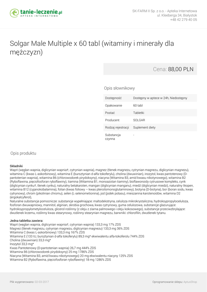 SK-FARM II Sp. z o.o. - Apteka Internetowa ul. Kleeberga 34, Białystok +48 42 279 40 05 Solgar Male Multiple x 60 tabl (witaminy i minerały dla mężczyzn) Cena: 88,00 PLN Opis słownikowy Dostępność Dostępny w aptece w 24h, Niedostępny Opakowanie 60 tabl Postać Tabletki Producent SOLGAR Rodzaj rejestracji Suplement diety Substancja czynna - Opis produktu Składniki Wapń (węglan wapnia, diglicynian wapnia†, cytrynian wapnia), magnez (tlenek magnezu, cytrynian magnezu, diglicynian magnezu), witamina C (kwas L-askorbinowy), witamina E (bursztynian d-alfa tokoferylu), cholina (dwuwinian), inozytol, kwas pantotenowy (Dpantotenian wapnia), witamina B6 (chlorowodorek pirydoksyny), niacyna (Witamina B3, amid kwasu nikotynowego), witamina B2 (Ryboflawina, pięciofosforan ryboflawiny), tiamina (Witamina B1, monoazotan tiaminy), bioflawonoidy cytrusowe kompleks, cynk (diglicynian cynku†, tlenek cynku), naturalny betakaroten, mangan (diglicynian manganu), miedź (diglicynian miedzi), naturalny likopen, witamina B12 (cyjanokobalamina), folian (kwas foliowy – kwas pteroilomonoglutaminowy), biotyna (D-biotyna), bor (boran sodu, kwas cytrynowy), chrom (pikolinian chromu), selen (L-selenometionina), jod (jodek potasu), mieszanina karotenoidów, witamina D2 (ergokalcyferol), Naturalne substancje pomocnicze: substancje wypełniające: maltodekstryna, celuloza mikrokrystaliczna, hydroksypropyloceluloza, fosforan dwuwapniowy, mannitol, alginian, skrobia grochowa, kwas cytrynowy, guma celulozowa, substancje glazurujące: hydroksypropylometyloceluloza, glicerol roślinny (z oleju z ziarna palmowego i oleju kokosowego), substancje przeciwzbrylające: dwutlenek krzemu, roślinny kwas stearynowy, roślinny stearynian magnezu, barwniki: chlorofilin, dwutlenek tytanu. Jedna tabletka zawiera: Wapń (węglan wapnia, diglicynian wapnia†, cytrynian wapnia) 133,3 mg 17% ZDS Magnez (tlenek magnezu, cytrynian magnezu, diglicynian magnezu) 133,3 mg 36% ZDS Witamina C (kwas L-askorbinowy) 133,3 mg 167% ZDS Witamina E (133 IU, bursztynian d-alfa tokoferylu) 89,3 mg* ekwiwalentu alfa-tokoferolu 744% ZDS Cholina (dwuwinian) 33,3 mg* Inozytol 33,3 mg* Kwas Pantotenowy (D-pantotenian wapnia) 26,7 mg 444% ZDS Witamina B6 (chlorowodorek pirydoksyny) 25 mg 1786% ZDS Niacyna (Witamina B3, amid kwasu nikotynowego) 20 mg ekwiwalentu niacyny 125% ZDS Witamina B2 (Ryboflawina, pięciofosforan ryboflawiny) 18 mg 1286% ZDS Plik wygenerowano: 02-03-2017 Oprogramowanie sklepu: AptusShop SK-FARM II Sp. z o.o. - Apteka Internetowa ul. Kleeberga 34, Białystok +48 42 279 40 05 Tiamina (Witamina B1, monoazotan tiaminy) 16,7 mg 1515% ZDS Bioflawonoidy Cytrusowe Kompleks 8,3 mg* Cynk (diglicynian cynku†, tlenek cynku) 5 mg 50% ZDS Naturalny Betakaroten 1,8 mg* Mangan (diglicynian manganu) 0,7 mg 33% ZDS Miedź (diglicynian miedzi) 500 µg 50% ZDS Naturalny Likopen 0,3 mg* Witamina B12 (cyjanokobalamina) 166,7 µg 6666% ZDS Folian (kwas foliowy – kwas pteroilomonoglutaminowy) 133,3 µg 67% ZDS Biotyna (D-biotyna) 100 µg 200% ZDS Bor (boran sodu, kwas cytrynowy) 83,3 µg* Chrom (pikolinian chromu) 66,7 µg 167% ZDS Selen (L-selenometionina) 66,7 µg 121% ZDS Jod (jodek potasu) 50 µg 33% ZDS Mieszanina karotenoidów 5 µg* Witamina D2 (133 IU, ergokalcyferol) 3,3 µg 67% ZDS * - brak podanego przez producenta na opakowaniu zaleconego dziennego spożycia ZDS - Zalecane Dzienne Spożycie Masa netto Opakowanie zawiera: 60 tabletek. Brak masy netto na opakowaniu. Charakterystyka Zestaw witamin i minerałów z myślą skutecznego uzupełnienia i zapewnienia odpowiedniego poziomu składników odżywczych wymaganych dla potrzeb żywieniowych i metabolicznych organizmu mężczyzn. Dzięki zastosowaniu najlepiej przyswajalnych form składników o odpowiednio zbalansowanym, synergistycznym składzie uzyskujemy skuteczne oddziaływanie na organizm zapewniając optymalny poziom zdrowotny. Przeciwwskazania Nadwrażliwość na którykolwiek ze składników preparatu. Stosowanie 1 do 3 tabletek dziennie. Przechowywanie Przechowywać w temperaturze pokojowej, w sposób niedostępny dla małych dzieci. Chronić przed wilgocią i światłem. Producent SOLGAR Polska ul. Skoroszewska 12 02-495 Warszawa Ważne informacje Produkt nie zawiera: cukru, skrobi, drożdży, pszenicy, soi, glutenu, produktów mlecznych i jest produkowany bez użycia sztucznych substancji konserwujących, zapachowych lub barwiących. Odpowiedni dla wegetarian. Informacje dodatkowe Suplementy diety nie mogą być stosowane jako substytut (zamiennik) zróżnicowanej diety ani zdrowego trybu życia. Nie należy przekraczać zalecanej porcji produktu do spożycia w ciągu dnia. Suplementy diety powinny być przechowywane w sposób niedostępny dla małych dzieci. Przed zastosowaniem produktu sugerujemy zapoznanie się z dokładnymi informacjami podanymi na opakowaniu lub załączonej ulotce. Służymy Państwu pomocą pod adresem [email protected]. Plik wygenerowano: 02-03-2017 Powered by TCPDF (www.tcpdf.org) Oprogramowanie sklepu: AptusShop