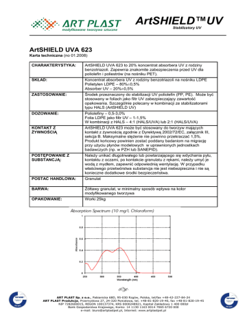 ArtSHIELD™UV Stabilizatory UV ArtSHIELD UVA 623 Karta techniczna (no 01.2008) CHARAKTERYSTYKA: ArtSHIELD UVA 623 to 20% koncentrat absorbera UV z rodziny benzotriazoli. Zapewnia znakomite zabezpieczenia przed UV dla poliolefin i poliestrów (na nośniku PET). SKŁAD: Koncentrat absorbera UV z rodziny benzotriazoli na nośniku LDPE Polietylen LDPE – 80%±0,5% Absorber UV – 20%±0,5% ZASTOSOWANIE: Środek przeznaczony do stabilizacji UV poliolefin (PP, PE). Może być stosowany w foliach jako filtr UV zabezpieczający zawartość opakowania. Szczególnie polecany w kombinacji ze stabilizatorami typu HALS (ArtSHIELD UV) DOZOWANIE: Poliolefiny – 0,5-3,0% Folia LDPE jako filtr UV – 1-1,5% W kombinacji z HALS – 4:1 (HALS/UVA) lub 2:1 (HALS/UVA) KONTAKT Z ŻYWNOŚCIĄ ArtSHIELD UVA 623 może być stosowany do tworzyw mających kontakt z żywnością zgodnie z Dyrektywą 2002/72/EC, załącznik III, sekcja B. Maksymalne stężenie nie powinno przekraczać 1,5%. Produkt końcowy powinien zostać poddany badaniom na migrację przy użyciu płynów modelowych w uprawnionych jednostkach badawczych (np. w PZH lub SANEPID). POSTĘPOWANIE Z SUBSTANCJĄ: Należy unikać długotrwałego lub powtarzającego się wdychania pyłu, kontaktu z oczami, po kontakcie granulatu z rękami, należy umyć je wodą z mydłem, zapewnić odpowiednią wentylację. W przypadku właściwego przetwórstwa substancja nie jest niebezpieczna i nie są konieczne dodatkowe środki bezpieczeństwa. POSTAĆ HANDLOWA: Granulat BARWA: Żółtawy granulat, w minimalny sposób wpływa na kolor modyfikowanego tworzywa OPAKOWANIE: Worki 25kg ART PLAST Sp. z o.o., Pabianicka 68D, 95-030 Rzgów, Polska, tel/fax +48-42-227-84-24 ART PLAST Produkcja, Przemysłowa 27, 24-320 Poniatowa, tel. +48-81-820-19-40, fax +48-81-820-19-45 NIP 7282600015, REGON 100137374, KRS 0000248921, Kapitał Zakładowy 1 400 000zł Bank Gospodarstwa Krajowego, Konto: 14 1130 1163 0014 7065 6720 000 e-mail: [email protected], Internet: www.artplastpet.pl