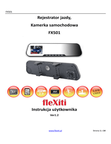 FX501 Rejestrator jazdy, Kamerka samochodowa FX501 Instrukcja użytkownika Ver1.2 www.flexiti.pl Strona 1 z 14 FX501 Wstęp Cyfrowa kamera FX501 HD (wysokiej rozdzielczości) jest wykonana z wykorzystaniem najnowszych technologii. Może służyć zarówno jako kamera HD, kamerka PC jak również jako profesjonalna kamerka samochodowa. Ta kamerka samochodowa (nazywana też rejestrator jazdy lub wideo rejestrator) nagrywa w rozdzielczości do 1280x720 pikseli. Używając karty MicroSD jako pamięci do przechowywania nagrań, przy równoczesnym małym poborze energii, kamera HD może nagrywać obraz wideo, audio i robić zdjęcia, po czym zapisywać je na karcie pamięci.. Wideo może być sprawdzane bezpośrednio na wyświetlaczu, a oglądane na ekranie telewizora podłączonego za pomocą kabla HDMI, lub przeglądane i kopiowane za pomocą komputera. Kamerka ta oczywiście spełnia jeszcze rolę lusterka wstecznego o dużej powierzchni widzenia. Uwaga: Kamerka-lusterko nie jest produktem wodo-odpornym, wobec czego powinna być instalowana tylko i wyłącznie wewnątrz samochodu lub w pomieszczeniu. www.flexiti.pl Strona 2 z 14 FX501 Zawartość opakowania z kamerką FX501 W zestawie znajduje się: - kamerka lusterko, - kabelek do przyłączenia zasilania z gniazda zapalniczki - kabelek USB - angielska i polska instrukcja www.flexiti.pl Strona 3 z 14 FX501 1. Instrukcja instalacji i. Wyłącz silnik samochodu lub odłącz kamerę od zasilania. ii. Włóż kartę MicroSD w slot. [Uwaga] Proszę użyć karty MicroSD klasa 6 lub wyższa, i o pojemności nie mniejszej niż 1 GB. Urządzenie obsługuje karty MicroSD o pojemności 32GB maksymalnie. ii. Podłącz kamerę na stałe do instalacji 12V lub do gniazda zapalniczki dołączonym przewodem. W każdym wypadku niezbędne jest użycie zasilacza zamontowanego w dostarczonym wtyku do gniazda zapalniczki (zamiana 12V na 5V). [Uwaga] Kabel zasilający USB nie powinien zwisać na przedniej szybie samochodu. iv. Zależnie od potrzeb wyreguluj ustawienie kamery. v. Uruchom silnik. [Uwaga] Jeśli kamera jest ustawiona I zainstalowana prawidłowo, kamera automatycznie wejdzie w tryb nagrywania w momencie uruchomienia silnika. Sprawdź na ekranie LCD obraz, dostosuj również ustawienia dostępne w Menu urządzenia. Przydatne informacje Aby nagrania z kamerki były prawidłowe i bez zacięć należy zastosować dobrej jakości kartę MicroSD, o dużej prędkości zapisu. Czytaj więcej tu... Dobrze zaprogramowana kamerka samochodowa po uruchomieniu samochodu zaczyna automatycznie rejestrację, a kończy kilkanaście sekund po wyłączeniu silnika (nie wymaga ingerencji) Uaktywnienie opcji wykrywania ruchu może spowodować nieciągłość nagrania, gdyż kamerka nagrywać będzie tylko w przypadku wykrycia ruchu. Tryb ten pozwala oszczędzać miejsce na karcie SD, jednakże nie zapewnia ciągłości. Kamera automatycznie nagrywa wszystkie nagranie w trybie cyklicznym. Oznacza to że w przypadku braku wolnego miejsca kasowane będą najstarsze nagrania, a w ich miejsce nagrywane nowe. Kamera zaopatrzona jest również w detekcję niskiego napięcia baterii, i w razie wykrycia takiej sytuacji automatycznie kończy zapis. Doświetlenie nocne, czy też nazywane inaczej "night vision" jest tylko elementem marketingu Chińskich producentów. Zakres takiego doświetlenia zamyka się w obszarze do 1 metra (a czasami dużo mniej) i jego funkcjonalność jest znikoma. Nie są nam znane kamerki samochodowe które rzeczywiście "widzą" w nocy (kamery noktowizyjne to potrafią, jest to jednak zupełnie inna półka cenowa).Jakość obrazu nocą zależeć będzie głównie od oświetlenia zewnętrznego np. lampy uliczne, reflektory samochodów. www.flexiti.pl Strona 4 z 14 FX501 Cechy rejestratora: Szerokokątny obiektyw o kącie widzenia 120 stopni. Rozdzielczość: do 1280×720P Zaawansowany kodek kompresji AVI@MJPG Aparat do wykonywania pojedynczych zdjęć 2.7 calowy wyświetlacz LCD TFT, podgląd w czasie nagrywania. Diody podświetlania dla nagrań przy słabym oświetleniu.( Flash Light) Do wyboru jakość nagrywanego materiału wideo. 25 ramek na sekundę zapewnia płynny obraz wideo. Specjalny samochodowy uchwyt mocujący do istniejącego lusterka. Zabezpieczenie nagrań, nawet w przypadku nagłego wypadku nagrania wideo są zabezpieczone. Spójność nagrań wideo (brak przerw w nagraniach). Zasilanie bezpośrednio z gniazdka zapalniczki, szybkie podłączenie I nagrywanie w czasie jazdy. Automatyczne uruchamianie nagrywania w momencie uruchomienia silnika (również automatyczne wyłączanie po jego wyłączenia) Nagrywanie w pętli, z możliwością ustawienia długości fragmentów wideo. Możliwość sprawdzania wideo w czasie nagrywania. Nagrywanie daty i czasu na nagranym materiale wideo. Ustawiany czas nagrywanych sekwencji wideo. Funkcja zdjęć Ładowanie akumulatorka poprzez złącze USB (5V, 500mA). Nagrywania na karcie Micro SD, do 32GB pojemności. www.flexiti.pl Strona 5 z 14 FX501 Opis przycisków i złączy www.flexiti.pl Strona 6 z 14 FX501 Użytkowanie rejestratora, kamerki samochodowej Ładowanie baterii poza samochodem Wskaźnik naładowania baterii: o pełna połowa niski poziom pusta Rejestrator może być ładowany poprzez podłączenie kablem USB z komputerem, lub za pomocą odpowiedniego zasilacza ze złączem USB. Podłączenie do instalacji samochodu 12/24V oraz ładowanie baterii w samochodzie Rejestrator ładuje się automatycznie w trakcie użytkowania Gdy chcemy używać kamerkę w czasie jazdy należy uaktywnić nagrywanie cyrkulacyjne oraz automatyczne włączenie nagrywania po włączeniu zasilania (silnika). Spowoduje to rozpoczęcie nagrywania po włączeniu silnika samochodu i zakończenie kilka sekund po jego wyłączeniu. Przed wyłączeniem cały materiał wideo zostanie zapisany automatycznie na karcie SD. UWAGA: Tylko kabelki połączeniowe z napięciem wyjściowym 5V mogą być użyte do zasilania kamery, zastos