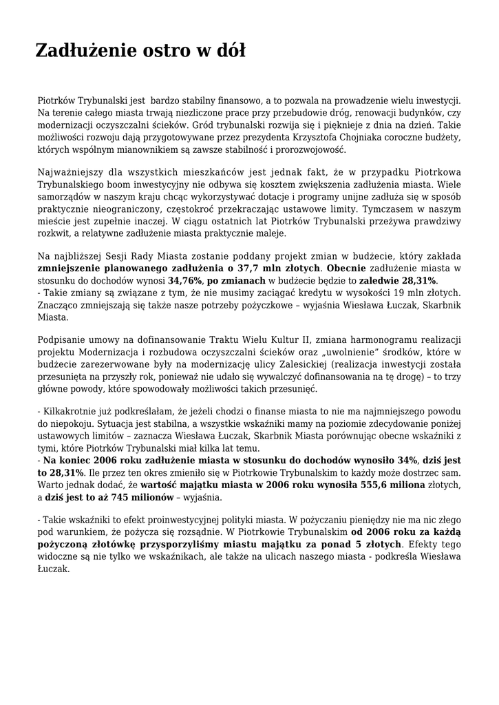 Zadłużenie ostro w dół Piotrków Trybunalski jest bardzo stabilny finansowo, a to pozwala na prowadzenie wielu inwestycji. Na terenie całego miasta trwają niezliczone prace przy przebudowie dróg, renowacji budynków, czy modernizacji oczyszczalni ścieków. Gród trybunalski rozwija się i pięknieje z dnia na dzień. Takie możliwości rozwoju dają przygotowywane przez prezydenta Krzysztofa Chojniaka coroczne budżety, których wspólnym mianownikiem są zawsze stabilność i prorozwojowość. Najważniejszy dla wszystkich mieszkańców jest jednak fakt, że w przypadku Piotrkowa Trybunalskiego boom inwestycyjny nie odbywa się kosztem zwiększenia zadłużenia miasta. Wiele samorządów w naszym kraju chcąc wykorzystywać dotacje i programy unijne zadłuża się w sposób praktycznie nieograniczony, częstokroć przekraczając ustawowe limity. Tymczasem w naszym mieście jest zupełnie inaczej. W ciągu ostatnich lat Piotrków Trybunalski przeżywa prawdziwy rozkwit, a relatywne zadłużenie miasta praktycznie maleje. Na najbliższej Sesji Rady Miasta zostanie poddany projekt zmian w budżecie, który zakłada zmniejszenie planowanego zadłużenia o 37,7 mln złotych. Obecnie zadłużenie miasta w stosunku do dochodów wynosi 34,76%, po zmianach w budżecie będzie to zaledwie 28,31%. - Takie zmiany są związane z tym, że nie musimy zaciągać kredytu w wysokości 19 mln złotych. Znacząco zmniejszają się także nasze potrzeby pożyczkowe – wyjaśnia Wiesława Łuczak, Skarbnik Miasta. Podpisanie umowy na dofinansowanie Traktu Wielu Kultur II, zmiana harmonogramu realizacji projektu Modernizacja i rozbudowa oczyszczalni ścieków oraz „uwolnienie” środków, które w budżecie zarezerwowane były na modernizację ulicy Zalesickiej (realizacja inwestycji została przesunięta na przyszły rok, ponieważ nie udało się wywalczyć dofinansowania na tę drogę) – to trzy główne powody, które spowodowały możliwości takich przesunięć. - Kilkakrotnie już podkreślałam, że jeżeli chodzi o finanse miasta to nie ma najmniejszego powodu do niepokoju. Sytuacja jest stabilna, a wszystkie wskaźniki mamy na poziomie zdecydowanie poniżej ustawowych limitów – zaznacza Wiesława Łuczak, Skarbnik Miasta porównując obecne wskaźniki z tymi, które Piotrków Trybunalski miał kilka lat temu. - Na koniec 2006 roku zadłużenie miasta w stosunku do dochodów wynosiło 34%, dziś jest to 28,31%. Ile przez ten okres zmieniło się w Piotrkowie Trybunalskim to każdy może dostrzec sam. Warto jednak dodać, że wartość majątku miasta w 2006 roku wynosiła 555,6 miliona złotych, a dziś jest to aż 745 milionów – wyjaśnia. - Takie wskaźniki to efekt proinwestycyjnej polityki miasta. W pożyczaniu pieniędzy nie ma nic złego pod warunkiem, że pożycza się rozsądnie. W Piotrkowie Trybunalskim od 2006 roku za każdą pożyczoną złotówkę przysporzyliśmy miastu majątku za ponad 5 złotych. Efekty tego widoczne są nie tylko we wskaźnikach, ale także na ulicach naszego miasta - podkreśla Wiesława Łuczak.