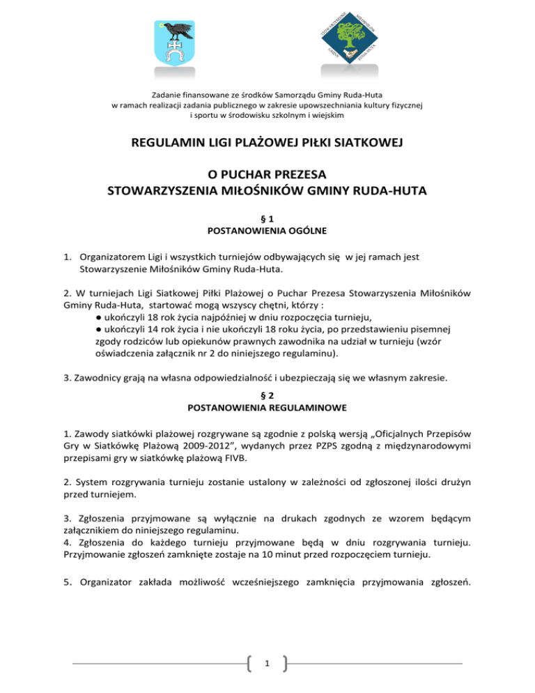 Zadanie finansowane ze środków Samorządu Gminy Ruda-Huta w ramach realizacji zadania publicznego w zakresie upowszechniania kultury fizycznej i sportu w środowisku szkolnym i wiejskim REGULAMIN LIGI PLAŻOWEJ PIŁKI SIATKOWEJ O PUCHAR PREZESA STOWARZYSZENIA MIŁOŚNIKÓW GMINY RUDA-HUTA §1 POSTANOWIENIA OGÓLNE 1. Organizatorem Ligi i wszystkich turniejów odbywających się w jej ramach jest Stowarzyszenie Miłośników Gminy Ruda-Huta. 2. W turniejach Ligi Siatkowej Piłki Plażowej o Puchar Prezesa Stowarzyszenia Miłośników Gminy Ruda-Huta, startować mogą wszyscy chętni, którzy : ● ukończyli 18 rok życia najpóźniej w dniu rozpoczęcia turnieju, ● ukończyli 14 rok życia i nie ukończyli 18 roku życia, po przedstawieniu pisemnej zgody rodziców lub opiekunów prawnych zawodnika na udział w turnieju (wzór oświadczenia załącznik nr 2 do niniejszego regulaminu). 3. Zawodnicy grają na własna odpowiedzialność i ubezpieczają się we własnym zakresie. §2 POSTANOWIENIA REGULAMINOWE 1. Zawody siatkówki plażowej rozgrywane są zgodnie z polską wersją „Oficjalnych Przepisów Gry w Siatkówkę Plażową 2009-2012”, wydanych przez PZPS zgodną z międzynarodowymi przepisami gry w siatkówkę plażową FIVB. 2. System rozgrywania turnieju zostanie ustalony w zależności od zgłoszonej ilości drużyn przed turniejem. 3. Zgłoszenia przyjmowane są wyłącznie na drukach zgodnych ze wzorem będącym załącznikiem do niniejszego regulaminu. 4. Zgłoszenia do każdego turnieju przyjmowane będą w dniu rozgrywania turnieju. Przyjmowanie zgłoszeń zamknięte zostaje na 10 minut przed rozpoczęciem turnieju. 5. Organizator zakłada możliwość wcześniejszego zamknięcia przyjmowania zgłoszeń. 1 Zadanie finansowane ze środków Samorządu Gminy Ruda-Huta w ramach realizacji zadania publicznego w zakresie upowszechniania kultury fizycznej i sportu w środowisku szkolnym i wiejskim 6. Każdy turniej stanowi zamknięte zawody. 7. Punktacja za miejsce w turnieju liczona do systemu Ligi: 1 miejsce 2 miejsce 3 miejsce 4 miejsce 5 miejsce – 10 pkt – 7 pkt – 4 pkt – 2 pkt – 1 pkt 8. Przy systemie pucharowym rozgrywek punktów za zajęcie miejsc 4 i 5 dla kilku drużyn. zakłada się możliwość przyznania 9. Za udział w wszystkich turniejach Ligi drużyna premiowana jest dodatkowymi 4 punktami wliczanymi do systemu punktowego Ligi. 10. Każdy zespół ma prawo do jednej przerwy 2-minutowej w każdym secie. 11. Zawody sędziują osoby wyznaczone przez Organizatora. 12. W trakcie Ligi dopuszczalna jest 1 (jedna) zmiana zawodnika w składzie drużyny. Zmiana więcej niż jednego zawodnika skutkuje nie przyznaniem ewentualnej premii dla drużyny za udział we wszystkich turniejach Ligi. §3 POSTANOWIENIA KOŃCOWE 1. Organizatorzy rezerwują sobie prawo do zdyskwalifikowania zespołu w przypadku stwierdzenia wprowadzenia do gry zawodnika nie zgłoszonego uprzednio na formularzu zgłoszeniowym lub w przypadku gdy zawodnicy drużyny swoją grą utrudniają przeprowadzenie zawodów. 2. Organizatorzy zastrzegają sobie prawo wprowadzania zmian do niniejszego regulaminu oraz modyfikacji przepisów gry obowiązujących podczas turniejów Ligi. 3. W sprawach spornych nie objętych Organizator lub osoby przez niego wskazane. 2 niniejszym regulaminem decyduje Zadanie finansowane ze środków Samorządu Gminy Ruda-Huta w ramach realizacji zadania publicznego w zakresie upowszechniania kultury fizycznej i sportu w środowisku szkolnym i wiejskim Załącznik nr 1 do Regulaminu Ligi Siatkowej Piłki Plażowej o Puchar Prezesa Stowarzyszenia Miłośników Gminy Ruda-Huta KARTA ZGŁOSZENIA DO TURNIEJU NR ……. ODBYWAJĄCEGO SIĘ DNIA…………………………W MIEJSCOWOŚCI………………………….. Własnoręcznymi podpisami oświadczamy, że nie mamy żadnych przeciwwskazań zdrowotnych do gry oraz znane są nam warunki uczestnictwa w TURNIEJU SIATKOWEJ PIŁKI PLAŻOWEJ rozgrywanego w ramach LIGI PLAŻOWEJ PIŁKI SIATKOWEJ O PUCHAR PREZESA STOWARZYSZENIA MIŁOŚNIKÓW GMINY RUDA-HUTA, akceptujemy i zobowiązujemy się przestrzegać regulamin turnieju. Nazwa drużyny................................................................................................................................... Lp. imię i nazwisko data urodzenia 1. 2. CZYTELNE podpis y zawodników: 1………………………………………………………………. 2………………………………………………………………. 3 Zadanie finansowane ze środków Samorządu Gminy Ruda-Huta w ramach realizacji zadania publicznego w zakresie upowszechniania kultury fizycznej i sportu w środowisku szkolnym i wiejskim Załącznik nr 2 do Regulaminu Ligi Siatkowej Piłki Plażowej o Puchar Prezesa Stowarzyszenia Miłośników Gminy Ruda-Huta OŚWIADCZENIE RODZICA / OPIEKUNA PRAWNEGO ZAWODNIKA/ÓW UCZESTNICZĄCYCH W TURNIEJU PIŁKI SIATKOWEJ PLAŻOWEJ Jako rodzic/opiekun prawny zawodnika uczestniczącego w TURNIEJU SIATKOWEJ PIŁKI PLAŻOWEJ rozgrywanego w ramach LIGI PLAŻOWEJ PIŁKI SIATKOWEJ O PUCHAR PREZESA STOWARZYSZENIA MIŁOŚNIKÓW GMINY RUDA-HUTA oświadczam, że znane są mi warunki uczestnictwa oraz zasady jego rozgrywania. Po zapoznaniu się z nimi wyrażam zgodę na uczestnictwo w turnieju/turniejach mojego dziecka/podopiecznego …………………………………......, imię i nazwisko dziecka który nie ma przeciwwskazań zdrowotnych do uczestnictwa w tego typu zawodach. Lp. Nazwisko i Imię rodzica/opiekuna prawnego Nr dowodu osobistego 1. 4 Podpis
