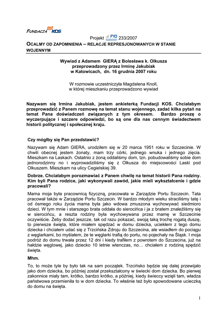 FUNDACJA Projekt 233/2007 OCALMY OD ZAPOMNIENIA – RELACJE REPRESJONOWANYCH W STANIE WOJENNYM Wywiad z Adamem GIERĄ z Bolesława k. Olkusza przeprowadzony przez Irminę Jakubiak w Katowicach, dn. 16 grudnia 2007 roku W rozmowie uczestniczyła Magdalena Knoll, w której mieszkaniu przeprowadzono wywiad Nazywam się Irmina Jakubiak, jestem ankieterką Fundacji KOS. Chciałabym przeprowadzić z Panem rozmowę na temat stanu wojennego, zadać kilka pytań na temat Pana doświadczeń związanych z tym okresem. Bardzo proszę o wyczerpujące i szczere odpowiedzi, bo są one dla nas cennym świadectwem historii politycznej i społecznej kraju. Czy mógłby się Pan przedstawić? Nazywam się Adam GIERA, urodziłem się w 20 marca 1951 roku w Szczecinie. W chwili obecnej jestem żonaty, mam trzy córki, jednego wnuka i jednego zięcia. Mieszkam na Laskach. Ostatnio z żoną oddaliśmy dom, tzn. pobudowaliśmy sobie dom jednorodzinny no i wyprowadziliśmy się z Olkusza do miejscowości Laski pod Olkuszem. Mieszkam na ulicy Cegielskiej 39. Dobrze. Chciałabym porozmawiać z Panem chwilę na temat historii Pana rodziny. Kim byli Pana rodzice, jaki wykonywali zawód, jakie mieli wykształcenie i gdzie pracowali? Mama moja była pracownicą fizyczną, pracowała w Zarządzie Portu Szczecin. Tata pracował także w Zarządzie Portu Szczecin. W bardzo młodym wieku straciliśmy tatę i od ósmego roku życia mama była jako wdowa zmuszona wychowywać siedmioro dzieci. W tym mnie i starszego brata oddała do sierocińca i ja z bratem znaleźliśmy się w sierocińcu, a reszta rodziny była wychowywana przez mamę w Szczecinie oczywiście. Żeby dodać jeszcze, tak od razu pokazać, swoją taką trochę rogatą duszę, to pierwsze święta, które miałem spędzać w domu dziecka, uciekłem z tego domu dziecka i chciałem udać się z Trzcińska Zdroju do Szczecina, ale wsiadłem do pociągu z węglarkami, bo myślałem, że te węglarki trafią do portu, no pojechały na Śląsk. I moja podróż do domu trwała przez 12 dni i kiedy trafiłem z powrotem do Szczecina, już na hałdzie węglowej, jako dziecko 10 letnie wtenczas, no… chciałem z rodziną spędzić święta. Mhm. To, to może tyle by było tak na sam początek. Trzcińsko będzie się dalej przewijało jako dom dziecka, bo później został przekształcony w świecki dom dziecka. Bo pierwej zakonnice miały tam, krótko, bardzo krótko, a później, kiedy świeccy wzięli tam, władza państwowa przemieniła to w dom dziecka. To właśnie też było spowodowane ucieczką do domu na święta. 1 Mhm. Gdzie mieszkali Pana rodzice i jak długo? Mój tata, to jest bardzo barwna postać, bo tata urodził się w Rikenhausen. Kiedy Adolf Hitler doszedł do władzy, tatuś uciekł od swojej pierwszej żony i wylądował w Legii Cudzoziemskiej. Po skończonej wojnie przyjechał do Polski, bo poznał naszą mamę, 18 lat młodszą od siebie, no i się związali. Mieszkali krótko w województwie lubelskim, bo moja mama pochodziła tam od strony kresów. Przeprowadzili się do Szczecina, no i w Szczecinie właśnie żyliśmy i mieszkaliśmy do śmierci taty. Później, powiedziałem, był etap pobytu w domu dziecka. Czy mógłby Pan opowiedzieć mi o swoim domu rodzinnym, czy Pana rodzice byli zaangażowani w działalność społeczną, jeśli tak, to w jakim okresie i jakiego rodzaju była to działalność? Prawdopodobnie, prawdopodobnie. Bo ja jako dziecko tego nie pamiętam, jak były w 50 latach strajki to prawdopodobnie udział w strajkach brał też tata jako operator dźwigu, stąd później nagła śmierć taty w niewyjaśnionych okolicznościach do dziś dnia. Mama pracowała w porcie jako pracownik fizyczny na hali magazynowej. Była prostą, uczciwą kobietą i tak jak powiedziałem, wychowywała dzieci sama. Mhm. Czy Pana rodzice byli w PZPR, ZSL, SD? Nie, nie, nie. Takich akurat, takich w tym momencie kierunków nie było. Jakie wartości były w Pana rodzinie szczególnie ważne? No, u mnie w rodzinie to zawsze był na pierwszym miejscu kult mamy. No i… Trzeba powiedzieć, że, żeby oddać obraz, to tylko powiem, że wszystkie, żeby oddać obraz, jak to jest. To jedna z sióstr jest Teresa, druga Małgorzata, trzecia Maria, Bogusława, Jerzy, Adam, Szymon, ja, Ferdynand, Michał no to… to są imiona raczej, które kierunkują światopogląd osoby. To porozmawiajmy teraz na temat Pana działalności społecznej i opozycyjnej. Do jakich należał Pan organizacji społecznych, młodzieżowych, kościelnych? Nie. Ja, tak się złożyło, że do dzisiaj do żadnej partii nie należałem, nie należę i nie będę należał. Byłem działaczem związkowym tylko i wyłącznie. Był epizod, był epizod w moim życiu, że kiedy po rozruchach grudniowych w Szczecinie nie mogłem dostać pracy, to taki bardzo dawny znajomy mój, z kiedy graliśmy w piłkę ręczną w szkolnym kole sportowym, kiedy zobaczył, że w przeciągu 6 miesięcy próbowałem się przyjąć do 12 zakładów pracy, lub też popracowałem 2 tygodnie i byłem zwalniany. No zwalniany byłem za określone, przepraszam, że to tak dobitnie nazwę, za niewyparzoną buzię. On był działaczem tym ZMP-owskim, takim - jak to się ich nazywało wtenczas - wilczki stalinowskie. Załatwił mi, że jeżeli będę miał buzię zamkniętą, to on mi da szansę, że będę mógł sobie pożyć i popracować. I dał mi takie lewe skierowanie na budowę Huty Breżniew, później się okazało to nie była Huta Breżniew tylko Katowice. I to było, że ja wyjechałem ze Szczecina tutaj na Śląsk, do budowy tej Huty Katowice. Działalnością, można powiedzieć, to moją był nieudany epizod życiowy, start mój życiowy. Ja wyjeżdżałem z domu rodzinnego, to był marzec, krótko przed moimi urodzinami, przed 20 marca, z domu rodzinnego w jednych butach, w jednych skarpetkach, w jednych spodniach, koszula i sweter. Za paskiem miałem dokumenty i w kieszeni miałem 13 złotych. Tak