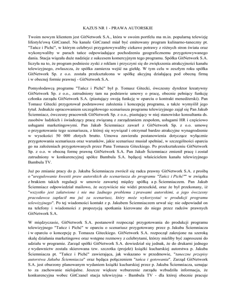 KAZUS NR 1 - PRAWA AUTORSKIE Twoim nowym klientem jest GitNetwork S.A., która w swoim portfelu ma m.in. popularną telewizję lifestyle'ową GitCzanel. Na kanale GitCzanel miał być emitowany program kulinarno-taneczny pt. "Tańcz i Pichć", w którym celebryci przygotowywaliby ciekawe potrawy z różnych stron świata oraz wykonywaliby w parach tańce odpowiadające pochodzeniu geograficznemu przygotowywanego dania. Stacja wiązała duże nadzieje z sukcesem komercyjnym tego programu. Spółka GitNetwork S.A. liczyła na to, że program podniesie zyski z reklam i przyczyni się do zwiększenia atrakcyjności kanału telewizyjnego, zwłaszcza, że spółka zamierza wejść na giełdę. W tym celu w zeszłym roku spółka GitNetwork Sp. z o.o. została przekształcona w spółkę akcyjną działającą pod obecną firmą i w obecnej formie prawnej - GitNetwork S.A. Pomysłodawcą programu "Tańcz i Pichć" był p. Tomasz Gitecki, ówczesny dyrektor kreatywny GitNetwork Sp. z o.o., zatrudniony tam na podstawie umowy o pracę, obecnie pełniący funkcję członka zarządu GitNetwork S.A. (piastujący swoją funkcję w oparciu o kontrakt menedżerski). Pan Tomasz Gitecki przygotował podstawowe założenia i koncepcję programu, a także wymyślił jego tytuł. Jednakże opracowaniem szczegółowego scenariusza programu telewizyjnego zajął się Pan Jakub Ściemniacz, ówczesny pracownik GitNetwork Sp. z o.o., piastujący w niej stanowisko konsultanta ds. zasobów ludzkich i świadczący pracę związaną z zarządzaniem zespołem, usługami HR i częściowo usługami marketingowymi. Pan Jakub Ściemniacz zawarł z GitNetwork Sp. z o.o. umowę o przygotowanie tego scenariusza, z której się wywiązał i otrzymał bardzo atrakcyjne wynagrodzenie w wysokości 50 000 złotych brutto. Umowa zawierała postanowienia dotyczące wyłącznie przygotowania scenariusza oraz warunków, jakie scenariusz musiał spełniać, w szczególności oparcia go na założeniach przygotowanych przez Pana Tomasza Giteckiego. Po przekształceniu GitNetwork Sp. z o.o. w obecną formę prawną GitNetwork S.A. Pan Jakub Ściemniacz zmienił pracę i został zatrudniony w konkurencyjnej spółce Bambula S.A. będącej właścicielem kanału telewizyjnego Bambula TV. Już po zmianie pracy do p. Jakuba Ściemniacza zwrócił się radca prawny GitNetwork S.A. z prośbą o "uregulowanie kwestii praw autorskich do scenariusza do programu "Tańcz i Pichć"" w związku z brakiem takich regulacji w umowie zawartej między spółką a p. Ściemniaczem. Pan Jakub Ściemniacz odpowiedział mailowo, że oczywiście nie widzi przeszkód, oraz że był przekonany, iż "wszystko jest załatwione i nie ma żadnego problemu z prawami autorskimi, a jego ówczesny pracodawca zapłacił mu już za scenariusz, który może wykorzystać w produkcji programu telewizyjnego". Po tej wiadomości kontakt z p. Jakubem Ściemniaczem urwał się: nie odpowiadał on na telefony i wiadomości z propozycją spotkania kierowane do niego przez radców prawnych GitNetwork S.A. W międzyczasie, GitNetwork S.A. postanowił rozpocząć przygotowania do produkcji programu telewizyjnego "Tańcz i Pichć" w oparciu o scenariusz przygotowany przez p. Jakuba Ściemniacza i w oparciu o koncepcję p. Tomasza Giteckiego. GitNetwork S.A. rozpoczął zakrojone na szeroką skalę działania marketingowe oraz wstępne rozmowy z celebrytami, którzy mieliby być zaproszeni do udziału w programie. Zarząd spółki GitNetwork S.A. dowiedział się jednak, że do drukarni jednego z wydawnictw została skierowana tzw. szczotka (projekt) książki kucharskiej autorstwa p. Jakuba Ściemniacza pt. "Tańcz i Pichć" zawierająca, jak wskazano w przedmowie, "taneczne przepisy autorstwa Jakuba Ściemniacza" oraz będąca połączeniem "tańca i gotowania". Zarząd GitNetwork S.A. jest oburzony planowanym wydaniem książki kucharskiej przez p. Jakuba Ściemniacza, uznając to za zachowanie nielojalne. Jeszcze większe wzburzenie zarządu wzbudziła informacja, że konkurencyjna wobec GitCzanel stacja telewizyjna - Bambula TV - dla której obecnie pracuje p. Jakub Ściemniacz, zamierza wyprodukować bardzo podobny program telewizyjny pod tym samym tytułem - "Tańcz i Pichć". Program produkowany przez Bambula TV tylko w bardzo niewielkim stopniu różni się od programu przygotowywanego przez GitCzanel, jest w znacznej mierze oparty na pomyśle pana Tomasza Giteckiego i prawie w całości oparty na scenariuszu przygotowanym przez p. Jakuba Ściemniacza. Z informacji pozyskanych przez "życzliwe osoby" pracujące w Bambula TV wynika, że w biurze i na służbowej skrzynce pocztowej p. Jakuba Ściemniacza jest mnóstwo materiałów dotyczących programu stworzonych jeszcze w czasach jego pracy na rzecz GitNetwork S.A. Proszę sporządzić opinię prawną dla Zarządu GitNetwork S.A., w której znajdą się rekomendacje co do dalszych działań w sprawie. Proszę przyjąć, że GitNetwork S.A. zależy na jak najszybszym zablokowaniu produkcji konkurencyjnego programu telewizyjnego oraz niedopuszczeniu do sprzedaży książki kucharskiej autorstwa p. Jakuba Ściemniacza, a także iż GitNetwork S.A. nie zamierza rezygnować z rozpoczętej już własnej produkcji. Proszę w szczególności wskazać, czy doszło do naruszenia praw autorskich GitNetwork S.A. lub ewentualnie innych praw tej spółki; jeśli tak, to w jakim zakresie, przez kogo, i jakie środki należy podjąć, aby powstrzymać ewentualne naruszenie. Proszę również wskazać, do kogo należą prawa do poszczególnych istotnych biznesowo dóbr niematerialnych opisanych w stanie faktycznym. Opinia powinna także zawierać rekomendacje co do możliwych działań procesowych przeciwko podmiotom mogącym naruszać prawa GitNetwork S.A. Opinię proszę przygotować z uwzględnieniem wskazanych celów biznesowych GitNetwork S.A.
