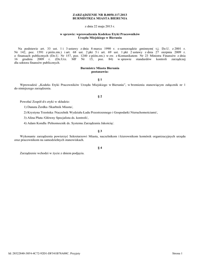 ZARZĄDZENIE NR B.0050.117.2013 BURMISTRZA MIASTA BIERUNIA z dnia 22 maja 2013 r. w sprawie: wprowadzenia Kodeksu Etyki Pracowników Urzędu Miejskiego w Bieruniu Na podstawie art. 33 ust. 1 i 3 ustawy z dnia 8 marca 1990 r. o samorządzie gminnym( t.j. Dz.U. z 2001 r. Nr 142, poz. 1591 z późn.zm.) i art. 68 ust. 2 pkt 5 i art. 69 ust. 1 pkt 2 ustawy z dnia 27 sierpnia 2009 r. o finansach publicznych (Dz.U. Nr 157, poz. 1240 z późn.zm.) w zw. z Komunikatem Nr 23 Ministra Finansów z dnia 16 grudnia 2009 r. (Dz.Urz. MF Nr 15, poz. 84) w sprawie standardów kontroli zarządczej dla sektora finansów publicznych. Burmistrz Miasta Bierunia postanawia: §1 Wprowadzić „Kodeks Etyki Pracowników Urzędu Miejskiego w Bieruniu”, w brzmieniu stanowiącym załącznik nr 1 do niniejszego zarządzenia. §2 Powołać Zespół d/s etyki w składzie: 1) Danuta Żerdka /Skarbnik Miasta/, 2) Krystyna Trzońska /Naczelnik Wydziału Ładu Przestrzennego i Gospodarki Nieruchomościami/, 3) Alina Pluta /Główny Specjalista ds. kontroli/, 4) Adam Kondla /Pełnomocnik ds. Systemu Zarządzania Jakością/. §3 Wykonanie zarządzenia powierzyć Sekretarzowi Miasta, naczelnikom i kierownikom komórek organizacyjnych urzędu oraz pracownikom na samodzielnych stanowiskach. §4 Zarządzenie wchodzi w życie z dniem podjęcia. Id: 28522840-38F4-4C72-92D1-DF541B78A00C. Przyjety Strona 1 Załącznik Nr 1 do Zarządzenia Nr B.0050.117.2013 Burmistrza Miasta Bierunia z dnia 22 maja 2013 r. Kodeks Etyki Pracowników Urzędu Miejskiego w Bieruniu PREAMBUŁA Kodeks etyki jest zbiorem norm moralnych, którymi powinni kierować się pracownicy Urzędu Miejskiego w Bieruniu w kontaktach z Klientami oraz w relacjach pomiędzy Pracownikami. ROZDZIAŁ 1 Ilekroć w Kodeksie jest mowa o: 1. 2. 3. 4. urzędzie – należy przez to rozumieć Urząd Miejski w Bieruniu, kodeksie – należy przez to rozumieć Kodeks Etyki Pracowników Urzędu Miejskiego w Bieruniu, pracowniku – należy przez to rozumieć pracowników, zatrudnionych w Urzędzie Miejskim w Bieruniu, kliencie – należy przez to rozumieć osobę fizyczną i prawną, która załatwia sprawę lub współpracuje z Urzędem Miejskim w Bieruniu. ROZDZIAŁ 2 Pracownik Urzędu Miejskiego w Bieruniu jest zobowiązany kierować się w swoim postępowaniu w szczególności zasadami: 1. praworządności, 2. bezstronności i bezinteresowności, 3. uczciwości i rzetelności, 4. odpowiedzialności, 5. obiektywizmu i neutralności, 6. jawności i otwartości, 7. dbałości o dobre imię urzędu, 8. uprzejmości i życzliwości. ROZDZIAŁ 3 Zgodnie z zasadami wymienionymi w rozdziale 2 przestrzegamy następujących postanowień: 1. 2. 3. 4. 5. 6. 7. 8. 9. 10. 11. 12. 13. 14. 15. 16. 17. 18. Wykonując obowiązki służbowe kierujemy się interesem publicznym. Nie przyjmujemy od klientów żadnych korzyści materialnych bądź osobistych. Powierzone zadania wykonujemy starannie, według najlepszej wiedzy w oparciu o obowiązujące przepisy prawa. Sprawy rozpatrujemy niezwłocznie i rzetelnie. Nie podejmujemy prac będących w sprzeczności z obowiązkami pracowniczymi. Nie rozpatrujemy i nie załatwiamy spraw, które w jakikolwiek sposób wiążą się z naszym interesem osobistym. Nie manifestujemy swoich poglądów politycznych i sympatii politycznych. Zapewniamy poufność informacji nabytych podczas pełnienia obowiązków służbowych. Klientów traktujemy równo w sposób wolny od uprzedzeń, szanując ich godność i dobre imię. Dbamy o powierzone mienie. Środkami publicznymi gospodarujemy w sposób racjonalny, oszczędny, efektywny i terminowy. Jesteśmy gotowi do poniesienia odpowiedzialności za popełnione przez nas błędy oraz do natychmiastowego naprawienia ich skutków. Rozwijamy się zawodowo poprzez samokształcenie i udział w specjalistycznych szkoleniach. Dzielimy się swoim doświadczeniem i wiedzą ze współpracownikami. Wypełniamy polecenia służbowe, jeśli nie są one sprzeczne z prawem lub przyjętymi zasadami etycznymi. Nie ulegamy negatywnym emocjom, rozmowy przeprowadzamy spokojnie i rozważnie z poszanowaniem praw rozmówców. Jesteśmy lojalni w stosunku do przełożonych, podwładnych i współpracowników. Zachowujemy się uprzejmie, życzliwie, z godnością według zasad dobrego wychowania i wysokiej kultury osobistej. 1 Id: 28522840-38F4-4C72-92D1-DF541B78A00C. Przyjety Strona 1 ROZDZIAŁ 4 - Strój 1. 2. 3. 4. 5. 6. 7. Pracownicy stawiają się w pracy w stroju czystym i schludnym. Zarówno kobiety jak i mężczyzn obowiązuje w pracy ubiór klasyczny, zgodnie z przyjętymi zasadami Savoir Vivre. Kolorystyka stroju ma być stonowana, a noszona biżuteria skromna i nierzucająca się w oczy. Mężczyźni mają ubierać się w długie spodnie, koszulę i marynarkę, natomiast kobiety w żakiet i bluzkę lub bluzkę koszulową, spódnicę, sukienkę (o umiarkowanym dekolcie i długości) bądź długie spodnie. Zaleca się noszenie krawatów w przypadku mężczyzn (mile widziane, lecz nie wymagane). Strój nie może naruszać poczucia estetyki, zasad moralnych i etycznych. Na terenie urzędu, każdy z pracowników ma obowiązek noszenia identyfikatora osobistego w miejscu widocznym (załącznik nr 1). Wprowadza się ujednolicony strój pracowników tzw. pierwszego kontaktu (kancelaria, pracownicy ochrony - dozorcy). Stroje są zabezpieczone przez pracodawcę. ROZDZIAŁ 5 - Obsługa klienta 1. 2. 3. 4. W kontaktach z klientem, pracownik urzędu zobowiązany jest do uprzejmej, pełnej zrozumienia, służącej pomocą i wyczerpującej obsługi. W przypadku napotkania klienta, który wyraźnie nie ma orientacji gdzie załatwić sprawę lub w jaki sposób dotrzeć do danej komórki, każdy pracownik jest zobowiązany do doprowadzenia klienta do celu. W przypadku klientów niepełnosprawnych i starszych, klient ma być obsłużony w miejscu swego przybycia do urzędu. Pomocy udzielają mu w tym przypadku pracownicy kancelarii. W czasie rozmowy
