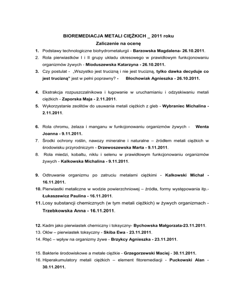 BIOREMEDIACJA METALI CIĘŻKICH _ 2011 roku Zaliczenie na ocenę 1. Podstawy technologiczne biohydrometalurgii - Barzowska Magdalena- 26.10.2011. 2. Rola pierwiastków I i II grupy układu okresowego w prawidłowym funkcjonowaniu organizmów żywych - Mioduszewska Katarzyna - 26.10.2011. 3. Czy postulat - „Wszystko jest trucizną i nie jest trucizną, tylko dawka decyduje co jest trucizną” jest w pełni poprawny? - Błochowiak Agnieszka - 26.10.2011. 4. Ekstrakcja rozpuszczalnikowa i ługowanie w uruchamianiu i odzyskiwaniu metali ciężkich - Zaporska Maja - 2.11.2011. 5. Wykorzystanie zeolitów do usuwania metali ciężkich z gleb - Wybraniec Michalina 2.11.2011. 6. Rola chromu, żelaza i manganu w funkcjonowaniu organizmów żywych - Wenta Joanna - 9.11.2011. 7. Środki ochrony roślin, nawozy mineralne i naturalne – źródłem metali ciężkich w środowisku przyrodniczym - Drzewoszewska Marta - 9.11.2011. 8. Rola miedzi, kobaltu, niklu i selenu w prawidłowym funkcjonowaniu organizmów żywych - Kalkowska Michalina - 9.11.2011. 9. Odtruwanie organizmu po zatruciu metalami ciężkimi - Kalkowski Michał 16.11.2011. 10. Pierwiastki metaliczne w wodzie powierzchniowej – źródła, formy występowania itp.Łukaszewicz Paulina - 16.11.2011. 11. Losy substancji chemicznych (w tym metali ciężkich) w żywych organizmach Trzebkowska Anna - 16.11.2011. 12. Kadm jako pierwiastek chemiczny i toksyczny- Bychowska Małgorzata-23.11.2011. 13. Ołów – pierwiastek toksyczny - Skiba Ewa - 23.11.2011. 14. Rtęć – wpływ na organizmy żywe - Brzykcy Agnieszka - 23.11.2011. 15. Bakterie środowiskowe a metale ciężkie - Grzegorzewski Maciej - 30.11.2011. 16. Hiperakumulatory metali ciężkich – element fitoremediacji - Puckowski Alan 30.11.2011. 17. Ochrona środowiska - interdyscyplinarna dziedzina badań i nauki – przykłady - Tyszka Dominika - 30.11.2011. 18. Oczyszczanie ścieków zawierających metale ciężkie - Dolińska Marta - 7.12.2011. 19. Klasyfikacja geochemiczna pierwiastków - Nachtigal Izabela - 7.12.2011. 20. Biosorpcja jako element oczyszczania ścieków i zatężania roztworów - Choszczyk Magdalena - 7.12.2011. 21. Gleba – podstawowy element środowiska w zakresie zatrzymywania i uruchamiania pierwiastków metalicznych - Roszkowska Justyna -14.12.2011. 22. Charakterystyka gleb - Pankavec Sviatlana - 14.12.2011. 23. Mechanizmy pobierania pierwiastków metalicznych z gleby przez rośliny Kozłowska Olga -14.12.2011. 24. Izotermy w określaniu pojemności sorpcyjnej gleb w stosunku do metali ciężkich – Bańkowska Małgorzata – 21.12.2011 25. Mikrobiologiczne ługowanie metali z rud - Kokoszko Magdalena – 21.12.2011 26. Sorpcja – proces jednostkowy towarzyszący zanieczyszczeniu Środowiska i wykorzystywany w jego oczyszczaniu - Drzewińska Paulina - 21.12.2011 27. Chemia bionieorganiczna – ułatwia określenie biologicznych funkcji pierwiastków metalicznych – przykłady - Lenz Eliza - 4.01.2012. 28. Mechanizmy przenoszenia substancji chemicznych w różnych elementach środowiska przyrodniczego - Marusa Izabela - 4.01.2012. 29. Działalność człowieka a mechanizmy uruchamiania pierwiastków chemicznych Wobalis Anna - 4.01.2012.