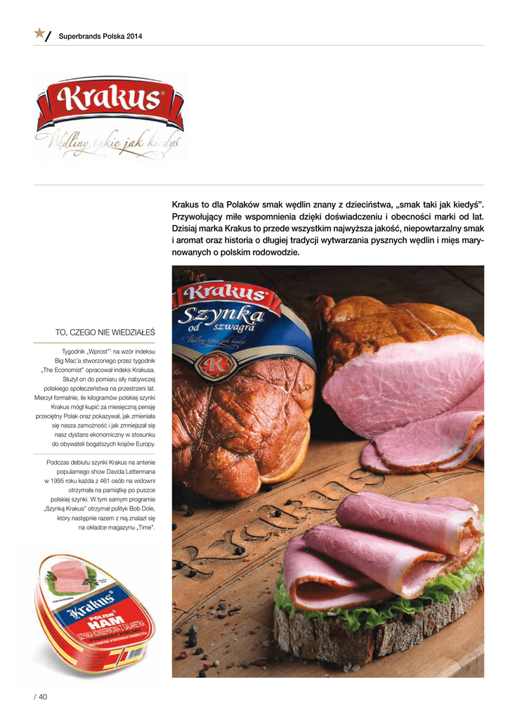 Superbrands Polska 2014 Krakus to dla Polaków smak wędlin znany z dzieciństwa, „smak taki jak kiedyś”. Przywołujący miłe wspomnienia dzięki doświadczeniu i obecności marki od lat. Dzisiaj marka Krakus to przede wszystkim najwyższa jakość, niepowtarzalny smak i aromat oraz historia o długiej tradycji wytwarzania pysznych wędlin i mięs marynowanych o polskim rodowodzie. TO, CZEGO NIE WIEDZIAŁEŚ Tygodnik „Wprost”1 na wzór indeksu Big Mac’a stworzonego przez tygodnik „The Economist” opracował indeks Krakusa. Służył on do pomiaru siły nabywczej polskiego społeczeństwa na przestrzeni lat. Mierzył formalnie, ile kilogramów polskiej szynki Krakus mógł kupić za miesięczną pensję przeciętny Polak oraz pokazywał, jak zmieniała się nasza zamożność i jak zmniejszał się nasz dystans ekonomiczny w stosunku do obywateli bogatszych krajów Europy. Podczas debiutu szynki Krakus na antenie popularnego show Davida Lettermana w 1995 roku każda z 461 osób na widowni otrzymała na pamiątkę po puszce polskiej szynki. W tym samym programie „Szynką Krakus” otrzymał polityk Bob Dole, który następnie razem z nią znalazł się na okładce magazynu „Time”. / 40 krakus Kontekst rynkowy Krakus jest marką przywróconą po II Wojnie Światowej, głównie w eksporcie szynki do USA, znanej jako pożądany „produkt z eksportu na święta”. Sukces sprzedaży spowodował, że nazwę marki nadano wybranym eksportowanym produktom rolniczym o najwyższej jakości – m.in. wędlinom i innym przetworom owocowo-warzywnym. Z tego powodu właśnie w kraju puszka z czerwoną etykietą „Krakus – Polish ham” przez długie lata była synonimem luksusu produktu eksportowego znanego na innych rynkach i uznawanego za symbol wysokiej jakości. Kontynuując dobre tradycje polskiego rzemiosła w produkcji wędlin i doświadczeń w wyrobie produktów najwyższej jakości, w 2004 roku nastąpiła kolejna odsłona Krakusa wspartego kampanią telewizyjną pt. „Wędliny takie jak kiedyś”, podczas której ofertę marki poszerzyły nowe kategorie produktowe jak marynaty, nowe wędzonki i kolejne konserwy. Obecnie marka Krakus jest doskonałym przykładem, jak z sukcesem kontynuować tradycje, odpowiadając na dzisiejsze potrzeby i preferencje konsumentów w kategorii wędlin – największej żywnościowej kategorii w Polsce. Na rynku wędlin pomimo dużego rozdrobnienia i bardziej tradycyjnego charakteru oferty wyróżniło się tylko kilka marek. Spośród nich jedynie Krakus buduje swój autorytet, bazując na wspaniałym rodowodzie i prawdziwej historii, zawłaszczając atrybuty najwyżej jakości, doświadczenia i wyjątkowości swojej oferty. Oferta Krakus to przede wszystkim cztery kategorie produktowe: • szlachetne kiełbasy podsuszane wytwarzane z najwyższej jakości mięsa, bez sztucznych dodatków, tylko z naturalnymi przyprawami i wędzone dymem olchowo-bukowym, np. znana wszystkim Kiełbasa Krakowska, Żywiecka czy Kiełbasa Myśliwska, nie wspominając o najpopularniejszych Kabanosach Krakus. • wędzonki produkowane bez kompromisów zgodnie z tradycją polskiego przemysłu mięsnego, stąd popularność takich produktów jak Szynka od Szwagra oraz Schab i Karczek z tej samej linii, wyjątkowo delikatna Szynka dojrzewająca czy niedawno wprowadzona Szynka bez konserwantów. • konserwy mięsne w puszkach takie jak Gulasz angielski, Golonkowa czy Luksusowa mielonka wieprzowa, w tym także kultowa szynka 1 lbs – tzw. mandolinka przywołująca każdemu smaki dzieciństwa. • mięso marynowane – bez zbędnych dodatków, tylko mięso najwyższej jakości z szynki, schabu, boczku i karkówki w marynacie z naturalnymi przyprawami, bez konserwantów. Doskonałe wędliny takie jak kiedyś, wystarczy tylko upiec i wystudzić. Osiągnięcia W oparciu o tradycyjne wartości i doświadczenie sprzed lat, Krakus zdołał wypracować sobie miejsce jednej z najsilniejszych marek kategorii. Zarówno na poziomie świadomości marki, jak i pod względem siły i wyrazistości wizerunku w odbiorze konsumentów. Produkty Krakus zajmują pierwsze miejsce w sprzedaży kabanosów, szynek, szynek konserwowych, kiełbas żywieckich2 oraz konserw mięsnych3. Promocja Marki Marka Krakus w swojej komunikacji odwołuje się do bliżej niezdefiniowanej przeszłości, wszystkiego tego co kiedyś było dobre, a za czym obecnie tęsknimy. „Wędliny takie jak kiedyś” to produkty, które przywołują aromaty i nastroje czasów, gdy doskonałe jedzenie wywoływało silne i pozytywne emocje. W ramach tej platformy powstały więc kolejne odsłony obrazowania świata marki w jej reklamach m.in. za pomocą starej wędzarni, ukazania pasji tworzenia i szlachetność smaku w roli głównej z Kabanosami czy ostatnio oryginalną historią szynki Krakus. Na przełomie 2010 i 2011 roku w ramach obchodów 60-lecia marki przeprowadzone zostały działania promocyjne, m.in. powstała reklama i platforma internetowa „takie jak kiedyś” oraz wydano specjalną książkę „Historie Krakusa”. Wydawnictwo stanowiło zbiór opowieści 22 historii wybranych w konkursie na wyjątkowe wspomnienia związane z Krakusem. www.wedlinykrakus.pl . Zieliński, Wprost, nr 24, 2004. M Nielsen, wędliny paczkowane, samoobsługa, hipermarket-/ supermarket benchmark, okres w01-w52/2013. 3 Nielsen, konserwy mięsne, panel detaliczny, okres ON2012-DJ2013. 1 2 HISTORIA MARKI 1948: Pierwsze użycie znaku „Krakus” w obrocie handlowym w USA (wg zapisu w dokumencie rejestracyjnym wydanym przez United States Patent Office). 1950: Pierwsza rejestracja znaku towarowego „Krakus” dla szynek w puszce na rzecz Atalanta Corporation. 1959: Pierwsza rejestracja znaku „Krakus” w Polsce na rzecz CHZ „Animex”. 1961: Cesja praw do znaku „Krakus” zarejestrowanego w USA dokonana przez Atalanta Products Corp. na rzecz CHZ „Animex”. 1995: Szynka Krakus debiutuje na antenie popularnego amerykańskie