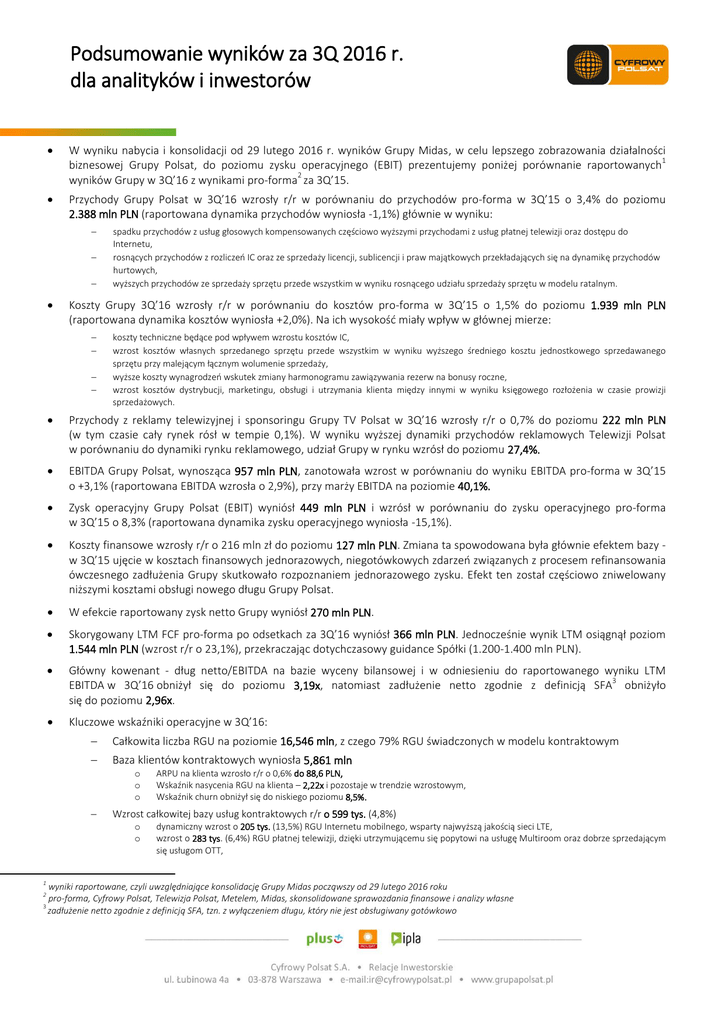 Podsumowanie wyników za 3Q 2016 r. dla analityków i inwestorów W wyniku nabycia i konsolidacji od 29 lutego 2016 r. wyników Grupy Midas, w celu lepszego zobrazowania działalności 1 biznesowej Grupy Polsat, do poziomu zysku operacyjnego (EBIT) prezentujemy poniżej porównanie raportowanych 2 wyników Grupy w 3Q’16 z wynikami pro-forma za 3Q’15. Przychody Grupy Polsat w 3Q’16 wzrosły r/r w porównaniu do przychodów pro-forma w 3Q’15 o 3,4% do poziomu 2.388 mln PLN (raportowana dynamika przychodów wyniosła -1,1%) głównie w wyniku: spadku przychodów z usług głosowych kompensowanych częściowo wyższymi przychodami z usług płatnej telewizji oraz dostępu do Internetu, rosnących przychodów z rozliczeń IC oraz ze sprzedaży licencji, sublicencji i praw majątkowych przekładających się na dynamikę przychodów hurtowych, wyższych przychodów ze sprzedaży sprzętu przede wszystkim w wyniku rosnącego udziału sprzedaży sprzętu w modelu ratalnym. Koszty Grupy 3Q’16 wzrosły r/r w porównaniu do kosztów pro-forma w 3Q’15 o 1,5% do poziomu 1.939 mln PLN (raportowana dynamika kosztów wyniosła +2,0%). Na ich wysokość miały wpływ w głównej mierze: koszty techniczne będące pod wpływem wzrostu kosztów IC, wzrost kosztów własnych sprzedanego sprzętu przede wszystkim w wyniku wyższego średniego kosztu jednostkowego sprzedawanego sprzętu przy malejącym łącznym wolumenie sprzedaży, wyższe koszty wynagrodzeń wskutek zmiany harmonogramu zawiązywania rezerw na bonusy roczne, wzrost kosztów dystrybucji, marketingu, obsługi i utrzymania klienta między innymi w wyniku księgowego rozłożenia w czasie prowizji sprzedażowych. Przychody z reklamy telewizyjnej i sponsoringu Grupy TV Polsat w 3Q’16 wzrosły r/r o 0,7% do poziomu 222 mln PLN (w tym czasie cały rynek rósł w tempie 0,1%). W wyniku wyższej dynamiki przychodów reklamowych Telewizji Polsat w porównaniu do dynamiki rynku reklamowego, udział Grupy w rynku wzrósł do poziomu 27,4%. EBITDA Grupy Polsat, wynosząca 957 mln PLN, zanotowała wzrost w porównaniu do wyniku EBITDA pro-forma w 3Q’15 o +3,1% (raportowana EBITDA wzrosła o 2,9%), przy marży EBITDA na poziomie 40,1%. Zysk operacyjny Grupy Polsat (EBIT) wyniósł 449 mln PLN i wzrósł w porównaniu do zysku operacyjnego pro-forma w 3Q’15 o 8,3% (raportowana dynamika zysku operacyjnego wyniosła -15,1%). Koszty finansowe wzrosły r/r o 216 mln zł do poziomu 127 mln PLN. Zmiana ta spowodowana była głównie efektem bazy w 3Q’15 ujęcie w kosztach finansowych jednorazowych, niegotówkowych zdarzeń związanych z procesem refinansowania ówczesnego zadłużenia Grupy skutkowało rozpoznaniem jednorazowego zysku. Efekt ten został częściowo zniwelowany niższymi kosztami obsługi nowego długu Grupy Polsat. W efekcie raportowany zysk netto Grupy wyniósł 270 mln PLN. Skorygowany LTM FCF pro-forma po odsetkach za 3Q’16 wyniósł 366 mln PLN. Jednocześnie wynik LTM osiągnął poziom 1.544 mln PLN (wzrost r/r o 23,1%), przekraczając dotychczasowy guidance Spółki (1.200-1.400 mln PLN). Główny kowenant ‐ dług netto/EBITDA na bazie wyceny bilansowej i w odniesieniu do raportowanego wyniku LTM 3 EBITDA w 3Q’16 obniżył się do poziomu 3,19x, natomiast zadłużenie netto zgodnie z definicją SFA obniżyło się do poziomu 2,96x. Kluczowe wskaźniki operacyjne w 3Q’16: Całkowita liczba RGU na poziomie 16,546 mln, z czego 79% RGU świadczonych w modelu kontraktowym Baza klientów kontraktowych wyniosła 5,861 mln o o o Wzrost całkowitej bazy usług kontraktowych r/r o 599 tys. (4,8%) o o 1 ARPU na klienta wzrosło r/r o 0,6% do 88,6 PLN, Wskaźnik nasycenia RGU na klienta – 2,22x i pozostaje w trendzie wzrostowym, Wskaźnik churn obniżył się do niskiego poziomu 8,5%. dynamiczny wzrost o 205 tys. (13,5%) RGU Internetu mobilnego, wsparty najwyższą jakością sieci LTE, wzrost o 283 tys. (6,4%) RGU płatnej telewizji, dzięki utrzymującemu się popytowi na usługę Multiroom oraz dobrze sprzedającym się usługom OTT, wyniki raportowane, czyli uwzględniające konsolidację Grupy Midas począwszy od 29 lutego 2016 roku pro-forma, Cyfrowy Polsat, Telewizja Polsat, Metelem, Midas, skonsolidowane sprawozdania finansowe i analizy własne 3 zadłużenie netto zgodnie z definicją SFA, tzn. z wyłączeniem długu, który nie jest obsługiwany gotówkowo 2 Podsumowanie wyników za 3Q 2016 r. dla analityków i inwestorów o wzrost o 112 tys. (1,7%) RGU telefonii komórkowej (czwarty z kolei kwartał wzrostowy) to efekt korzystnego wpływu strategii multiplay, wsparty w przypadku 3Q’16 bardziej intensywną migracją klientów z segmentu prepaid. Dynamiczny wzrost nasycenia bazy klientów kontraktowych usługami zintegrowanymi: o już 21% naszych klientów kontraktowych korzysta z oferty multiplay, co pozytywnie przekłada się raportowany wskaźnik churn (najniższy w ostatnich 3 latach). Statystyki segmentu prepaid pod wpływem działań wynikających z ustawy antyterrorystycznej, wymuszającej rejestrację kart SIM: o o Baza RGU prepaid obniżona do poziomu 3,53 mln usług to efekt skokowego spadku sprzedaży nowych kart prepaid na całym rynku, wzmocniony działaniami sprzedażowymi nastawionymi na migrację klientów prepaid do taryf kontraktowych. ARPU prepaid na poziomie 18,7 zł, obniżając się o 1,6% r/r w efekcie krótkoterminowych promocji polegających na udzielaniu bardzo atrakcyjnych jednorazowych bonusów dla użytkowników nowo zarejestrowanych kart prepaid. Wyniki finansowe Grupy Cyfrowego Polsatu w mln PLN Przychody ze sprzedaży, w tym: Zmiana pro-forma r/r Konsensus (1) rynkowy Różnica 2.388 3% 2.377 0,4% 1.584 -4% n/d n/d 3Q’16 - Przychody detaliczne od klientów indywidualnych i biznesowych - Przychody hurtowe 563 9% n/d n/d - Przychody ze sprzedaży sprzętu 221 69% n/d n/d - Pozostałe przychody 20 18% n/d n/d 1.939 2% n/d n/d Koszty operacyjne, w tym: - Amortyzacja, utrata warto