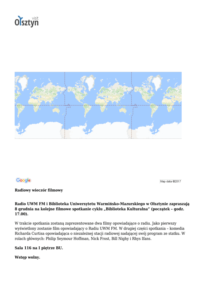 Radiowy wieczór filmowy Radio UWM FM i Biblioteka Uniwersytetu Warmińsko-Mazurskiego w Olsztynie zapraszają 8 grudnia na kolejne filmowe spotkanie cyklu „Biblioteka Kulturalna” (początek – godz. 17.00). W trakcie spotkania zostaną zaprezentowane dwa filmy opowiadające o radiu. Jako pierwszy wyświetlony zostanie film opowiadający o Radiu UWM FM. W drugiej części spotkania – komedia Richarda Curtisa opowiadająca o niezależnej stacji radiowej nadającej swój program ze statku. W rolach głównych: Philip Seymour Hoffman, Nick Frost, Bill Nighy i Rhys Ifans. Sala 116 na I piętrze BU. Wstęp wolny. 1)Biblioteka Uniwersytecka UWM, (2016-12-08 17:00-2016-12-08 20:00) www.visit.olsztyn.eu