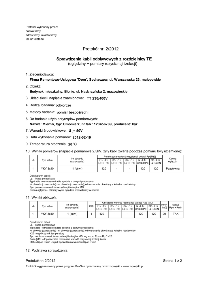 Protokół wykonany przez: nazwa firmy adres firmy, miasto firmy tel. nr telefonu Protokół nr: 2/2012 Sprawdzenie kabli odpływowych z rozdzielnicy TE (oględziny + pomiary rezystancji izolacji) 1. Zleceniodawca: Firma Remontowo-Usługowa "Dom", Sochaczew, ul. Warszawska 23, małopolskie 2. Obiekt: Budynek mieszkalny, Błonie, ul. Nadarzyńska 2, mazowieckie 3. Układ sieci i napięcie znamionowe: TT 230/400V 4. Rodzaj badania: odbiorcze 5. Metody badania: pomiar bezpośredni 6. Do badania użyto przyrządów pomiarowych: Nazwa: Miernik, typ: Omomierz, nr fab.: 123456789, producent: Xyz 7. Warunki środowiskowe: U L= 50V 8. Data wykonania pomiarów: 2012-02-19 9. Temperatura otoczenia 20 ºC 10. Wyniki pomiarów (napięcie pomiarowe 2,5kV, żyły kabli zwarte podczas pomiaru były uziemione): Lp. Typ kabla Nr obwodu (oznaczenie) 1. YKY 3x10 1 (ośw.) Pomierzona wartość rezystancji izolacji Rp [MΩ] L1 - L2+ L2 - L1+ L3 - L1+ N - L1+ PE - L1+ L3+N+PE L3+N+PE L2+N+PE L2+L3+PE L2+L3+N 120 - - 120 Ocena oględzin 120 Pozytywna Opis kolumn tabeli: Lp. - liczba porządkowa Typ kabla - oznaczenie kabla zgodnie z danymi producenta Nr obwodu (oznaczenie) - nr obwodu (oznaczenie) jednoznacznie określające kabel w rozdzielnicy. Rp - pomierzona wartość rezystancji izolacji w MΩ Ocena oględzin - zbiorczy wynik oględzin przewidziany w normie 11. Wyniki obliczeń: Lp. Typ kabla Nr obwodu (oznaczenie) K20 1. YKY 3x10 1 (ośw.) 1 Obliczona wartość rezystancji izolacji Rpo [MΩ] L1 - L2+ L2 - L1+ L3 - L1+ N - L1+ PE - L1+ L3+N+PE L3+N+PE L2+N+PE L2+L3+PE L2+L3+N 120 - - 120 120 Rmin Status [MΩ] Rpo > Rmin 20 TAK Opis kolumn tabeli: Lp. - liczba porządkowa Typ kabla - oznaczenie kabla zgodnie z danymi producenta Nr obwodu (oznaczenie) - nr obwodu (oznaczenie) jednoznacznie określające kabel w rozdzielnicy K20 - współczynnik temperatury Rpo - obliczona wartość rezystancji izolacji w MΩ, wg wzoru Rpo = Rp * K20 Rmin [MΩ] - dopuszczalna minimalna wartość rezystancji izolacji kabla Status Rpo > Rmin - wynik sprawdzenia warunku Rpo > Rmin 12. Podstawa sprawdzenia: - Ustawa Prawo budowlane i warunki techniczne Protokół nr: 2/2012 - Normy: Protokół wygenerowany przez program ProGen opracowany przez z-projekt - www.z-projekt.pl Strona 1 z 2 - Ustawa Prawo budowlane i warunki techniczne - Normy: - N-SEP-E-004 Elektroenergetyczne i sygnalizacyjne linie kablowe. Projektowanie i budowa. - PN-E-04700:1998 Urządzenia i układy elektryczne w obiektach elektroenergetycznych. Wytyczne przeprowadzania po montażowych badań odbiorczych. Pkt. 6.6 Linie kablowe. 13. Wynik oględzin zamieszczony w pkt 10 zawiera: 13.1 Sprawdzenie zgodności typu i oznaczenia kabla z projektem (dokumentacją), 13.2 Sprawdzenie zgodności i ciągłości żył (faz), 13.3 Sprawdzenie obecności przegród (uszczelnień) ogniowych przy przejściach przez stropy lub ściany oraz wejścia do budynku. 13.4 Sprawdzenie sposobu i trasy ułożenia kabla zgodnie z dokumentacją. 14. Orzeczenie: Wyniki pomiarów rezystancji izolacji i oględzin badanych kabli spełniają wymagania norm. Kable nadają się do eksploatacji. Ochrona przeciwporażeniowa podstawowa skuteczna. 15. Termin następnych badań: Na podstawie Ustawy Prawo budowlane obowiązujący najdłuższy okres pomiędzy kolejnymi pomiarami wynosi 5 lat. 16. Osoby, które wykonały badania: Imię Nazwisko Nr uprawnień Janusz Ryszard Cały Reszka 125/78 456/89 Protokół nr: 2/2012 Protokół wygenerowany przez program ProGen opracowany przez z-projekt - www.z-projekt.pl Podpis Strona 2 z 2