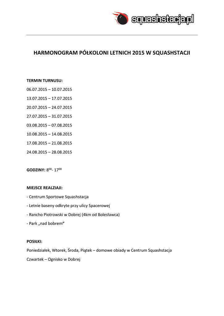 harmonogram półkoloni letnich 2015 w squashstacji