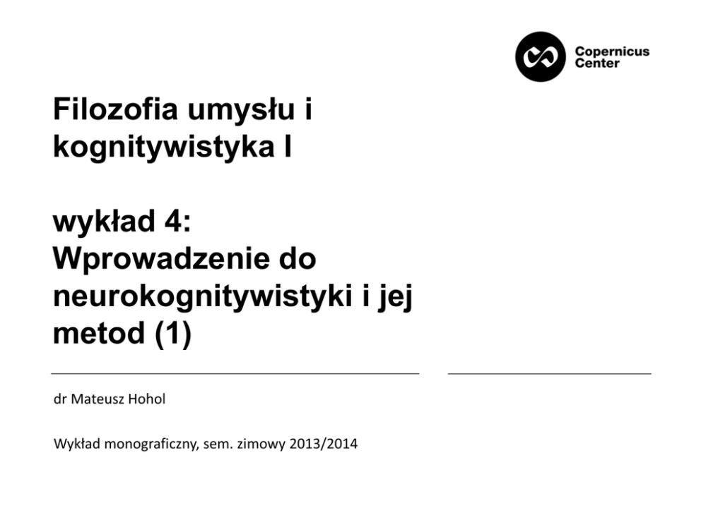 Filozofia umysłu i kognitywistyka I wykład 4: Wprowadzenie do neurokognitywistyki i jej metod (1) dr Mateusz Hohol Wykład monograficzny, sem. zimowy 2013/2014 Powstanie neuronauki poznawczej (neurokognitywistyki) • Kryzys „obliczeniowej” kognitywistyki, a zarazem rozwój językoznawstwa kognitywnego i psychologii ewolucyjnej • Przełom lat 80 i 90: – 1989 r. pierwszy numer „Journal of Cognitive Neuroscience” • Prace Michaela Gazzanigi, V.S. Ramachandrana i innych uczonych, łączące psychologię, kognitywistykę i neuronaukę – Np.. M. Gazzaniga, R.B. Ivry, G.R. Mangun współautor „Cognitive Neuroscience. The Biology of the Mind” 1998 • Upowszechnienie się funkcjonalnego rezonansu magnetycznego Poziomy badań (teorii) • • • • (i) poziom pojedynczych komórek nerwowych (ii) poziom struktur podkorowych (iii) poziom struktur korowych (iv) poziom procesów poznawczych • Jeśli istnieje taka potrzeba wyodrębnić można np. poziom molekuł, a ten z kolei rozpatrywać na czterech pod-poziomach: – geometryczno-mechanicznym – elektrochemicznym – energetycznym – elektromagnetycznym Uteoretyzowanie badań na poziomie procesów poznawczych „Neuronauka kognitywna (poznawcza – M.L.H.) postrzega poziom zjawisk psychologicznych (skonceptualizowany jako np. „poznanie”, „przetwarzanie informacji”, „reprezentacja”, „obliczenia”) jako poziom wyższy, który należy wyjaśnić, odwołując się do neuronalnych i neuroobliczeniowych mechanizmów należących do niższego poziomu zjawisk. Zgodnie z tym poglądem zjawiska psychologiczne nie są eksplanacyjnie autonomiczne, ale nie są też eliminowane – podobnie cytologia nie jest ani eliminowana, ani autonomiczna względem biochemii i biologii molekularnej. Własności psychologiczne są postrzegane jako należące do wyższego poziomu organizacji niż własności neuronalne, ale też jako ukonstytuowane na poziomie mikro (…) w ten sam zasadniczo sposób jak inne specyficzne naukowe własności”. Antii Revonsuo, O naturze wyjaśniania w neuronaukach Źródła danych – neuronauka poznawcza sensu stricto (1) badania lezji (lesions studis) (2) obrazowanie pojedynczych komórek (single-cell recording, SCR) (3) obrazowanie aktywności całego mózgu (neuroimaging) (4) eksperymenty behawioralne (behavioural experiments) Lezje a neuroobrazowanie a) neuroobrazowanie b) badania lezji Kryteria oceny dowodów • Kryteria wymieniane przez Williama Bechtela: – (i) generowanie przez instrument pomiarowy lub technikę powtarzalnych rezultatów, które układają się w określony wzorzec (powtarzalność i unifikacja) – (ii) stopień zgodności pomiędzy danymi, uzyskanymi z różnych źródeł (konwergencja) – (iii) stopień zgodności z wiarygodnymi teoriami (koherencja) • Co naprawdę mówią nam dane? Frenologia • • • • • • Franz Joseph Gall (XVIII / XIX w.) funkcje umysłowe związane są z kształtem czaszki człowieka (podobnie twierdził Cesare Lombroso) Gall zlokalizował 27 funkcji powiązanych z odpowiednimi obszarami kory Anarchistyczna „metodologia” – czasem rzetelne studia porównawcze, czasem potoczne obserwacje pojedynczych przypadków Zależność między wielkością danego modułu, a ekspresją psychologiczną Całe spektrum ocen frenologii: od pseudonauki i szarlatanerii do uznania jej za protoneuronaukę. Badania lezji • • Paul Brocka – odkrycie związku lezji okolicy czołowej z zaburzeniami mowy. – ośrodek Brocki usytuowany jest w części wieczkowej (pars opercularis) i trójkątnej (pars triangularis) dolnego zakrętu czołowego (na mapie mózgu Brodmannana znajduje się on w obszarach 44 i 45). – w 1861 roku Brocka zaprezentował mózg zmarłego dzień wcześniej pacjenta o przydomku „Tan” (przydomek ten pochodził od jedynego słowa, jakie potrafił on wypowiedzieć). Lezja w mózgu Tana zlokalizowana była w tylnej części lewego płata czołowego. – W 1885 roku Brocka wygłosił swoje słynne zdanie: „Nous parlons avec l’hémisphére gauche” („Mówimy lewą półkulą”) Carl Wernicke – odkrycie związku zaburzeń rozumienia mowy z lezjami lewego górnego zakrętu skroniowego – pole 42 na mapie Brodmanna Badania lezji • Casus Phineasa Gage’a – Pręt przeszył lewy pliczek, tylną część lewego oczodołu, okolicę czołową mózgu, wewnętrzną powierzchnię lewego (być może także prawego) płata czołowego, wylatując z czaszki uszkodził prawdopodobnie także część grzbietowego, tylnego obszaru płata czołowego. – Co istotne dla kwestii związanych z wpływem lezji na zachowanie, poważnemu uszkodzeniu uległa kora przedczołowa. – Lekarz Gage’a – dr Harlow napisał, że stał się: „kapryśny, folgujący sobie w największych bezeceństwach, czego ongiś nie miał w zwyczaju; wobec swych kompanów przejawiał najwyższą obojętność (…). Często zawzięcie uparty, choć jednocześnie kapryśny i niezdecydowany, tworzył niezliczone plany na przyszłość, które jednak porzucał, nim zdążyły się w pełni wyklarować. (…) Stał się człowiekiem o zdolnościach intelektualnych dziecka i zwierzęcej zapalczywości silnego mężczyzny”. Badania lezji • Laboratoryjne wywoływanie lezji – przy użyciu zastrzyków z substancjami chemicznymi oraz za pomocą elektrod, umieszczonych bezpośrednio w tkance nerwowej – efekty lezji mogą być odwracalne lub nie – wyłączanie genów (gene-knockout) – celowe wywoływanie mutacji genów, czego efektem fenotypowym jest np. zmiana działania mechanizmów neurotransmisji – niestosowane na ludziach – względy etyczne – na ludziach stosować można przyczaszkową stymulację magnetyczną (transcranial magnetic stimulation, w skrócie TMS) • zasięg tej metody ograniczony jest do struktur korowych • metodą tą wywołać można m.in. fotyzmy Badania lezji • Poważnym problemem w identyfikacji obszarów funkcjonalnych mózgu