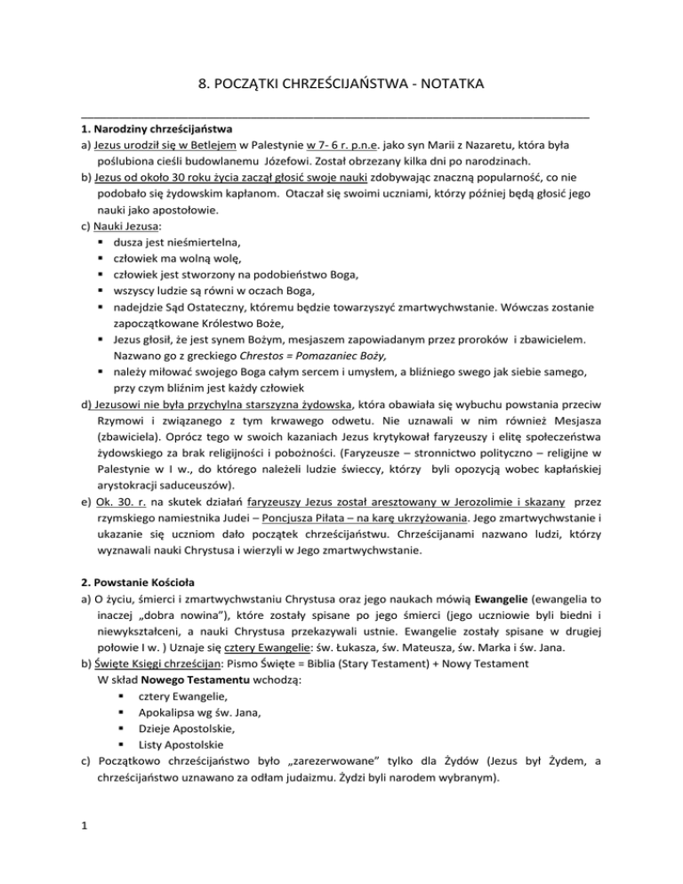8. POCZĄTKI CHRZEŚCIJAOSTWA - NOTATKA _________________________________________________________________________________ 1. Narodziny chrześcijaostwa a) Jezus urodził się w Betlejem w Palestynie w 7- 6 r. p.n.e. jako syn Marii z Nazaretu, która była poślubiona cieśli budowlanemu Józefowi. Został obrzezany kilka dni po narodzinach. b) Jezus od około 30 roku życia zaczął głosid swoje nauki zdobywając znaczną popularnośd, co nie podobało się żydowskim kapłanom. Otaczał się swoimi uczniami, którzy później będą głosid jego nauki jako apostołowie. c) Nauki Jezusa: dusza jest nieśmiertelna, człowiek ma wolną wolę, człowiek jest stworzony na podobieostwo Boga, wszyscy ludzie są równi w oczach Boga, nadejdzie Sąd Ostateczny, któremu będzie towarzyszyd zmartwychwstanie. Wówczas zostanie zapoczątkowane Królestwo Boże, Jezus głosił, że jest synem Bożym, mesjaszem zapowiadanym przez proroków i zbawicielem. Nazwano go z greckiego Chrestos = Pomazaniec Boży, należy miłowad swojego Boga całym sercem i umysłem, a bliźniego swego jak siebie samego, przy czym bliźnim jest każdy człowiek d) Jezusowi nie była przychylna starszyzna żydowska, która obawiała się wybuchu powstania przeciw Rzymowi i związanego z tym krwawego odwetu. Nie uznawali w nim również Mesjasza (zbawiciela). Oprócz tego w swoich kazaniach Jezus krytykował faryzeuszy i elitę społeczeostwa żydowskiego za brak religijności i pobożności. (Faryzeusze – stronnictwo polityczno – religijne w Palestynie w I w., do którego należeli ludzie świeccy, którzy byli opozycją wobec kapłaoskiej arystokracji saduceuszów). e) Ok. 30. r. na skutek działao faryzeuszy Jezus został aresztowany w Jerozolimie i skazany przez rzymskiego namiestnika Judei – Poncjusza Piłata – na karę ukrzyżowania. Jego zmartwychwstanie i ukazanie się uczniom dało początek chrześcijaostwu. Chrześcijanami nazwano ludzi, którzy wyznawali nauki Chrystusa i wierzyli w Jego zmartwychwstanie. 2. Powstanie Kościoła a) O życiu, śmierci i zmartwychwstaniu Chrystusa oraz jego naukach mówią Ewangelie (ewangelia to inaczej „dobra nowina”), które zostały spisane po jego śmierci (jego uczniowie byli biedni i niewykształceni, a nauki Chrystusa przekazywali ustnie. Ewangelie zostały spisane w drugiej połowie I w. ) Uznaje się cztery Ewangelie: św. Łukasza, św. Mateusza, św. Marka i św. Jana. b) Święte Księgi chrześcijan: Pismo Święte = Biblia (Stary Testament) + Nowy Testament W skład Nowego Testamentu wchodzą: cztery Ewangelie, Apokalipsa wg św. Jana, Dzieje Apostolskie, Listy Apostolskie c) Początkowo chrześcijaostwo było „zarezerwowane” tylko dla Żydów (Jezus był Żydem, a chrześcijaostwo uznawano za odłam judaizmu. Żydzi byli narodem wybranym). 1 d) Św. Paweł z Tarsu – był faryzeuszem. Początkowo zwalczał chrześcijan (wówczas nosił imię Szaweł). Nawrócił się około 35 – 36 r. Przyczynił się do upowszechnienia się chrześcijaostwa zdobywając rzesze nowych wiernych, nie tylko Żydów. Głosił, że chrześcijaninem może zostad każdy – nie tylko Żyd, zrezygnował z rytuału obrzezania, zrezygnował z rytualnego przygotowywania żywności (żywnośd koszerna), e) Organizacja pierwszych chrześcijan: wspólnota chrześcijaoska w jednym mieście tworzyła gminę chrześcijaoską, na czele której stał biskup wybierany przez wiernych. Gminy były autonomiczne – niezależne od siebie. biskup: o nadzorował obrzędy religijne, o nadzorował nauczanie wiary, o był przywódcą gminy chrześcijaoskiej, o prowadził działalnośd charytatywną – opiekował się biednymi, o od II w. biskupi zyskali dużo większe uprawnienia, dzięki m.in. dożywotniemu sprawowaniu swojej funkcji. Zwiększenie ich uprawnieo było związane zagrożeniem jakie dla chrześcijaostwa niósł gnostycyzm (połączenie filozofii chrześcijaoskiej z filozofiami Wschodu hellenistycznego). f) powstanie Kościoła Powszechnego - „zjednoczenie" autonomicznych gmin w jeden Kościół, który wyznawał ten sam kanon wiary i w ten sam sposób odprawiał obrzędy. zaczął się tworzyd w 2 połowie II w., dzięki utrzymywaniu kontaktów między gminami (osobistych i listownych),wykształcił się podstawowy kanon wiary, opracowano kanon Pisma Świętego (wybrano te księgi, które uznano za autentycznie święte. Pozostałe nazwano apokryfami i odrzucono). Skutkiem tego było to, że : o częśd gmin wystąpiła z Kościoła, o rozpoczęły się spory o prawdy wiary i kwestie personalne, o pojawiły się herezje – nurty odróżniające się od powszechnie uznanego kanonu wiary. 3. Prześladowania chrześcijan a) przyczyny: odmówienie przez chrześcijan wyznawania paostwowego kultu Romy i Augusta, który scalał imperium; uważano że sprowadzali na ludzi przez to gniew bogów, niezrozumienie zasad wiary przez ogół społeczeostwa, przeświadczenie o zabobonnym charakterze kultu, w chwilach trudnych dla cesarstwa chrześcijanie stawali się „kozłami ofiarnymi”, tworzyli własne prawa sprzeczne z ustanowionymi przez paostwo, burzyli obowiązującą hierarchię społeczną. b) prześladowania: Data Cesarz Przyczyny Formy prześladowao 64 r. Neron Pożar Rzymu. Chrześcijan Igrzyska, w trakcie których na oskarżono o dokonanie bezbronnych chrześcijan podpalenia. wypuszczano dzikie zwierzęta, krzyżowano ich i zamieniano w żywe pochodnie. 2 połowa II w. Marek Aureliusz III w. (249 r.) Decjusz 303 r. , 304 r. Dioklecjan Zagrożenie paostwa inwazją plemion barbarzyoskich. Cesarz zarządził powszechne ofiary przebłagalne, w których chrześcijanie odmówili udziału. Chrześcijanie odmówili złożenia uroczystej ofiary ku czci bogów rzymskich i cesarza– nie uznali boskości cesarza. Wprowadzenie dominatu. Dążenie do ideologicznego umocnienie władzy cesarskiej przez powrót do starych rzymskich kultów i kultu cesarza. Uważał chrześcijaostwo za niebez