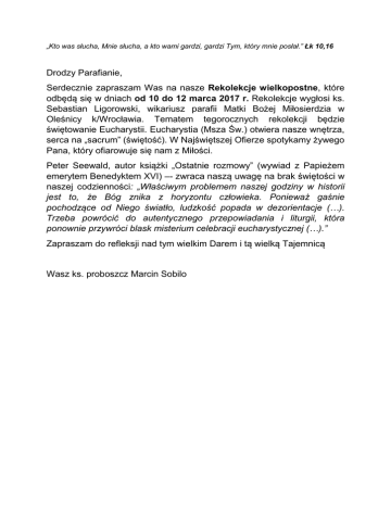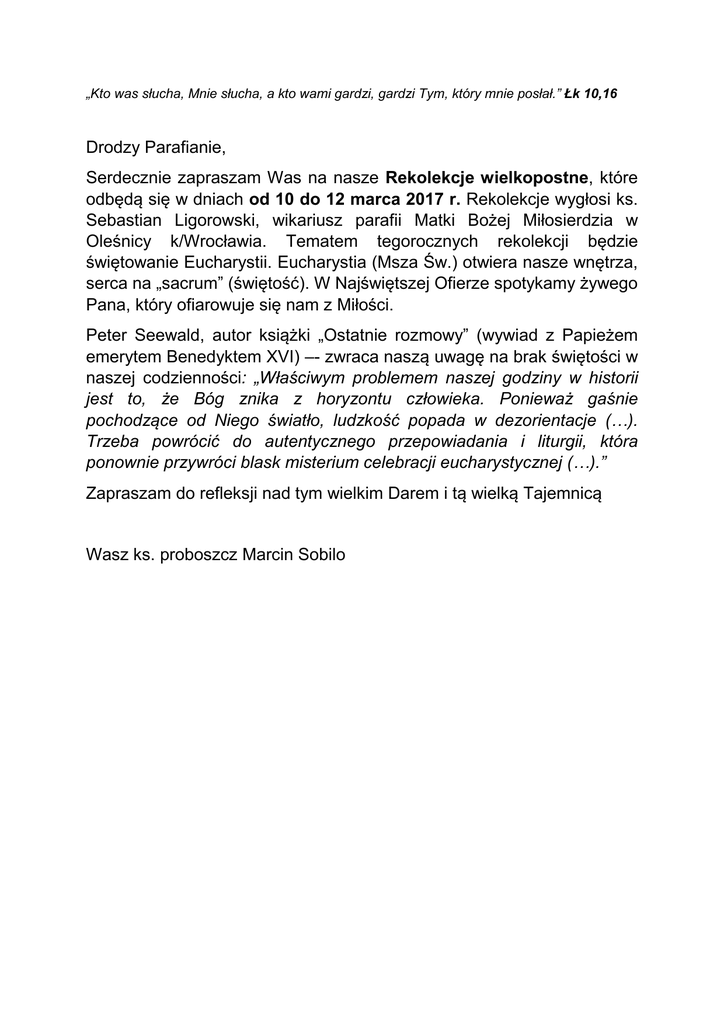 „Kto was słucha, Mnie słucha, a kto wami gardzi, gardzi Tym, który mnie posłał.” Łk 10,16 Drodzy Parafianie, Serdecznie zapraszam Was na nasze Rekolekcje wielkopostne, które odbędą się w dniach od 10 do 12 marca 2017 r. Rekolekcje wygłosi ks. Sebastian Ligorowski, wikariusz parafii Matki Bożej Miłosierdzia w Oleśnicy k/Wrocławia. Tematem tegorocznych rekolekcji będzie świętowanie Eucharystii. Eucharystia (Msza Św.) otwiera nasze wnętrza, serca na „sacrum” (świętość). W Najświętszej Ofierze spotykamy żywego Pana, który ofiarowuje się nam z Miłości. Peter Seewald, autor książki „Ostatnie rozmowy” (wywiad z Papieżem emerytem Benedyktem XVI) –- zwraca naszą uwagę na brak świętości w naszej codzienności: „Właściwym problemem naszej godziny w historii jest to, że Bóg znika z horyzontu człowieka. Ponieważ gaśnie pochodzące od Niego światło, ludzkość popada w dezorientacje (…). Trzeba powrócić do autentycznego przepowiadania i liturgii, która ponownie przywróci blask misterium celebracji eucharystycznej (…).” Zapraszam do refleksji nad tym wielkim Darem i tą wielką Tajemnicą Wasz ks. proboszcz Marcin Sobilo