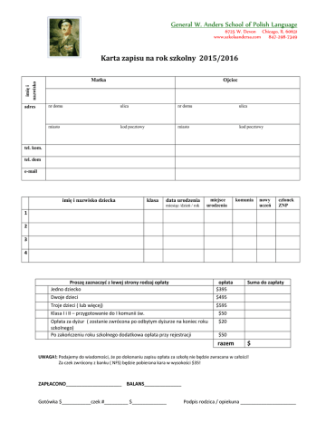 General W. Anders School of Polish Language 6725 W. Devon Chicago, IL 60631 www.szkolaandersa.com 847-298-7349 Karta zapisu na rok szkolny 2015/2016 imię i nazwisko Matka adres Ojciec nr domu ulica nr domu ulica miasto kod pocztowy miasto kod pocztowy tel. kom. tel. dom e-mail imię i nazwisko dziecka klasa data urodzenia miesiąc /dzień / rok miejsce urodzenia komunia nowy uczeń członek ZNP 1 2 3 4 Proszę zaznaczyć z lewej strony rodzaj opłaty Jedno dziecko opłata $395 Dwoje dzieci $495 Troje dzieci ( lub więcej) $595 Klasa I i II – przygotowanie do I komunii św. $50 Opłata za dyżur ( zostanie zwrócona po odbytym dyżurze na koniec roku szkolnego) Po zakończeniu roku szkolnego dodatkowa opłata przy rejestracji $20 Suma do zapłaty $50 razem $ UWAGA!: Podajemy do wiadomości, że po dokonaniu zapisu opłata za szkołę nie będzie zwracana w całości! Za czek zwrócony z banku ( NFS) będzie pobierana kara w wysokości $35! ZAPŁACONO_____________________ BALANS______________ Gotówka $___________czek #_________ $_____________ Podpis rodzica / opiekuna _____________________ ALERGIE i PROBLEMY ZDROWOTNE imię i nazwiska ucznia rodzaj alergii lub innej choroby 1 2 3 4 Lekarz rodzinny____________________________________________________________________tel. lekarza________________________________ *W razie konieczności natychmiastowego kontaktu w czasie zajęć szkolnych należy powiadomić: Imię i nazwisko______________________________________________________________________ nr telefonu kom._______________________ Osoby upoważnione do odbioru dzieci ze szkoły: imię i nazwisko nr telefonu 1 2 3 4 Podpis rodzica/ opiekuna___________________________ data___________________________