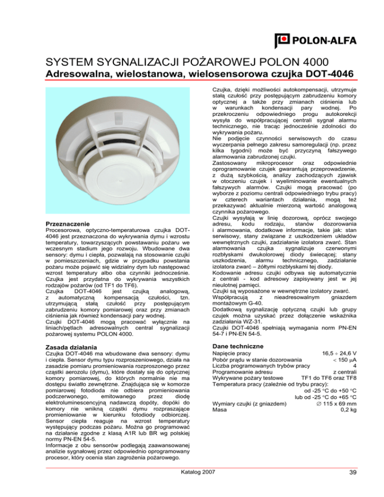 SYSTEM SYGNALIZACJI POŻAROWEJ POLON 4000 Adresowalna, wielostanowa, wielosensorowa czujka DOT-4046 Procesorowa, optyczno-temperaturowa czujka DOT4046 jest przeznaczona do wykrywania dymu i wzrostu temperatury, towarzyszących powstawaniu pożaru we wczesnym stadium jego rozwoju. Wbudowane dwa sensory: dymu i ciepła, pozwalają na stosowanie czujki w pomieszczeniach, gdzie w przypadku powstania pożaru może pojawić się widzialny dym lub następować wzrost temperatury albo oba czynniki jednocześnie. Czujka jest przydatna do wykrywania wszystkich rodzajów pożarów (od TF1 do TF6). Czujka DOT-4046 jest czujką analogową, z automatyczną kompensacją czułości, tzn. utrzymującą stałą czułość przy postępującym zabrudzeniu komory pomiarowej oraz przy zmianach ciśnienia jak również kondensacji pary wodnej. Czujki DOT-4046 mogą pracować wyłącznie na liniach/pętlach adresowalnych central sygnalizacji pożarowej systemu POLON 4000. Czujka, dzięki możliwości autokompensacji, utrzymuje stałą czułość przy postępującym zabrudzeniu komory optycznej a także przy zmianach ciśnienia lub w warunkach kondensacji pary wodnej. Po przekroczeniu odpowiedniego progu autokorekcji wysyła do współpracującej centrali sygnał alarmu technicznego, nie tracąc jednocześnie zdolności do wykrywania pożaru. Nie podjęcie czynności serwisowych do czasu wyczerpania pełnego zakresu samoregulacji (np. przez kilka tygodni) może być przyczyną fałszywego alarmowania zabrudzonej czujki. Zastosowany mikroprocesor oraz odpowiednie oprogramowanie czujek gwarantują przeprowadzenie, z dużą szybkością, analizy zachodzących zjawisk w otoczeniu czujek i wyeliminowanie ewentualnych fałszywych alarmów. Czujki mogą pracować (po wyborze z poziomu centrali odpowiedniego trybu pracy) w czterech wariantach działania, mogą też przekazywać aktualnie mierzoną wartość analogową czynnika pożarowego. Czujki wysyłają w linię dozorową, oprócz swojego adresu, kodu rodzaju, stanów dozorowania i alarmowania, dodatkowe informacje, takie jak: stan serwisowy, stany związane z uszkodzeniem układów wewnętrznych czujki, zadziałanie izolatora zwarć. Stan alarmowania czujka sygnalizuje czerwonymi rozbłyskami dwukolorowej diody świecącej; stany uszkodzenia, alarmu technicznego, zadziałanie izolatora zwarć – żółtymi rozbłyskami tej diody. Kodowanie adresu czujki odbywa się automatycznie z centrali - kod adresowy zapisywany jest w jej nieulotnej pamięci. Czujki są wyposażone w wewnętrzne izolatory zwarć. Współpracują z nieadresowalnym gniazdem montażowym G-40. Dodatkową sygnalizację optyczną czujki lub grupy czujek można uzyskać przez dołączenie wskaźnika zadziałania WZ-31. Czujki DOT-4046 spełniają wymagania norm PN-EN 54-7 i PN-EN 54-5. Zasada działania Dane techniczne Przeznaczenie Czujka DOT-4046 ma wbudowane dwa sensory: dymu i ciepła. Sensor dymu typu rozproszeniowego, działa na zasadzie pomiaru promieniowania rozproszonego przez cząstki aerozolu (dymu), które dostały się do optycznej komory pomiarowej, do których normalnie nie ma dostępu światło zewnętrzne. Znajdująca się w komorze pomiarowej fotodioda nie odbiera promieniowania podczerwonego, emitowanego przez diodę elektroluminescencyjną nadawczą dopóty, dopóki do komory nie wnikną cząstki dymu rozpraszające promieniowanie w kierunku fotodiody odbiorczej. Sensor ciepła reaguje na wzrost temperatury występujący podczas pożaru. Można go programować na działanie zgodne z klasą A1R lub BR wg polskiej normy PN-EN 54-5. Informacje z obu sensorów podlegają zaawansowanej analizie sygnałowej przez odpowiednio oprogramowany procesor, który ocenia stan zagrożenia pożarowego. Napięcie pracy 16,5 ÷ 24,6 V Pobór prądu w stanie dozorowania < 150 µA Liczba programowanych trybów pracy 4 Programowanie adresu z centrali Wykrywane pożary testowe TF1 do TF6 oraz TF8 Temperatura pracy (zależnie od trybu pracy): od -25 °C do +50 °C lub od -25 °C do +65 °C Wymiary czujki (z gniazdem) ∅ 115 x 69 mm Masa 0,2 kg Katalog 2007 39