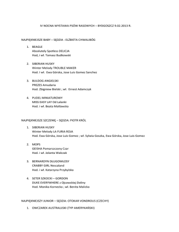 IV NOCNA WYSTAWA PSÓW RASOWYCH – BYDGOSZCZ 9.02.2013 R. NAJPIĘKNIEJSZE BABY – SĘDZIA : ELŻBIETA CHWALIBÓG 1. BEAGLE Absolutely Spotless DELICJA Hod, i wł. Tomasz Budkowski 2. SIBERIAN HUSKY Winter Melody TROUBLE MAKER Hod. I wł. Ewa Górska, Jose Luis Gomez Sanchez 3. BULDOG ANGIELSKI PREZES Amudaria Hod. Zbigniew Bielski ; wł. Ernest Adamczyk 4. PUDEL MINIATUROWY MISS EASY LAY Od Lalanki Hod. i wł. Beata Matławska NAJPIĘKNIEJSZE SZCZENIĘ – SĘDZIA: PIOTR KRÓL 1. SIBERIAN HUSKY Winter Melody LA FURIA ROJA Hod. Ewa Górska, Jose Luis Gomez ; wł. Sylwia Goszka, Ewa Górska, Jose Luis Gomez 2. MOPS GEISHA Pomarszczony Czar Hod. i wł. Jolanta Walczak 3. BERNARDYN DŁUGOWŁOSY CRABBY GIRL Nescaland Hod. i wł. Katarzyna Przybylska 4. SETER SZKOCKI – GORDON DUKE EVERYWHERE z Ojcowskiej Doliny Hod. Monika Kornecka ; wł. Benita Malicka NAJPIĘKNIEJSZY JUNIOR – SĘDZIA: OTOKAR VONDROUS (CZECHY) 1. OWCZAREK AUSTRALIJSKI (TYP AMERYKAOSKI) AUSSIE PRIDE FLY ME TO THE MOON Hod. Dana Niculescu ; wł. Latarzyna Przybylska 2. SHIH TZU CZARUJĄCY CZESŁAW Astarte Gold Hod. Rafał First, Maciej Sowioski ; wł. Sylwia Jakubowicz – Gil, Paweł Gil 3. BULLMASTIFF MAYA amber Dream Hod. i wł. Katarzyna Piasecka 4. BEAGLE Absolutely Spotless WINNER Hod. i wł. Tomasz Budkowski NAJPIĘKNIEJSZY WETERAN – SĘDZIA: OLGA DOLEJSOVA (CZECHY) 1. SIBERIAN HUSKY Winterfrost’s BETTY BOOP (ur. 01.02.2004) Hod. Daniela Vidal, Antonio Llado ; wł. Ewa Górska, Jose Luis Gomez Sanchez 2. CHIOSKI GRZYWACZ FANTAGHIRO Zikkurat (ur. 07.11.2004) Hod. Ewa Antczak ; wł. Sława Jędrzyoska – Chudzioska 3. OWCZAREK SZETLANDZKI BEAUTIFUL MARVELLOUS MAN Asketila ( ur. 20.05.2004) Hod. Jadwiga Wiśniewska, Dorota Szarek ; wł. Jadwiga Wiśniewska 4. CZARNY TERIER ROSYJSKI RATELLA z Norblioskiej Doliny ( ur. 31.01.2005) Hod. Małgorzata Pudłowska ; wł. Agata Tymczak NAJPIĘKNIEJSZY PIES RAS POLSKICH – SĘDZIA: ELŻBIETA CHWALIBÓG 1. POLSKI OWCZAREK PODHALAOSKI DUKAT Opilio Hod. Sławomir Herbowski ; wł. Wojciech Kucner 2. CHART POLSKI ZWROTNA Sopocka Aura Hod. Aurelia Cieślicka ; wł. Monika Stogowska 3. GOOCZY POLSKI WALENTYNKA El – halem Hod. i wł. Maria Minakowska 4. POLSKI OWCZAREK NIZINNY FORTA Prolog Poland Hod. Beata Klawioska ; wł. Joanna Kłaczyoska NAJPIĘKNIEJSZY PIES UŻYTKOWY – SĘDZIA : PIOTR KRÓL 1. DOBERMAN COLIN COHEN DE TERRA MIRABILI Hod. Joanna, Tomasz Kuśmierek ; wł. Artur Gąska NAJPIĘKNIEJSZY PIES UŻYTKOWY RAS MYŚLIWSKICH – SĘDZIA: LESZEK SIEJKOWSKI 1. JAMNIK KRÓTKOWŁOSY STANDARDOWY ZORAN – CZUK Hodowla Myślinów Hod. Wanda Oleszczuk ; wł. Anna Kędziora 2. BEAGLE FERNANDO Toruoski Czar Hod. i wł. Barbara Narodzonek 3. OGAR POLSKI ZBYSZKO Psia Cometa Hod. i wł. Katarzyna Sakławska – Badziukiewicz 4. COCKER SPANIEL ANGIELSKI CATCH THE WIND Renmil’s Dream Hod. i wł. Renata Niklasiewicz, Milena Seidel GRUPA I – SĘDZIA: BEATA KLAWIOSKA 1. BOUVIER DES FLANDRES ANACONDA z Grodu Książąt Pomorskich Hod. Ewa Krywan ; wł. Ania Krywan 2. OWCZAREK AUSTRALIJSKI (TYP AMERYKAOSKI) AUSSIE PRIDE FLY ME TO THE MOON Hod. Dana Niculescu ; wł. Latarzyna Przybylska 3. BIAŁY OWCZAREK SZWAJCARSKI Horsebo TWIX Hod. Helle Kristiansen ; wł. Katarzyna Jaskulska 4. OWCZAREK SZKOCKI KRÓTKOWŁOSY JOYCE Krasna Luka Hod. i wł. Michaela Ourednikova (Czechy) GRUPA II – SĘDZIA: ELŻBIETA CHWALIBÓG 1. NOWOFUNDLAND GIBRALTAR DE CHILD OF BRICE Hod. Isabelle Papin ; wł. Jolanta Marcinkowska 2. SZNAUCER MINIATUROWY PIEPRZ I SÓL BANDSMAN DANCE FEVER Hod. A.Gordon, C. Weinberger ; wł. Małgorzata Supronowicz 3. BULLMASTIFF MAYA amber Dream Hod. i wł. Katarzyna Piasecka 4. CZARNY TERIER ROSYJSKI TURANDOT z Norblioskiej Doliny Hod. Małgorzata Pudłowska ; wł. Agata Tymczak GRUPA III – SĘDZIA: ANNA WINIARSKA 1. TERIER CZESKI XANDRA Kalifa Bohemica Hod. Kamila Seberova ; wł. Mariola Dziemidowicz 2. WEST HIGHLAND WHITE TERRIER MAGIC KING ONLY FROM OLAC Urwiska Szkocji Hod. Nina Perek ; wł. Barbara Gorąca 3. STAFFORDSHIRE BULL TERRIER VOLT Dogs Of The Night Hod. Kamila Jurowczyk ; wł. Michał Łukaszewicz 4. AMERICAN STAFFORDSHIRE TERRIER EMPIRE Z DOLINY JEZIERZYCY Sentinel Hod. A. Żero ; wł. Roman Jałoszyoski GRUPA IV – SĘDZIA : IWONA CZECHOWSKA 1. JAMNIK KRÓTKOWŁOSY STANDARDOWY ZORAN – CZUK Hodowla Myślinów Hod. Wanda Oleszczuk ; wł. Anna Kędziora 2. JAMNIK DŁUGOWŁOSY STANDARD IMPRESARIO Dagi Dog Hod. Dagmara Oraczewska ; wł. Dorota Zabielska 3. JAMNIK DŁUGOWŁOSY MINIATUROWY VINNO VERETTI Kinchville Hod. Maria Gorokhova ; wł. Beata Gęsioska 4. JAMNIK SZORSTKOWŁOSY STANDARDOWY CZANGA Złamany Szeląg Hod. i wł. Maria i Zbigniew Wawrzyniak GRUPA V - SĘDZIA : LESZEK SIEJKOWSKI 1. SAMOYED Sonata Arctica BRODVER SNOWSTARSON Hod. i wł. Katarzyna Dziuba 2. SIBERIAN HUSKY ROXY D.B. Arctic Hod. i wł. Beata Jasioska 3. AKITA AMERYKAOSKA COMANCHE CHIEF Kitsune Hod. D.S. Chapman ; wł. Paweł Watral 4. CHOW CHOW ANTONIO Chines Hod. Bożena Gacek ; wł. Magdalena Wirkus GRUPA VI – SĘDZIA: DOROTA WITKOWSKA 1. BEAGLE Absolutely Spotless ZAGADKA Hod. i wł. Tomasz Budkowski 2. RHODESIAN RIDGEBACK ADDY JONAS NYAMBE Hod. Zdenek Dolezal ; wł. Alena Gebrova (Czechy) 3. GOOCZY POLSKI WALENTYNKA El – halem Hod. i wł. Maria Minakowska 4. BASSET HOUND BROMBA ze Stajennych Progów Hod. i wł. Katarzyna Buksa GRUPA VII – SĘDZIA: MAŁGORZTA LORENC 1. SETER IRLANDZKI ARGO Rysi Wykrot Hod. A.M.H. Żwierełło ; wł. Anna Żwierełło 2. WYŻEŁ WEIMARSKI KRÓTKOWŁOSY FLEUR Silver Friend Hod. i wł. Katarzyna Jarzębska 3. WYŻEŁ WĘGIERSKI KRÓTKOWŁOSY IVO Rudy Nos Hod. Tomasz Gottel ; wł. Dominika Pora 4. WYŻEŁ NIEMIECKI KRÓTKOWŁOSY FART Oręż z Dębowej Kniei Hod. Stanisław pkusa ; wł. Andrzej Rydelek GRUPA VIII – SĘDZIA: SŁAWOMIR SZTUL 1. GOLDEN RETRIEVER TROPHEUS Milowy Krok Hod. Mateusz Michalski ; wł. Kamila Żmijewska 2. COCKER SPANIEL AMERYKAOSKI ESTRELLA Green Place Poland Hod. i wł. Beata Królak 3. COCKER SPANIEL ANGIELSKI CATCH 
