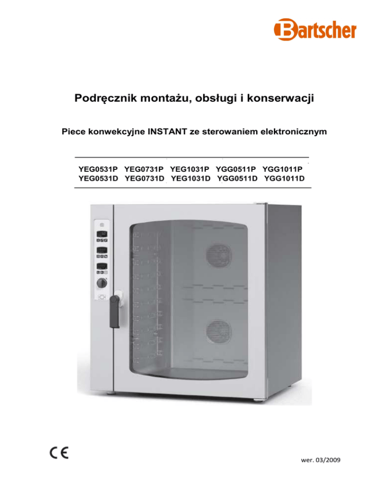 Podręcznik montażu, obsługi i konserwacji Piece konwekcyjne INSTANT ze sterowaniem elektronicznym YEG0531P YEG0731P YEG1031P YGG0511P YGG1011P YEG0531D YEG0731D YEG1031D YGG0511D YGG1011D wer. 03/2009 Spis treści 1. Montaż 1.1. Ogólne wskazówki bezpieczeństwa 1.2. Ustawienie urządzenia 1.3. Podłączenie wody 1.4. Podłączenie do sieci elektrycznej 1.5. Podłączenie gazu 1.6. Kontrola ciśnienia gazu 1.7. Wymiana dysz (zmiana rodzaju gazu) 1.8. Odprowadzenie gazów odlotowych 1.9. Uruchomienie i odbiór 2A. PIECE KONWEKCYJNE Instrukcja obsługi 2A.1. Informacje ogólne 2A.2. Nastawianie cyklu temperatury 2A.3. Nastawianie cyklu gotowania z użyciem sondy termicznej (opcja) 2A.4. Nastawianie cyklu gotowania zachowaniem różnicy temperatur (delta T) (opcja) 2A.5. Inne ustawienia 2A.6. Funkcje dodatkowe 2A.7. Wyłączanie 2A.8. Czyszczenie 2B. PIECE KONWEKCYJNO-PAROWE INSTANT Instrukcja obsługi 2B.1. Informacje ogólne 2B.2. Nastawianie cyklu temperatury 2B.3. Nastawianie cyklu gotowania z użyciem sondy termicznej (opcja) 2B.4. Nastawianie cyklu gotowania z zachowaniem różnicy temperatur (delta T) (opcja) 2B.5. Nastawianie cyklu gotowania na parze (instant) 2B.6. Inne ustawienia 3 3 4 5 6 8 10 10 11 12 13 13 14 17 18 19 21 23 23 24 24 25 2B.7. Funkcje dodatkowe 2B.8. Wyłączanie 2B.6. Czyszczenie 3. Konserwacja 3.1. Czyszczenie szyby 4. Urządzenia zabezpieczające 4.1. Zawór elektromagnetyczny 4.2. Mikroprzełącznik drzwiowy 4.3. Wyłącznik ochronny silnika 4.4. Termostat bezpieczeństwa w komorze pieca 4.5. Czujnik płomienia 5. Usuwanie usterek 5.1. Najczęściej występujące usterki 5.2. Kontrole zarezerwowane wyłącznie dla autoryzowanego technika 5.3. Części zamienne 6. Specyfikacje 6.1. Dane techniczne 7. Schematy instalacyjne 7.1. Model EGE05P i EGE05D (5 GN 1/1) 7.2. Model EGE07P i EGE07D (7 GN 1/1) 7.3. Model EGE10P i EGE10D (10 GN 1/1) 7.4. Model EGG05P i EGG05D (5 GN 1/1) 7.5. Model EGG10P i EGG10D (10 GN 1/1) 28 29 30 31 Załącznik Schematy ideowe Szanowny Kliencie, Dziękujemy za zakup jednego z naszych produktów. Niniejszy piec należy do serii urządzeń, która została zaprojektowana dla małych zakładów gastronomicznych i obejmuje zarówno piece gazowe i elektryczne o różnej mocy jak również specjalne modele dla gastronomii. Piece są bardzo łatwe w obsłudze i gwarantują szybkie oraz wydajne przygotowanie potraw. Piec jest objęty 12-miesięczną gwarancją na ewentualne wady fabryczne. Okres gwarancyjny rozpoczyna się w dniu podanym na dowodzie zakupu. Gwarancja obejmuje normalne użytkowanie pieca. Gwarancją nie są objęte materiały zużywalne (żarówki, uszczelki, itd.) oraz uszkodzenia powstałe wskutek zużycia, błędów podczas montażu, konserwacji, napraw, odkamieniania lub czyszczenia oraz na skutek niedozwolonych ingerencji w urządzenie bądź niewłaściwego użytkowania. Producent zastrzega sobie prawo do dokonywania w każdej chwili zmian w urządzeniu, które jego zdaniem są konieczne lub pożyteczne. 2 33 36 36 37 37 38 38 38 38 38 38 39 39 40 41 42 42 43 43 44 45 46 47 1. Montaż 1.1. Ogólne wskazówki bezpieczeństwa ______________________________________________ Przed montażem i uruchomieniem pieca należy uważnie przeczytać niniejszy podręcznik, ponieważ zawiera on ważne wskazówki dotyczące bezpieczeństwa podczas montażu, użytkowania i konserwacji urządzenia. Podręcznik należy przechowywać w łatwo dostępnym miejscu, aby w każdej chwili móc odszukać w nim potrzebne informacje. W przypadku zmiany miejsca użytkowania pieca należy zawsze dołączyć do niego podręcznik. Istnieje również możliwość zamówienia nowego egzemplarza u autoryzowanego dystrybutora lub bezpośrednio u producenta. Po usunięciu opakowania należy sprawdzić, czy piec nie jest uszkodzony i nie ma widocznych uszkodzeń transportowych. W przypadku uszkodzenia pod żadnym pozorem nie wolno montować i uruchamiać urządzenia. W razie wątpliwości skonsultować się z serwisem technicznym lub autoryzowanym dystrybutorem. Montażu, czynności konserwacyjnych wymagających nadzwyczajnej wiedzy i umiejętności oraz napraw urządzenia mogą dokonywać wyłącznie wykwalifikowani specjaliści stosując się przy tym do zaleceń producenta. Urządzenie zostało zaprojektowane do gotowania produktów spożywczych w zamkniętych pomieszczeniach i może być używane wyłącznie do tego celu. Wykorzystanie w jakikolwiek inny sposób jest niewłaściwe i niebezpieczne, a z tego względu również surowo zabronione. Piec może być używany wyłącznie przez osoby, które zostały odpowiednio przeszkolone. Decydujące znaczenie dla zapobiegania wypadkom i uszkodzeniom urządzenia ma również regularne udzielanie personelowi dokładnych wskazówek bezpieczeństwa. Piec nie może być używany przez osoby niesamodzielne, które same wymagają pomocy innych, ani przez osoby, którym brak jest niezbędnego doświadczenia lub wiedzy. Wyjątek stanowią sytuacje, gdy znajdują się one pod nadzorem innej osoby odpowiedzialnej za ich bezpieczeństwo lub są szkolone zakresie obsługi urządzenia. w Należy pilnować dzieci, aby nie bawiły się urządzeniem i nie próbowały go obsługiwać. Gdy urządzenie jest włączone, należy uważać na gorące powierzchnie zewnętrzne, których temperatura podczas pracy urządzenia może przekraczać 60°C. WW przypadku usterek lub nieprawidłowego działania należy wyłączyć urządzenie. Naprawy mogą być wykonywane wyłącznie przez autoryzowane centra serwisowe producenta z zastosowaniem oryginalnych części zamiennych. W pobliżu pieca nie wolno ustawiać żadnych innych źródeł ciepła jak frytownice czy płyty grillowe. W pobliżu urządzenia nie przechowywać i nie używać materiałów palnych. W przypadku wyłączenia pieca na dłuższy czas z eksploatacji należy odciąć dopływ wody i prądu. Przed uruchomieniem urządzenia sprawdzić, czy usunięte zostały wszystkie elem