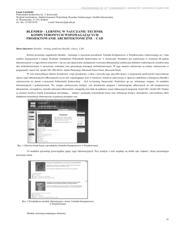 PROCEEDINGS OF 19TH CONFERENCE GEOMETRY GRAPHICS COMPUTER Farid NASSERY Politechnika Krakowska im. T. Kościuszki Wydział Architektury, Zakład Geometrii Wykreślnej, Rysunku Technicznego i Grafiki Inżynierskiej ul. Warszawska, 31-155, Kraków tel./ fax: 12 628 29 92 e-mail: [email protected] BLENDED – LERNING W NAUCZANIU TECHNIK KOMPUTEROWYCH WSPOMAGAJĄCYCH PROJEKTOWANIE ARCHITEKTONICZNE – CAD Słowa kluczowe: blended – lerning, platforma Moodle, e-kursy, CAD Referat prezentuje zagadnienie blended – learningu w nauczaniu przedmiotu Techniki Komputerowe w Projektowaniu, realizowanego na 1 roku studiów stacjonarnych I stopnia Wydziału Architektury Politechniki Krakowskiej im. T. Kościuszki. Przedmiot jest realizowany w wymiarze 60 godzin laboratoryjnych w ciągu dwóch semestrów i ma na celu opanowanie umiejętności tworzenia dokumentacji technicznej obiektów budowlanych, kształtowania idei architektonicznych w przestrzeni wirtualnej oraz prezentację koncepcji architektonicznych. W jego ramach realizowane są tematy wykonywane w programach: AutoCAD, ArchiCAD, 3DS MAX, Adobe Photoshop, Microsoft Power Point, Microsoft Word. W celu intensyfikacji efektów kształcenia z tego przedmiotu, a także z powodu jego specyfiki (pracy w programach graficznych) wprowadzono oprócz zajęć laboratoryjnych odbywających się na sali, wspomagający kurs w internecie. Został on opracowany w oparciu o platformę e-lerningową Moodla i zamieszczony na stronie e-nauczania Politechniki Krakowskiej – ELF (e-learning framework). Podzielono go na: informacje wstępne, 10 modułów laboratoryjnych i podsumowanie. We wstępie zamieszczono kolejno: cele przedmiotu; program i harmonogram odbywanych na sali komputerowej laboratoriów, szczegółowe warunki zaliczenia laboratoriów; netografię oraz linki do pobrania wersji edukacyjnych programu AutoCAD i ArchiCAD. Podane są również możliwe kanały komunikacji prowadzący – student i pomiędzy uczestnikami kursu oraz informacje bieżące -aktualności, wprowadzono także dodatkowe konsultacje elektroniczne za pomocą narzędzia czat. Rys. 1 Główna strona kursu z przedmiotu Techniki Komputerowe w Projektowaniu. 10 modułów prezentuje poszczególne grupy zajęć laboratoryjnych. Przy każdym z nich znajduje się krótki opis zadania i ikona prezentująca poruszany temat. Rys. 2 Przykładowe moduły laboratoryjne z kursu Techniki Komputerowe w Projektowaniu. Moduły zawierają następujące elementy: 41 PROCEEDINGS OF 19TH CONFERENCE GEOMETRY GRAPHICS COMPUTER - cześć teoretyczną w skład, której wchodzi zestaw indywidualnych losowo przydzielonych tematów dla poszczególnych studentów oraz materiały dydaktyczne i pomocnicze obejmujące przykłady prac studentów z poprzednich lat, a także tutoriale do wykonania zajęć laboratoryjnych. Rys. 3 Materiały dydaktyczne zawarte w modułach – tutoriale i przykłady prac. - część sprawdzającą opanowanie materiału w formie testu – quizu - wykorzystującego mechanizmy losowości i możliwości formułowania pytań zaimplementowane na platformie Moodle. Pytania i ich sposób formułowania nawiązują do egzaminów certyfikujących ze znajomości programów CAD – np. z AutoCAD-a. Rys. 4 Przykładowe pytania z quizu sprawdzającego opanowanie wiadomości z zakresu poszczególnych modułów. - kolejnym elementem jest oddanie prac z laboratoriów w formie przesłania plików do oceny. W ciągu semestru przewidziano dwa rodzaje oddania: przesłanie pliku na końcu zajęć laboratoryjnych oraz na przegląd. - wprowadzono także, w jednym z modułów, konkurs na najciekawszą kompozycję z brył związaną z zadaną ideą w formie warsztatów Moodla. Ostatnim modułem jest podsumowanie zawierające test końcowy, w którym wykorzystano możliwości losowego wyboru z każdego zestawu pytań modułowych oraz oddanie prac prezentujących wszystkie projekty laboratoryjne. W kursie znajdują się także elementy tworzone wspólnie ze studentami, takie jak słownik pojęć terminów związanych z komputerowym wspomaganiem projektowania oraz baza danych obiektów 2D i 3D powstała z prac studenckich. Zastosowanie platformy e-lerningowej do wspomagania nauczania przedmiotu Techniki Komputerowe w Projektowaniu pozwoliło na wzmocnienie interakcji pomiędzy prowadzącym zajęcia a studentami, a także na, nieograniczone ramami czasowymi, korzystanie z zasobów informacji, związanych z zagadnieniami z tego przedmiotu. Z kursu obecnie korzysta ok. 99% studentów, co może świadczyć o jego przydatności i funkcjonalności. Literatura: [1] Brzózka P., Moodle dla nauczycieli i trenerów. Zaplanuj, stwórz i rozwijaj platformę e-learningową, Helion, Gliwice, 2011. [2] Jarosińska E., Znaczenie e-kursów w zdalnym uczeniu się, Edukacja –Studia, Badania, Innowacje, nr 2 (110), Warszawa 2010, s. 62–66. [3] Mazur.R., Wirtualne metody nauczania w odniesieniu do przedmiotu techniki komputerowe w projektowaniu CAD, Przestrzeń i forma, nr 11, Szczecin 2009, s. 161-168. [4] Nassery F., Vogt O., Techniki Komputerowe w Projektowaniu, Edukacja –Studia, Badania, Innowacje, nr 2 (110), Warszawa 2010, s. 141–146. [5] Rice W., Tworzenie serwisów e-learningowych z Moodle 1.9, Helion, Gliwice, 2009. [6] Romaniak K., Nowoczesne technologie w nauczaniu matematyki studentów architektury, Edukacja –Studia, Badania, Innowacje, nr 2 (110), , Warszawa 2010, s. 70-75. 42