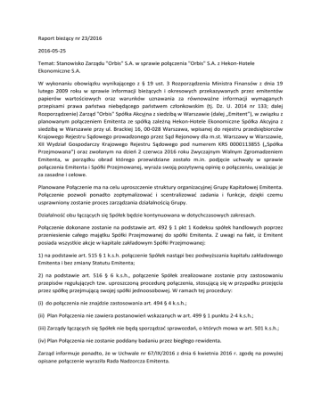 Raport bieżący nr 23/2016 2016-05-25 Temat: Stanowisko Zarządu "Orbis" S.A. w sprawie połączenia "Orbis" S.A. z Hekon-Hotele Ekonomiczne S.A. W wykonaniu obowiązku wynikającego z § 19 ust. 3 Rozporządzenia Ministra Finansów z dnia 19 lutego 2009 roku w sprawie informacji bieżących i okresowych przekazywanych przez emitentów papierów wartościowych oraz warunków uznawania za równoważne informacji wymaganych przepisami prawa państwa niebędącego państwem członkowskim (tj. Dz. U. 2014 nr 133; dalej Rozporządzenie) Zarząd "Orbis" Spółka Akcyjna z siedzibą w Warszawie (dalej „Emitent”), w związku z planowanym połączeniem Emitenta ze spółką zależną Hekon-Hotele Ekonomiczne Spółka Akcyjna z siedzibą w Warszawie przy ul. Brackiej 16, 00-028 Warszawa, wpisanej do rejestru przedsiębiorców Krajowego Rejestru Sądowego prowadzonego przez Sąd Rejonowy dla m.st. Warszawy w Warszawie, XII Wydział Gospodarczy Krajowego Rejestru Sądowego pod numerem KRS 0000113855 („Spółka Przejmowana”) oraz zwołanym na dzień 2 czerwca 2016 roku Zwyczajnym Walnym Zgromadzeniem Emitenta, w porządku obrad którego przewidziane zostało m.in. podjęcie uchwały w sprawie połączenia Emitenta i Spółki Przejmowanej, wyraża swoją pozytywną opinię o połączeniu, uważając je za zasadne i celowe. Planowane Połączenie ma na celu uproszczenie struktury organizacyjnej Grupy Kapitałowej Emitenta. Połączenie pozwoli ponadto zoptymalizować i scentralizować zadania i funkcje, dzięki czemu usprawniony zostanie proces zarządzania działalnością Grupy. Działalność obu łączących się Spółek będzie kontynuowana w dotychczasowych zakresach. Połączenie dokonane zostanie na podstawie art. 492 § 1 pkt 1 Kodeksu spółek handlowych poprzez przeniesienie całego majątku Spółki Przejmowanej do spółki Emitenta. Z uwagi na fakt, iż Emitent posiada wszystkie akcje w kapitale zakładowym Spółki Przejmowanej: 1) na podstawie art. 515 § 1 k.s.h. połączenie Spółek nastąpi bez podwyższania kapitału zakładowego Emitenta i bez zmiany Statutu Emitenta; 2) na podstawie art. 516 § 6 k.s.h., połączenie Spółek zrealizowane zostanie przy zastosowaniu przepisów regulujących tzw. uproszczoną procedurę połączenia, stosującą się w przypadku przejęcia przez spółkę przejmującą swojej spółki jednoosobowej. W ramach tej procedury: (i) do połączenia nie znajdzie zastosowania art. 494 § 4 k.s.h.; (ii) Plan Połączenia nie zawiera postanowień wskazanych w art. 499 § 1 punktu 2-4 k.s.h.; (iii) Zarządy łączących się Spółek nie będą sporządzać sprawozdań, o których mowa w art. 501 k.s.h.; (iv) Plan Połączenia nie zostanie poddany badaniu przez biegłego rewidenta. Zarząd informuje ponadto, że w Uchwale nr 67/IX/2016 z dnia 6 kwietnia 2016 r. zgodę na powyżej opisane połączenie wyraziła Rada Nadzorcza Emitenta. Plan połączenia został udostępniony na stronie internetowej Emitenta i ogłoszony w raporcie bieżącym nr 16/2016. __________________________________________________________________________________ "Orbis" S.A. ul. Bracka 16, 00-028 Warszawa, zarejestrowana w Sądzie Rejonowym dla m.st. Warszawy XII Wydział Gospodarczy, KRS Rejestr Przedsiębiorców 0000022622, wysokość kapitału zakładowego: 92.154.016 zł (wpłacony w całości), NIP 526-025-04-69.