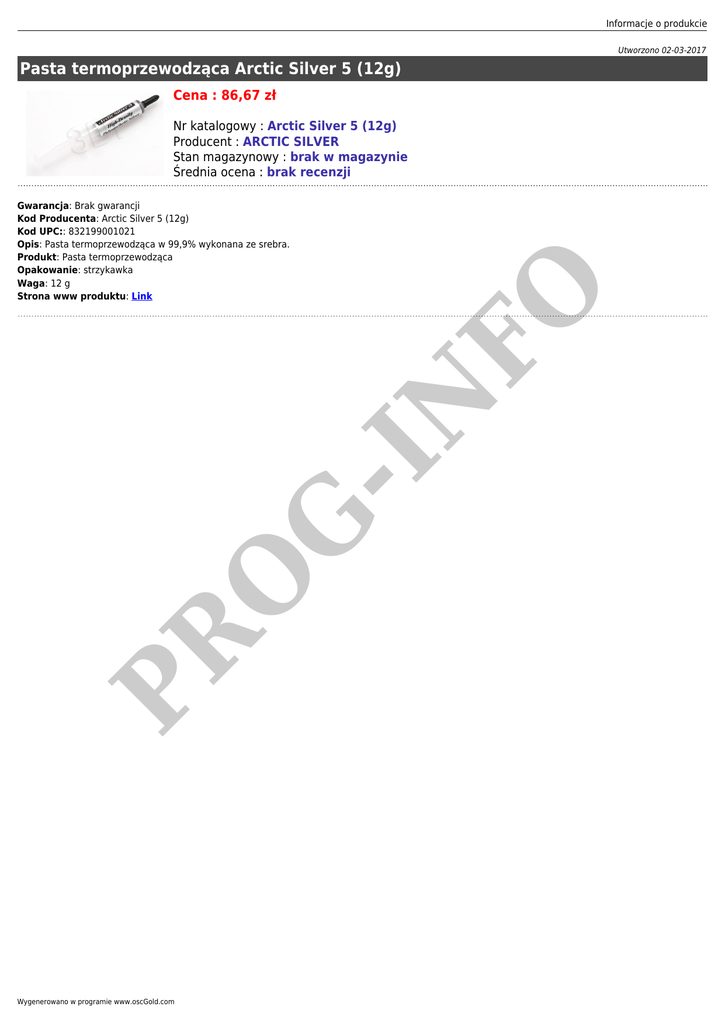 Informacje o produkcie Utworzono 02-03-2017 Pasta termoprzewodząca Arctic Silver 5 (12g) Cena : 86,67 zł PR O G -I N Gwarancja: Brak gwarancji Kod Producenta: Arctic Silver 5 (12g) Kod UPC:: 832199001021 Opis: Pasta termoprzewodząca w 99,9% wykonana ze srebra. Produkt: Pasta termoprzewodząca Opakowanie: strzykawka Waga: 12 g Strona www produktu: Link FO Nr katalogowy : Arctic Silver 5 (12g) Producent : ARCTIC SILVER Stan magazynowy : brak w magazynie Średnia ocena : brak recenzji Wygenerowano w programie www.oscGold.com
