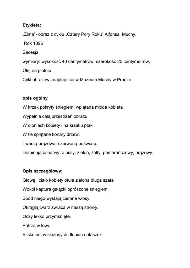Etykieta: „Zima”- obraz z cyklu „Cztery Pory Roku” Alfonsa Muchy. Rok 1896 Secesja wymiary: wysokość 40 centymetrów, szerokość 20 centymetrów, Olej na płótnie Cykl obrazów znajduje się w Muzeum Muchy w Pradze opis ogólny W krzak pokryty śniegiem, wplątana młoda kobieta Wypełnia całą przestrzeń obrazu W dłoniach kobiety i na krzaku ptaki. W tle splątane konary drzew. Tworzą brązowo- czerwoną poświatę. Dominujące barwy to biały, zieleń, żółty, pomarańczowy, brązowy. Opis szczegółowy; Głowę i ciało kobiety otula zielona długa szata Wokół kaptura gałązki oprószone śniegiem Spod niego wystają ciemne włosy Okrągłą twarz zwraca w naszą stronę. Oczy lekko przymknięte. Patrzą w lewo. Blisko ust w skulonych dłoniach ptaszek Kobieta dmucha w jego stronę Na wysokości piersi, na krzaku trzy pozostałe ptaszki Z lewej, spod lekko rozsuniętej szaty, wysunięta goła stopa. W dolnym prawym rogu autor umieścił swoją czarną sygnaturkę - mucha Ciekawostki: Mucha namalował kilka cykli noszących nazwę „Cztery pory Roku” Znakiem rozpoznawczym Muchy są grafiki kobiet z kwiatami i liśćmi. Mucha jest mistrzem secesji. Prace Muchy olśniewają i zachwycają. Są przede wszystkim hołdem złożonym kobiecemu pięknu.