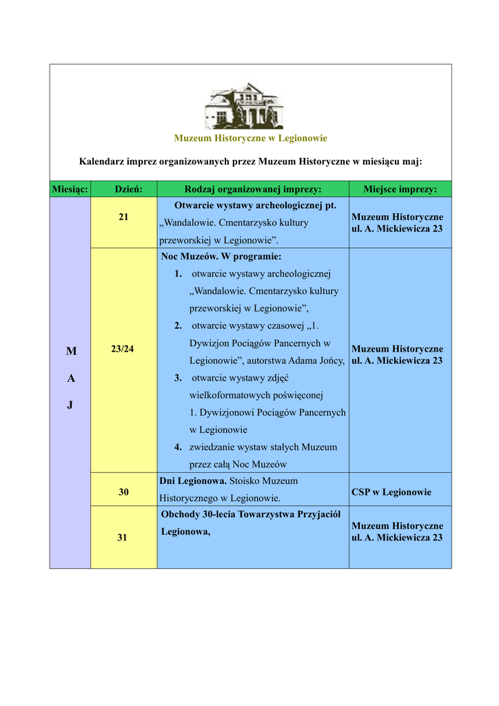 Muzeum Historyczne w Legionowie Kalendarz imprez organizowanych przez Muzeum Historyczne w miesiącu maj: Miesiąc: Dzień: Rodzaj organizowanej imprezy: Miejsce imprezy: Otwarcie wystawy archeologicznej pt. 21 „Wandalowie. Cmentarzysko kultury Muzeum Historyczne ul. A. Mickiewicza 23 przeworskiej w Legionowie”. Noc Muzeów. W programie: 1. otwarcie wystawy archeologicznej „Wandalowie. Cmentarzysko kultury przeworskiej w Legionowie”, 2. M Dywizjon Pociągów Pancernych w 23/24 A otwarcie wystawy czasowej „1. Muzeum Historyczne Legionowie”, autorstwa Adama Jońcy, ul. A. Mickiewicza 23 3. otwarcie wystawy zdjęć wielkoformatowych poświęconej J 1. Dywizjonowi Pociągów Pancernych w Legionowie 4. zwiedzanie wystaw stałych Muzeum przez całą Noc Muzeów Dni Legionowa. Stoisko Muzeum 30 Historycznego w Legionowie. CSP w Legionowie Obchody 30-lecia Towarzystwa Przyjaciół 31 Legionowa, Muzeum Historyczne ul. A. Mickiewicza 23 Kalendarz imprez organizowanych przez Miejski Ośrodek Kultury miesiącu czerwiec: Miesiąc: Dzień: Rodzaj organizowanej imprezy: Otwarcie Wystawy – Pracownia MOK, ul. 3 Targowa Legionowski Ratusz ul. marsz. J. Piłsudskiego 41 Koncert muzyki klasycznej – Marek Legionowski Ratusz ul. marsz. J. Piłsudskiego 41 Pawłowicz Film dla dzieci „AUTA” Legionowski Ratusz ul. marsz. J. Piłsudskiego 41 Wybory do Europarlamentu Miejski Ośrodek Kultury w Legionowie ul. Norwida 10 Koncert - „Fumanek” Legionowski Ratusz ul. marsz. J. Piłsudskiego 41 7, g. 15.00 C Legionowski Ratusz ul. marsz. J. Piłsudskiego 41 Teatr – “Reflektor na tatę” 5, g. 19.00 6 Miejsce imprezy: Z E R W I E C 13, g. 19.00 14, g. 15.00, g. Niedzielne Spotkania z Bajką „Cudowna 16.30 lampa Aladyna” Legionowski Ratusz ul. marsz. J. Piłsudskiego 41 18, g. 19.00 Kabaret Moralnego Niepokoju Legionowski Ratusz ul. marsz. J. Piłsudskiego 41 19, g. 18.00 Koncert – Open Mind Fest vol. 5 Miejski Ośrodek Kultury w Legionowie ul. Norwida 10 g. 18.00 Maraton filmowy Bond g. 15.00 – 18.00 Dzień Przedszkolaka Legionowski Ratusz ul. marsz. J. 21 Piłsudskiego 41 Park Jana Pawła II w Legionowie 22 Początek akcji „Lato w Mieście” Miejski Ośrodek Kultury w Legionowie ul. Norwida 10 26, g. 19.00 Maraton Klubu Filmowego Powietrza Miejski Ośrodek Kultury w Legionowie ul. Norwida 10 27, g. 20.00 „Powiązania” (wernisaż + program Miejski Ośrodek Kultury w Legionowie ul. Norwida 10 poetycki) 28 Piknik Rodzinny Osiedle Kozłówka Kalendarz imprez organizowanych przez Bibliotekę w miesiącach maj i czerwiec: Miesiąc: Dzień: Rodzaj organizowanej imprezy: Miejsce imprezy: Ekspozycja wystawy „Książka wczoraj dziś kwiecień/maj jutro: od tabliczki glinianej do przekazu Biblioteka ul. W. elektronicznego”. Wystawa czynna do 16 Broniewskiego 7 maja 2009. 8, godz.19.00 M A J Wernisaż wystawy „Legionowo Balonowe Legionowski Ratusz Miasto” organizowanej z okazji 90. rocznicy ul. marsz. J. nadania nazwy Legionowo. Wystawa czynna Piłsudskiego 41 do 31 maja 2009. Wernisaż wystawy fotograficznej „Makro Legionowo” organizowanej z okazji Dni Legionowa” pod honorowym patronatem Prezydenta Miasta Legionowo Romana 22, godz.19.15 Smogorzewskiego. Wystawa czynna do 12 czerwca 2009. Autorami prezentowanych zdjęć wykonanych na terenie naszego miasta są uczestnicy warsztatów z makro fotografii organizowanych przez Bibliotekę. • Udział Biblioteki w finale Dni Legionowa. Na stoisku Biblioteki Biblioteka ul. W. Broniewskiego 7 30 1. 2. 3. 4. • C Z 6 W I E CSP w Legionowie Finał VI Legionowskiego Konkursu Literackiego o zasięgu ogólnopolskim Biblioteka ul. W. 5, godz. 19.15 organizowanego pod honorowym patronatem Broniewskiego 7 Prezydenta Miasta Legionowo Romana Smogorzewskiego. E R m. in.: książka gratis wystawa „W 80 bajek dookoła świata” wystawa „Balony, latawce, wiatr” konkursy, zabawy, niespodzianki godz. 14.00 – 15.00 – Pokazy i zawody rodzinne latawców w ramach Festiwalu Wiatru 2009 Udział w festynie rodzinnym organizowanym przez Księdza Proboszcza parafii Matki Bożej Fatimskiej w Legionowie Na stoisku Biblioteki m. in.: Plac przed Kościołem 1. książka gratis ul. Orląt Lwowskich 8 2. wystawy 3. konkursy, zabawy, niespodzianki Wernisaż autorskiej wystawy fotografii 19,godz.19.15 Joanny Bronickiej „Magia starych aut”. Wystawa czynna do 28 sierpnia 2009. C 22 czerwca 28 sierpnia Biblioteka ul. W. Broniewskiego 7 Wakacje w Bibliotece, zajęcia w ramach Biblioteka ul. W. akcji „Lato w Legionowie”(m. in. konkursy, Broniewskiego 7 gry, zabawy grupowe, zajęcia plastyczne, zajęcia tematyczne (np. W magicznym świecie lalek teatralnych). Kalendarz imprez organizowanych przez Miejski Ośrodek Sportu i Rekreacji w miesiącach maj, czerwiec i lipiec: Miesiąc: Dzień: Rodzaj organizowanej imprezy: Miejsce imprezy: 9 Polska Biega Stadion Miejski w Legionowie 9 II Grand Prix Amatorów w Tenisie Stołowym (7 turniej) FINAŁ Szkoła Podstawowa nr 7 10 13-14 XII Mistrzostwa Legionowa w Brydżu Sportowym ZSO 2 Turniej Piłki Nożnej chłopców z okazji nadania im. J. Kusocińskiego Gim. Nr 3 Stadion Miejski w Legionowie M 16 Grand Prix Legionowa w Koszykówkę (7 turniej) Szkoła Podstawowa nr 7 A 18 Turniej Piłki Nożnej dla Uczniów Szkół Ponadgimnazjalnych – klasy I Stadion Miejski w Legionowie J 19 Turniej Piłki Nożnej dla Uczniów Szkół Ponadgimnazjalnych – klasy II Stadion Miejski w Legionowie 21 Mityng Lekkoatletyczny Szkół Gimnazjalnych z okazji nadania im. J. Kusocińskiego Gim. Nr 3 Stadion Miejski w Legionowie 22 Biegi Przedszkolaków Stadion Miejski w Legionowie 23 Szachowe Mistrzostwa ZS w Legionowie Zespół Szkół w Legionowie 24 ŻTC BIKE RACE LEGIONOWO 2009 – wyścig rowerowy Start ze Stadionu Miejskiego 6 VI Mistrzostwa Juniorów w Szachach Szkoła Podstawowa nr 7 8 Turniej Piłki Nożnej dla Uczniów Szkół Gimnazjalnych – klasy I Stadion Miejski w Legionowie 9 Turniej Piłki Nożnej dla Uczniów Szk