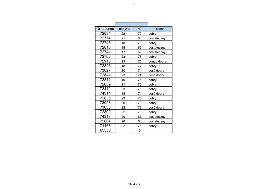 1 Nr albumu II test zal. 72834 22 72774 21 72745 18 72810 15 72741 17 72768 23 72910 23 72828 18 73027 20 72844 23 72811 19 72839 21 73412 23 74314 18 72835 23 73028 20 73030 22 72802 22 74313 20 72804 20 71468 22 65350 % 79 66 75 62 69 76 75 77 74 74 76 76 75 74 75 73 72 76 67 66 76 0 GR 4.xls ocena dobry dostateczny dobry dostateczny dostateczny dobry ponad dobry dobry dość dobry dość dobry dobry dobry dobry dość dobry dobry dobry dość dobry dobry dostateczny dostateczny dobry