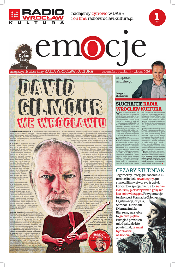 1 nadajemy cyfrowo w DAB + i on line: radiowroclawkultura.pl nr Bob Dylan 3 str. fakty i mity magazyn kulturalny RADIA WROCŁAW KULTURA egzemplarz bezpłatny - wiosna 2016 wstępniak naczelnego Grzegorz Chojnowski SŁUCHAJCIE RADIA WROCŁAW KULTURA W 30 lipca 1966 w londyńskim finale Mistrzostw Świata, Anglicy pokonują Niemców. W tym samym czasie, wychudzony do granic możliwości, dwudziestoletni Gilmour, wraz z muzykami zespołu Jokers Wild, znajduje się w dusznym i zatłoczonym przedziale pociągu osobowego zmierzającego do Malagi. Instrumenty, podobnie jak portfele i morale młodych muzyków, określić można jednym słowem: strzępy. Pierwsza próba podboju Europy spali na panewce kilka miesięcy później, kiedy Gilmourowi zakończy się rezydentura we francuskich i holenderskich klubach. Ale niepowodzenia tylko determinują go do wytężonej pracy. Powrót do rodzinnego gniazda z podkulonym ogonem byłby przyznaniem się do klęski. Z kontynentu Gilmour udaje się nie do Cambridge, a do Londynu. Właśnie tam, w połowie 1967 roku, spotyka znajomych z Pink Floyd oraz będącego na skraju załamania Syda Barretta. Kilka miesięcy później zostanie poproszony o dołączenie do koncertowego składu grupy. Po latach powie: Pomyślałem, że jestem w stanie nadać Pink Floyd nową jakość. Oczywiście nada, to w głównej mierze dźwięk jego gitary będzie z wolna kształtował brzmienie zespołu. Na koncercie, jeśli wierzyć set listom z amerykańskiej części trasy, obok klasycznych kompozycji z epoki Ciemnej Strony Księżyca i Ściany, wysłuchamy też post-watersowskiego rozdziału grupy. Ważnego. To w końcu zajadłe próby pogrzebania zespołu przez Watersa sprawiły, że Gilmour wraz z Nickiem Masonem postanowili reanimować legendę. Obok „Time”, „Comfortably Numb” czy „High Hopes”, nie zabraknie najważniejszego utworu z nowego albumu, emocji zaklętych w 7 minutach „In Any Tongue”. To tutaj Gilmour najpełniej pokazuje, dlaczego jest jednym z najlepszych i najbardziej rozpoznawalnych gitarzystów w historii. Niby nic nowego, znamy przecież tę gitarę, a jednak wzrusza jak nigdy. Nihil novi. Na pewno odezwą się głosy, że to już było grane. Zarówno muzyczne pomysły, jak i zapraszanie legendy, dla innych, dinozaura. Rzeczywiście, bez gitary, David Gilmour na pierwszy rzut oka bardziej przypomina lokatora Hotelu Zacisze niż gwiazdę rocka. Ale w przypadku tego artysty, wszystko jest na swoim miejscu, nie ma potrzeby niczego udowadniać. Jeśli twoja muzyka inspirowała i wciąż inspiruje nowe pokolenia, jeśli przekroczyła ziemskie granice i zabrzmiała w kosmosie, potrzeba tworzenia i grania wypływa już tylko z czystej pasji i mocy twórczej, nie zaś z oglądania się na stan konta. I tym przede wszystkim różni się David Gilmour od całej masy sympatycznych choć zdradzających w pewnym wieku skłonności do szansonizmu, retro wyjadaczy. Oddajmy zresztą na moment głos Leszkowi Możdżerowi, który zagra u boku Davida Gilmoura: Jego charyzma, jego dokonania i to, jakie miejsce zajął w historii powodują, że samo wyjście z nim na scenę, to piękny sygnał dla nas wszystkich, że uczestniczymy w światowej kulturze i w światowej historii muzyki. Było Grane, so bo Nie t 16:00-20:00 dz. go a, Londyn, 17 lipca 2015. Dziennikarz BBC Matt Everitt, kończąc rozmowę dotyczącą albumu „Rattle That Lock” oraz trasy, która będzie promować to wydawnictwo, pyta gitarzystę, czy po tylu latach na scenie, nie opuścił go dreszczyk podniecenia i ekscytacji płynącej z grania na żywo. Grania, które po raz pierwszy usłyszymy we Wrocławiu, a którego zwieńczenie dokona się w Pompejach. Odpowiedzi nasz bohater udziela po kilkusekundowej ciszy: Czuję podniecenie, nerwy, ale i odrobinę strachu. I dodaje: Wszyscy muzycy, z którymi będę grał, zadzwonili do mnie, mówiąc zgodnie: nie możemy się doczekać! Muzycy ci towarzyszą artyście od 2006 roku. To z nimi nagrał wtedy album „On an Island” i ostatni „Rattle That Lock”. Brakuje jedynie Ricka Wrighta, któremu dedykowana została pożegnalna płyta Pink Floyd „Endless River”, oraz „A Boat Lies Waiting”, epitafium dla przyjaciela, w którym Graham Nash i David Crosby wokalnie wspierają Gilmoura. Jest też i syn artysty, Gabriel Gilmour, którego głos – archiwalny głos kilkumiesięcznego Gabriela (dziś osiemnastolatka) – przechodzi w słyszany w oddali monolog Wrighta o morzu. W końcu żeglowanie stanowiło dla niego miłość największą. To nie jest najważniejszy utwór na „Rattle That Lock”, ale zdecydowanie najpiękniejszy, w pełni oddający kruchość a zarazem powab ludzkiego życia. I to życie stanowi osnowę, wokół której zbudowany jest ten album. Dla siedemdziesięcioletniego dziś artysty, „Rattle That Lock”, napisany wspólnie z żoną i pisarką w jednej osobie, Polly Samson, jest na poły autobiograficzny, na poły zaś to „Dark Side of The Moon” szyte na miarę współczesności. Michał Kwiatkowski Ż eter. Europejskimi liderami DAB+ są Dania, Norwegia, Szwajcaria, Wielka Brytania, Niemcy. W Polsce w tej technologii nadają swoje audycje rozgłośnie publicznego radia (Radio Wrocław jest krajowym pionierem). We Wrocławiu i okolicach można dziś w cyfrowej jakości słuchać 10 stacji. est jeszcze jeden sposób na posłuchanie i zobaczenie nas. Na stronie radiowroclawkultura.pl przez całą dobę działa streaming wideo. Rozmowy z zaproszonymi gośćmi można zatem obejrzeć na żywo także z obrazem z jednego z najnowocześniejszych studiów radiowych w Polsce. Mamy cztery kamery, które wyczuwają ludzki głos i potrafią automatycznie ustawiać kadry. Niektórzy mówią, że Radio Wrocław Kultura to właściwie już telewizja. ardzo serdecznie zapraszamy. Wszyscy jesteście mile widziani. Możecie do nas zadzwonić (nr do studia: 71 780 23 02) i napisać: kultura@ radiowroclaw.pl. Zaglądnijcie też na na