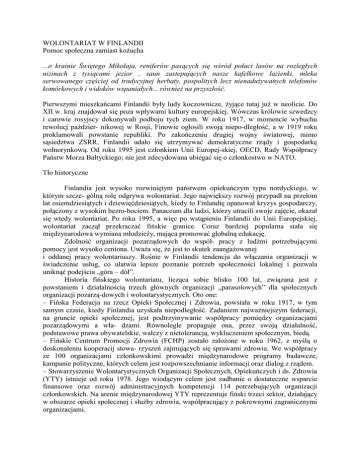 WOLONTARIAT W FINLANDII Pomoc społeczna zamiast koŜucha ...o krainie Świętego Mikołaja, reniferów pasących się wśród połaci lasów na rozległych nizinach z tysiącami jezior , saun zastepujących nasze kafelkowe łazienki, mleka serwowanego częściej od tradycyjnej herbaty, pospolitych lecz nienaduŜywanych telefonów komórkowych i widoków wspaniałych... równieŜ na przyszłość. Pierwszymi mieszkańcami Finlandii były ludy koczownicze, Ŝyjące tutaj juŜ w neolicie. Do XII w. kraj znajdował się poza wpływami kultury europejskiej. Wówczas królowie szwedzcy i carowie rosyjscy dokonywali podboju tych ziem. W roku 1917, w momencie wybuchu rewolucj paździer- nikowej w Rosji, Finowie ogłosili swoją niepo-dległość, a w 1919 roku proklamowali powstanie republiki. Po zakończeniu drugiej wojny światowej, mimo sąsiedztwa ZSRR, Finlandii udało się utrzymywać demokratyczne rządy i gospodarkę wolnorynkową. Od roku 1995 jest członkiem Unii Europej-skiej, OECD, Rady Współpracy Państw Morza Bałtyckiego; nie jest zdecydowana ubiegać się o członkostwo w NATO. Tło historyczne Finlandia jest wysoko rozwiniętym państwem opiekuńczym typu nordyckiego, w którym szcze- gólną rolę odgrywa wolontariat. Jego największy rozwój przypadł na przełom lat osiemdziesiątych i dziewięćdziesiątych, kiedy to Finlandię opanował kryzys gospodarczy, połączony z wysokim bezro-bociem. Panaceum dla ludzi, którzy utracili swoje zajęcie, okazał się wtedy wolontariat. Po roku 1995, a więc po wstąpieniu Finlandii do Unii Europejskiej, wolontariat zaczął przekraczać fińskie granice. Coraz bardziej popularna stała się międzynarodowa wymiana młodzieŜy, mająca promować globalną edukację. Zdolność organizacji pozarządowych do współ- pracy z ludźmi potrzebującymi pomocy jest wysoko ceniona. UwaŜa się, Ŝe jest to skutek zaangaŜowanej i oddanej pracy wolontariuszy. Rośnie w Finlandii tendencja do włączania organizacji w świadczenie usług, co ułatwia lepsze poznanie potrzeb społeczności lokalnej i pozwala uniknąć podejścia „góra – dół”. Historia fińskiego wolontariatu, licząca sobie blisko 100 lat, związana jest z powstaniem i działalnością trzech głównych organizacji „parasolowych” dla społecznych organizacji pozarzą-dowych i wolontarystycznych. Oto one: – Fińska Federacja na rzecz Opieki Społecznej i Zdrowia, powstała w roku 1917, w tym samym czasie, kiedy Finlandia uzyskała niepodległość. Zadaniem najwaŜniejszym federacji, na gruncie opieki społecznej, jest podtrzymywanie współpracy pomiędzy organizacjami pozarządowymi a wła- dzami. Równolegle propaguje ona, przez swoją działalność, podstawowe prawa obywatelskie, walczy z nietolerancją, wykluczeniem społecznym, biedą. – Fińskie Centrum Promocji Zdrowia (FCHP) zostało załoŜone w roku 1962, z myślą o doskonaleniu kooperacij stowa- rzyszeń zajmujących się sprawami zdrowia. We współpracy ze 100 organizacjami członkowskimi prowadzi międzynarodowe programy badawcze, kampanie polityczne, których celem jest rozpowszechnianie informacji oraz dialog z rządem. – Stowarzyszenie Wolontarystycznych Organizacji Społecznych, Opiekuńczych i ds. Zdrowia (YTY) istnieje od roku 1978. Jego wiodącym celem jest zadbanie o dostateczne wsparcie finansowe oraz rozwój administracyjnych kompetencji 114 potrzebujących organizacji członkowskich. Na arenie międzynarodowej YTY reprezentuje fiński trzeci sektor, działający w obszarze opieki społecznej i słuŜby zdrowia, współpracujący z pokrewnymi zagranicznymi organizacjami. Wymienione organizacje „parasolowe” oraz ich organizacje członkowskie w duŜej mierze finansowane są od ponad 60 lat, co nietypowe, przez fińskie Stowarzyszenie ds. Automatów do Gry (RAY). Posiada ono wyłączność jako operator gier hazar- dowych. Europejski Trybunał Sprawiedliwości (European Court of Justice) utrzymał ostatnio w mocy status monopolisty RAY, który finansuje organizacje w duŜej mierze oparte na wolontariacie, dotyczące usług socjalnych (w 17%) oraz usług zdrowotnych (w 8%) w Finlandii. Wolontariat a sektor publiczny Główna odpowiedzialność za świadczenie usług opiekuńczych spoczywa na fińskim sektorze publicznym. Lokalnymi koordynatorami takich usług są m.in. urzędy miasta, np. w Helsinkach – Komisja ds. Wolontariatu1. Charakter uzupełniający ma działalność organizacji pozarządowych i sektora prywatnego. Organizacje pozarządowe nie spoczywają na laurach, promują wolontariat, zachęcają obywateli do aktywnego uczestniczenia w Ŝyciu publicznym, promują Ŝywy i oddolny dialog oraz wpływają na kreowanie polityki. Rząd, aprobując te działania, bezpośrednio konsultuje się ze wszystkimi trzema wyŜej wy- mienionymi organizacjami. Jest powszechną praktyką zapraszanie przedstawicieli organizacji poza- rządowych do udziału w komitetach międzyministerialnych odpowiedzialnych za przygotowanie nowych aktów prawnych. Organizacje te są równieŜ regularnie proszone o przysyłanie przedstawicieli na posiedzenia parlamentarne. Proces tworzenia polityki jest powszechnie uwaŜany za przejrzysty i uczciwy. Jednak niektóre organizacje uwaŜają, Ŝe nie jest to wystarczające i Ŝe rząd powinien zwrócić większą uwagę na inicjatywy i Ŝądania obywateli. W pierwszej połowie 1999 roku rząd premiera Paava Lipponena, u progu swego urzędowania, po raz pierwszy gościł pracowników i wolontariuszy organizacji pozarządowych. Spotkanie to miało na celu wspólne opracowanie narodowego systemu planowania spraw społecznych i zdrowia. Owocem tej debaty jest projekt rządowego programu w sprawie usług społecznych i zdrowotnych na lata 2000-2003, którego realizacja będzie monitorowana zarówno przez przedstawicieli rządu, jak i organizacji pozarządowych. Ma on słuŜyć efektywnemu zaspokajaniu potrzeb obywateli, minimalizowaniu marginesu społecznego, ludzki