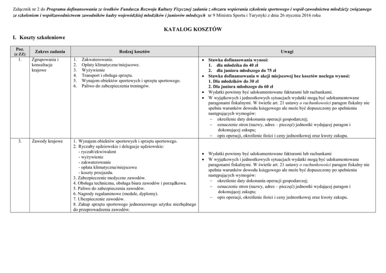 Załącznik nr 2 do Programu dofinansowania ze środków Funduszu Rozwoju Kultury Fizycznej zadania z obszaru wspierania szkolenia sportowego i współ-zawodnictwa młodzieży związanego ze szkoleniem i współzawodnictwem zawodników kadry wojewódzkiej młodzików i juniorów młodszych nr 9 Ministra Sportu i Turystyki z dnia 26 stycznia 2016 roku KATALOG KOSZTÓW I. Koszty szkoleniowe Poz. (z ZZ) Rodzaj kosztów Zakres zadania 1. Zgrupowania i konsultacje krajowe 1. 2. 3. 4. 5. 6. Zakwaterowanie. Opłaty klimatyczne/miejscowe. Wyżywienie Transport i obsługa sprzętu. Wynajem obiektów sportowych i sprzętu sportowego. Paliwo do zabezpieczenia treningów. 3. Zawody krajowe 1. Wynajem obiektów sportowych i sprzętu sportowego. 2. Ryczałty sędziowskie i delegacje sędziowskie: - ryczałt/ekwiwalent - wyżywienie - zakwaterowanie - opłata klimatyczna/miejscowa - koszty przejazdu. 3. Zabezpieczenie medyczne zawodów. 4. Obsługa techniczna, obsługa biura zawodów i porządkowa. 5. Paliwo do zabezpieczenia zawodów. 6. Nagrody regulaminowe (medale, dyplomy). 7. Ubezpieczenie zawodów. 8. Zakup sprzętu sportowego jednorazowego użytku niezbędnego do przeprowadzenia zawodów. Uwagi Stawka dofinasowania wynosi: 1. dla młodzika do 40 zł 2. dla juniora młodszego do 75 zł Stawka dofinansowania w akcji miejscowej bez kosztów noclegu wynosi: 1. Dla młodzików do 30 zł 2. Dla juniora młodszego do 60 zł Wydatki powinny być udokumentowane fakturami lub rachunkami. W wyjątkowych i jednostkowych sytuacjach wydatki mogą być udokumentowane paragonami fiskalnymi. W świetle art. 21 ustawy o rachunkowości paragon fiskalny nie spełnia warunków dowodu księgowego ale może być dopuszczony po spełnieniu następujących wymogów: określenie daty dokonania operacji gospodarczej; oznaczenie stron (nazwy, adres – pieczęć) jednostki wydającej paragon i dokonującej zakupu; opis operacji, określenie ilości i ceny jednostkowej oraz kwoty zakupu. Wydatki powinny być udokumentowane fakturami lub rachunkami W wyjątkowych i jednostkowych sytuacjach wydatki mogą być udokumentowane paragonami fiskalnymi. W świetle art. 21 ustawy o rachunkowości paragon fiskalny nie spełnia warunków dowodu księgowego ale może być dopuszczony po spełnieniu następujących wymogów: określenie daty dokonania operacji gospodarczej; oznaczenie stron (nazwy, adres – pieczęć) jednostki wydającej paragon i dokonującej zakupu; opis operacji, określenie ilości i ceny jednostkowej oraz kwoty zakupu.