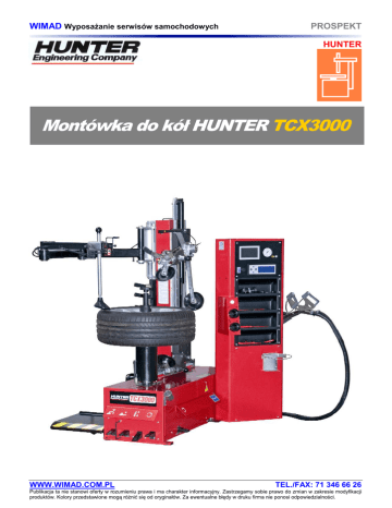 WIMAD Wyposażanie serwisów samochodowych PROSPEKT HUNTER Montówka do kół HUNTER TCX3000 WWW.WIMAD.COM.PL TEL./FAX: 71 346 66 26 Publikacja ta nie stanowi oferty w rozumieniu prawa i ma charakter informacyjny. Zastrzegamy sobie prawo do zmian w zakresie modyfikacji produktów. Kolory przedstawione mogą różnić się od oryginałów. Za ewentualne błędy w druku firma nie ponosi odpowiedzialności. WIMAD Wyposażanie serwisów samochodowych PROSPEKT HUNTER Ramię wspomagające montaż opon Zespół pompowania wraz niskoprofilowych oraz typu RunFlat. z manometrami oraz ekranem kamery (opcjonalnie). Zespół inflacji powietrza (opcjonalnie) wraz z szafką na podręczne narzędzia. Górne rolki dociskowe ułatwiające montaż i demontaż opon niskoprofilowych i RunFlat. Dźwignik (opcjonalnie) unoszący koło na wysokość stołu montażowego (udźwig do 100kg). Dolna rolka ułatwiająca demontaż opony z felgi. Montówka TCX3000 jest urządzeniem przeznaczonym do obsługi kół samochodów osobowych i dostawczych o średnicach do 34” (szerokość do 420 mm). TCX wyposażona jest w dwie rolki służące do zbijania opony z felgi. Jedna z nich – górna umieszczona jest w specjalnej obrotowej i opatentowanej głowicy wyposażonej także w bezdotykowy przyrząd zastępujący zwykłą łyżkę montażową. Wymienione wyposażenie oraz pomocnicze ramię dociskowe pozwalają na montaż i demontaż opon niskoprofilowych oraz typu RunFlat. W obsłudze dużych i ciężkich kół przydatny jest pneumatyczny dźwignik (opcja). Koło po uniesieniu dźwignikiem umieszczane jest na stole montażowym wyposażonym w centralny system mocowania. WWW.WIMAD.COM.PL Dane: TCX3000 Zakres średnic felg 12-34” Maksymalna szerokość felgi 15” Maksymalna szerokość kompletnego koła Maksymalna średnica kompletnego koła Masa montówki Zasilanie elektryczne Zasilanie pneumatyczne Prędkości stołu 420 mm (16,5”) 1250 mm (49”) 461 kg 230 V / 1 faza / 50/60 Hz 10 bar 7 i 17 obr./min TEL./FAX: 71 346 66 26 Publikacja ta nie stanowi oferty w rozumieniu prawa i ma charakter informacyjny. Zastrzegamy sobie prawo do zmian w zakresie modyfikacji produktów. Kolory przedstawione mogą różnić się od oryginałów. Za ewentualne błędy w druku firma nie ponosi odpowiedzialności.