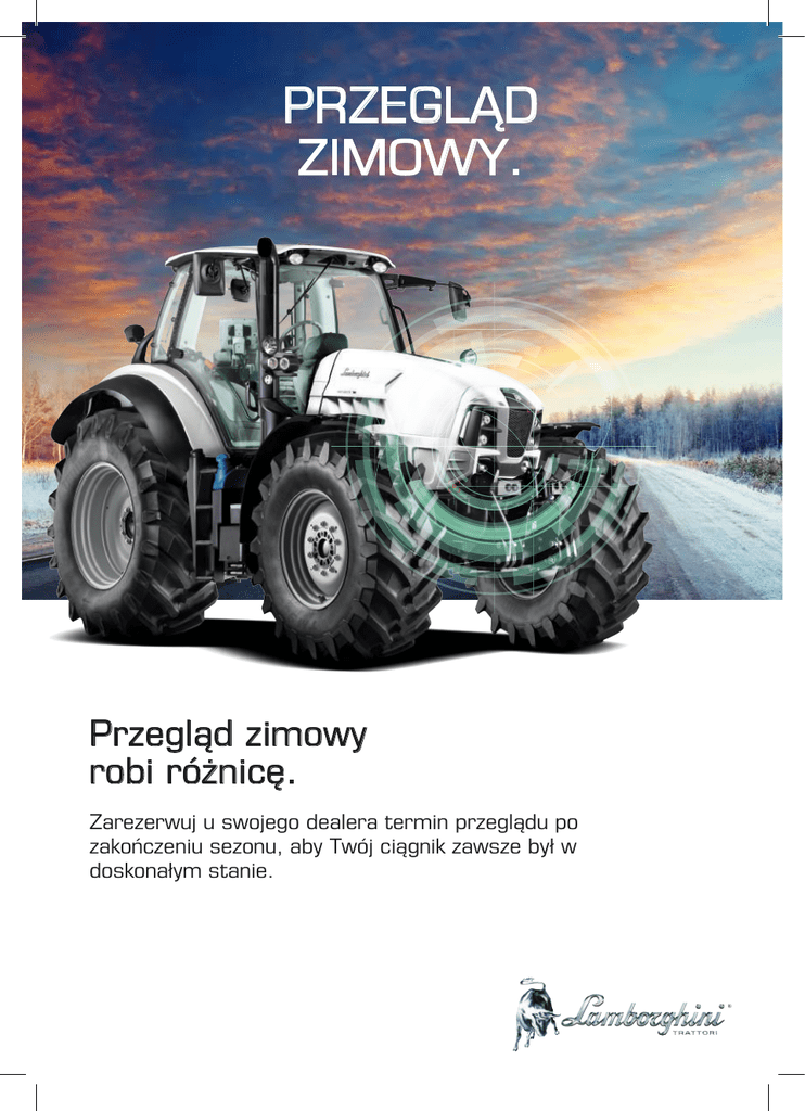 PRZEGLĄD ZIMOWY. Przegląd zimowy robi różnicę. Zarezerwuj u swojego dealera termin przeglądu po zakończeniu sezonu, aby Twój ciągnik zawsze był w doskonałym stanie. Oryginalne części zamienne. Przegląd zimowy. TERAZ, PO ZAKOŃCZENIU SEZON PRAC, TWÓJ CIĄGNIK POTRZEBUJE PRZEGLĄDU. Ciągnik pracował w ciężkich warunkach i teraz musi zostać sprawdzony, zanim odstawisz go do garażu na zimę. Teraz, kiedy skończył się sezon prac Twojego ciągnika, zadbaj o jego szczegółowy i kompleksowy przegląd. W ten sposób zapewnisz sobie bezproblemowy początek prac w kolejnym sezonie. Zaniedbywanie maszyny lub powierzanie jej nieautoryzowanym serwisom lub samodzielne wykonywanie przeglądu nie przyniesie oszczędności. O wiele lepiej jest zrobić wszystko jak trzeba, korzystając z promocji na przeglądy posezonowe oferowane przez Lamborghini Trattori. Otrzymasz zniżkę na większość części zamiennych wykorzystanych podczas przeglądu, w tym na filtry, pasy, hamulce, sprzęgła, akumulatory, części silnika, smary i olej. Zadzwoń do dealera i zarezerwuj termin już teraz! Więcej informacji na stronie lamborghini-tractors.com lub u dealera. Lamborghini Trattori jest marką grupy Zalety zimowego przeglądu przeprowadzanego w autoryzowanym centrum serwisowym Lamborghini Trattori to: •Stale aktualizowana wiedza i doświadczenie techników szkolonych przez Lamborghini Trattori. •W razie potrzeby wsparcie techniczne producenta. •Wykorzystanie oryginalnych części zamiennych, co gwarantuje jakość i niezawodność. 10% zniżki! na części zamienne wymieniane podczas przeglądu zimowego* * Oferta ważna do 31 styczeń 2017 r. roku i dostępna tylko u dealerów biorących udział w promocji. Sprawdź warunki oferty.