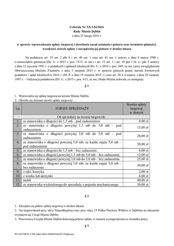 Uchwała Nr XX/124/2016 Rady Miasta Dęblin z dnia 25 lutego 2016 r. w sprawie wprowadzenia opłaty targowej i określenia zasad ustalania i poboru oraz terminów płatności, wysokości stawek opłaty i zarządzenia jej poboru w drodze inkasa Na podstawie art. 18 ust. 2 pkt 8 i art. 40 ust. 1 oraz art. 41 ust. 1 ustawy z dnia 8 marca 1990 r. o samorządzie gminnym (Dz. U. z 2015 r. poz. 1515, ze zm.) i art. 15 ust. 1 i art. 19 pkt 1 lit. a i pkt 2 ustawy z dnia 12 stycznia 1991 r. o podatkach i opłatach lokalnych (Dz. U. z 2014 r. poz. 849, ze zm.) przy uwzględnieniu Obwieszczenia Ministra Finansów z dnia 5 sierpnia 2015 r. w sprawie górnych granic stawek kwotowych podatków i opłat lokalnych w 2016 r. (M. P. z dnia 19 sierpnia 2015 r.) oraz art. 28 § 4 ustawy z dnia 29 sierpnia 1997 r. – Ordynacja podatkowa (Dz. U. z 2015 r. poz. 613, ze zm.) Rada Miasta uchwala, co następuje: §1 1. Wprowadza się opłatę targową na terenie Miasta Dęblin. 2. Określa się dzienne stawki opłaty targowej: Lp. FORMY SPRZEDAŻY Od sprzedaży na terenie targowisk: 1. ze stanowiska o długości do 1,5 mb – pod zadaszeniem 2. ze stanowiska o długości powyżej 1,5 mb do 3,0 mb – pod zadaszeniem 3. ze stanowiska o długości powyżej 3,0 mb do 5,0 mb – pod zadaszeniem 4. ze stanowiska o długości powyżej 5,0 mb, za każde zajęte 5,0 mb – pod zadaszeniem 5. ze stanowiska o długości do 1,5 mb – bez zadaszenia 6. ze stanowiska o długości powyżej 1,5 mb do 3,0 mb – bez zadaszenia 7. ze stanowiska o długości powyżej 3,0 mb do 5,0 mb – bez zadaszenia 8. ze stanowiska o długości powyżej 5,0 mb, za każde zajęte 5,0 mb – bez zadaszenia 9. z ręki, koszyka 10. z wózka lub skrzynki 11. mebli 12. ze stanowiska wydzielonego do sprzedaży z pojazdu mechanicznego Stawka opłaty targowej w złotych 8,00 zł 15,00 zł 28,00 zł 38,00 zł 6,00 zł 12,00 zł 25,00 zł 30,00 zł 2,00 zł 6,00 zł 40,00 zł 30,00 zł §2 1. Zarządza się pobór opłaty targowej w drodze inkasa. 2. Na targowiskach przy ulicy Niepodległości oraz przy ulicy 15 Pułku Piechoty Wilków w Dęblinie na inkasenta wyznacza się Urząd Miasta Dęblin. 3. Pracownicy Urzędu Miasta Dęblin dokonują poboru opłaty w ramach wynagrodzeniaze stosunku pracy. §3 ID: b457db7b-1788-4deb-abb3-b90bb568e4f7.Podpisany Traci moc uchwała Nr XIX/120/2016 Rady Miasta Dęblin z dnia 29 stycznia 2016 r. w sprawie wprowadzenia opłaty targowej i określenia zasad ustalania i poboru oraz terminów płatności, wysokości stawek opłaty i zarządzenia jej poboru w drodze inkasa. §4 Wykonanieuchwały powierza się Burmistrzowi Miasta Dęblin. §5 Uchwała wchodzi w życie po upływie 14 dni od dnia ogłoszenia w Dzienniku Urzędowym Województwa Lubelskiego, nie wcześniej jednak niż z dniem 1 kwietnia 2016 roku. Przewodniczący Waldemar Chochowski ID: b457db7b-1788-4deb-abb3-b90bb568e4f7.Podpisany